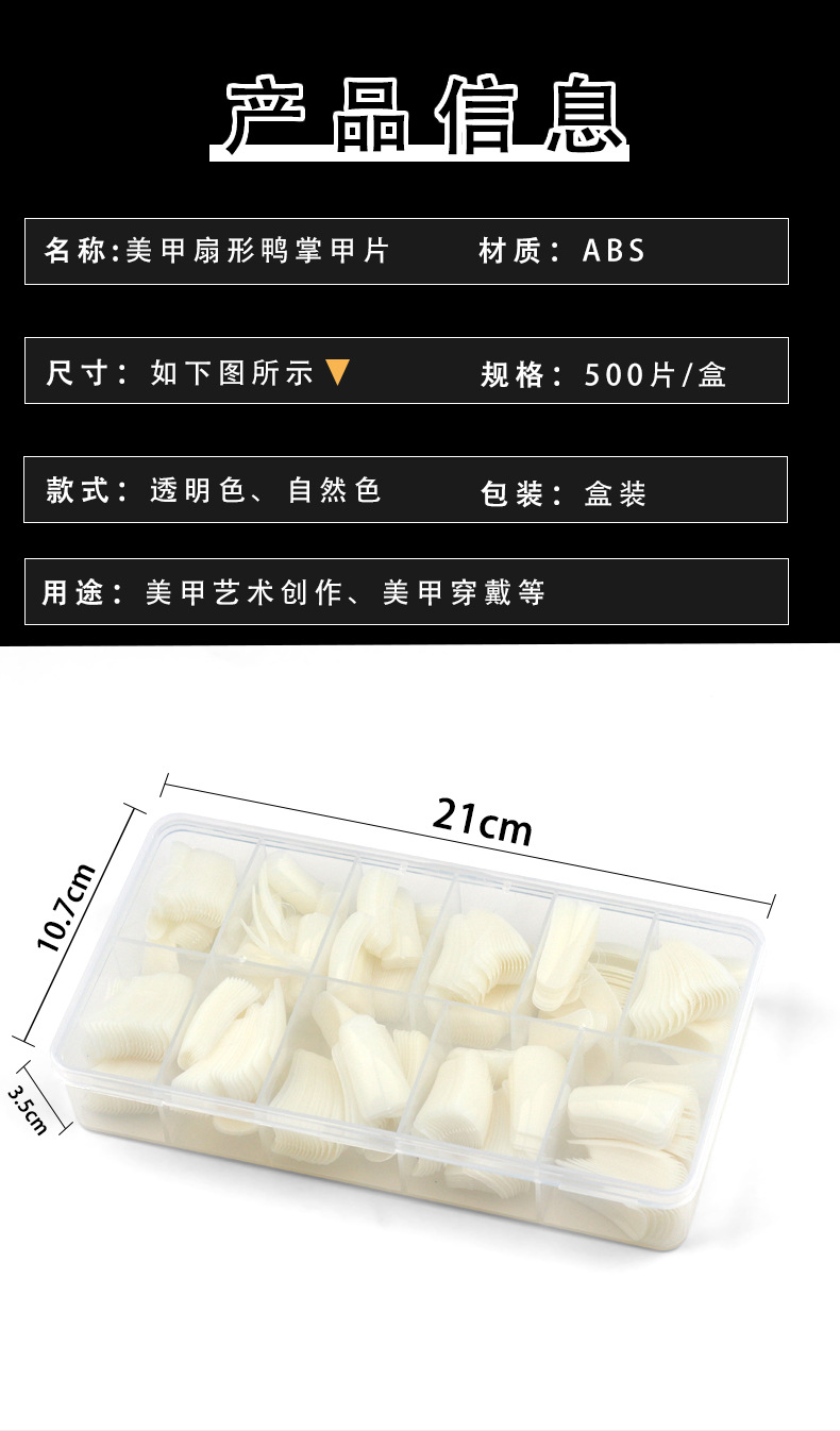 Ventas transfronterizas en caliente 500 piezas nuevas piezas de uñas de boca de pato, piezas de uñas en forma de abanico calientes en Europa y América.