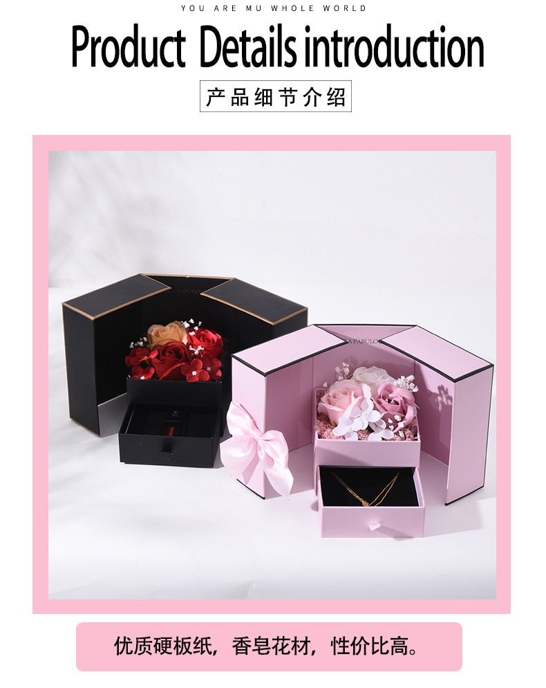 | Colores | Flor de jabón de caja de regalo rosa,Flor de jabón de caja de regalo negra,Caja de regalo rosa Bolsa de regalo de flor de jabón,Bolsa de regalo de flor de jabón de caja de regalo negra |