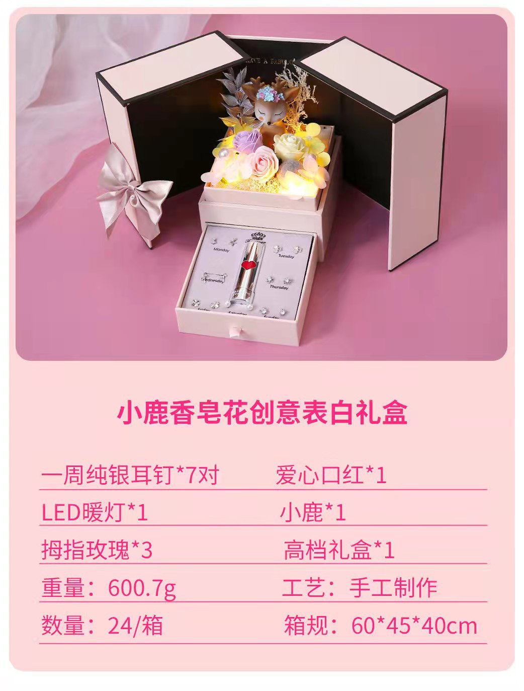 | Color | Nueva caja de regalo de ciervos de plumas con luz (sin collar),Ciervo caja de regalo Sin pluma con luz (sin pendientes de lápiz labial),Caja de regalo de flor de jabón de clavel con lámpara de fondo (sin collar),Caja de regalo de flor de jabón rosa con luz de amor (sin collar),Pendientes de una semana + lápiz labial en forma de corazón |
