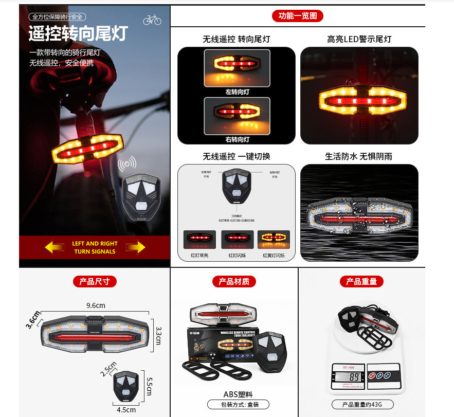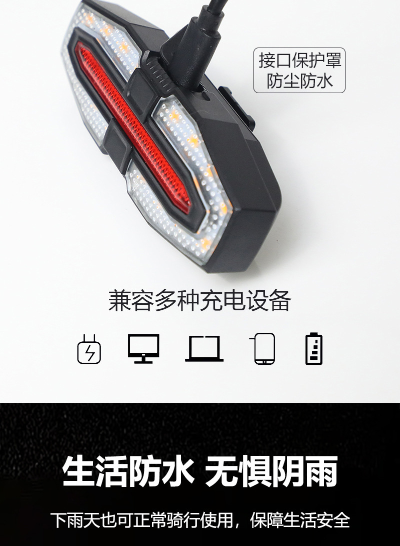 Bicicleta transfronteriza señal de giro de control remoto inalámbrico con altavoz, carga USB, conducción nocturna, luz trasera de dirección izquierda y derecha