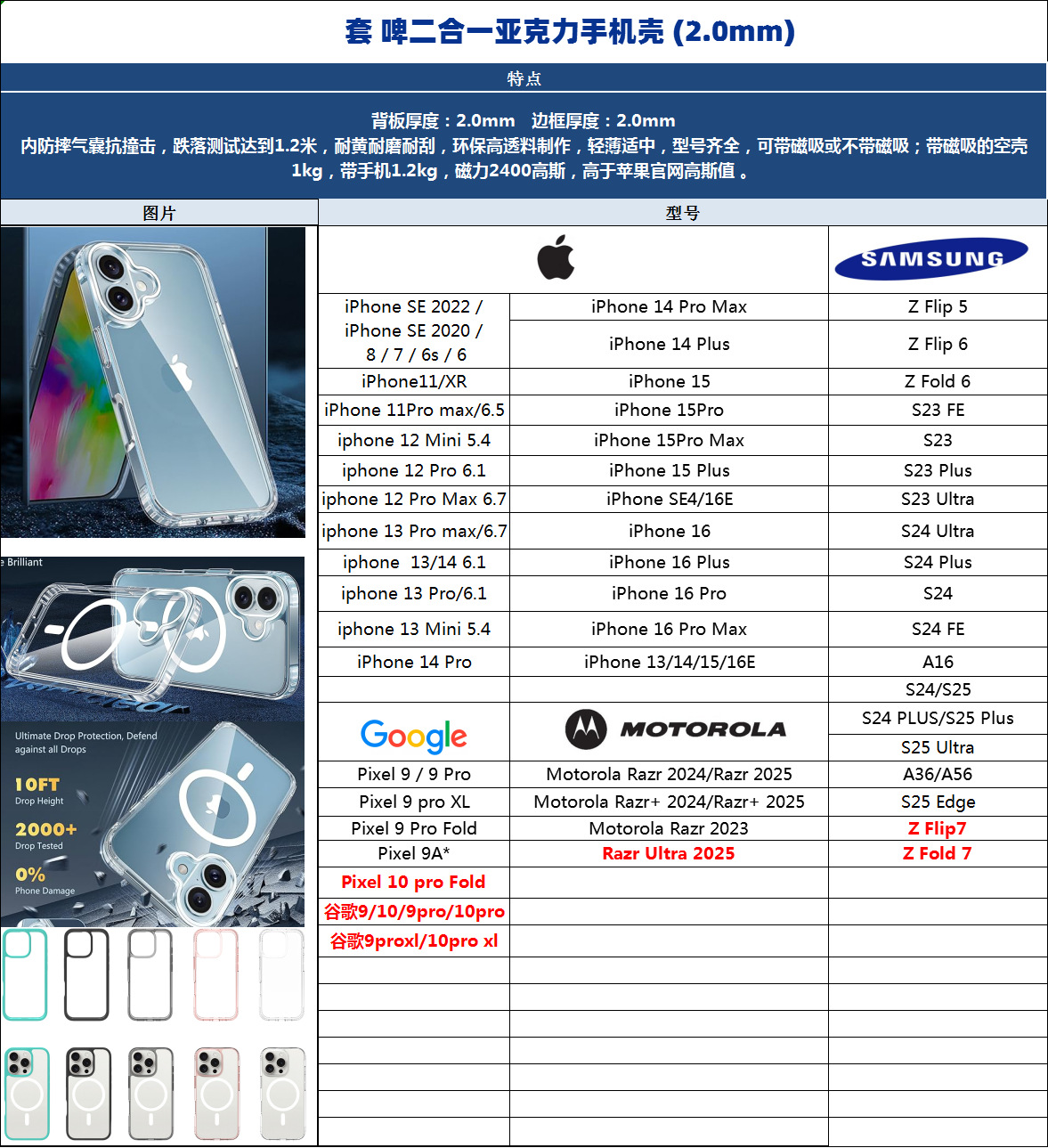 MOQ50 para iPhone16plus Apple 15 2 en 1 funda transparente para teléfono móvil estela 2.0mm antiarañazos