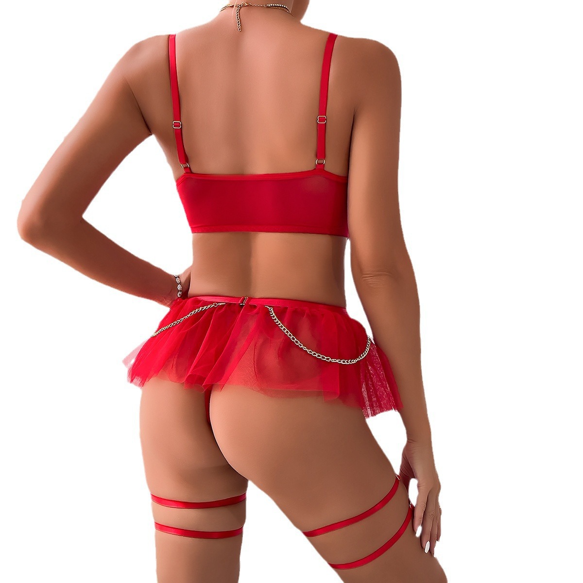 Comercio exterior transfronterizo lencería sexy encaje rojo cadena de metal perspectiva malla falda corta traje sexy