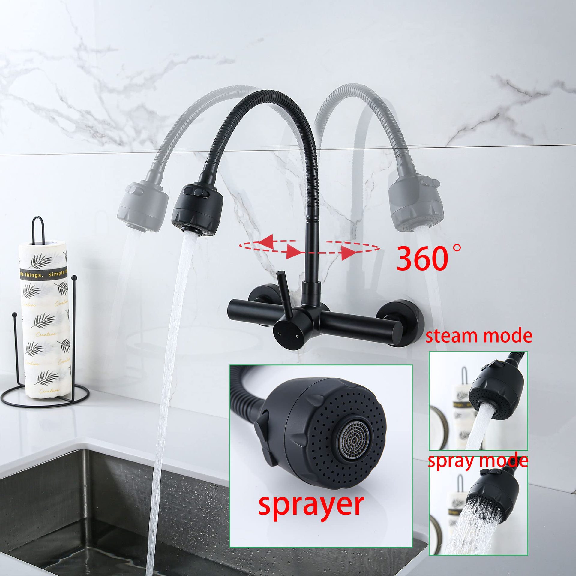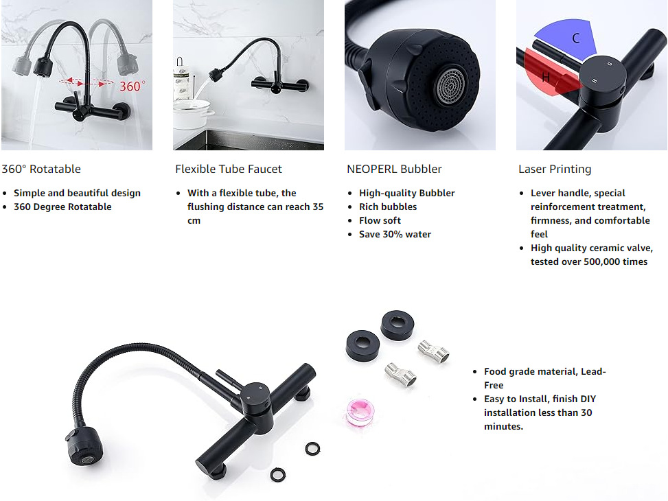 Grifo de cocina de pared de acero inoxidable 304, fregona, lavabo, lavabo, lavabo, lavabo, grifo de agua caliente y fría universal negro