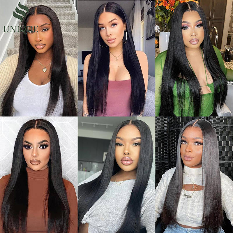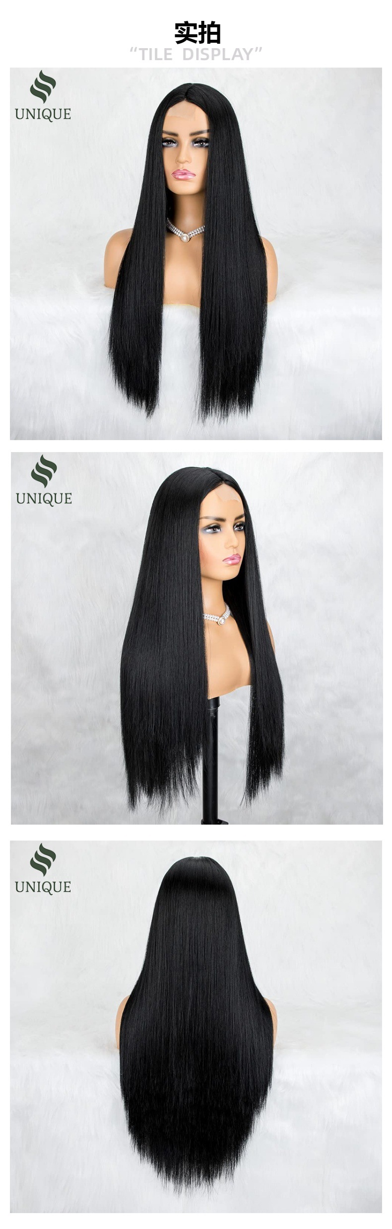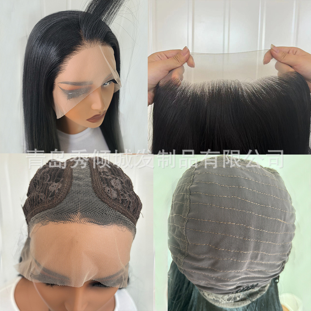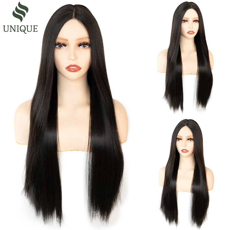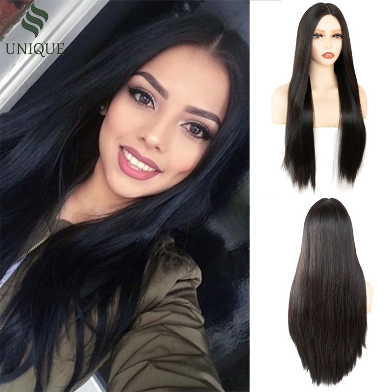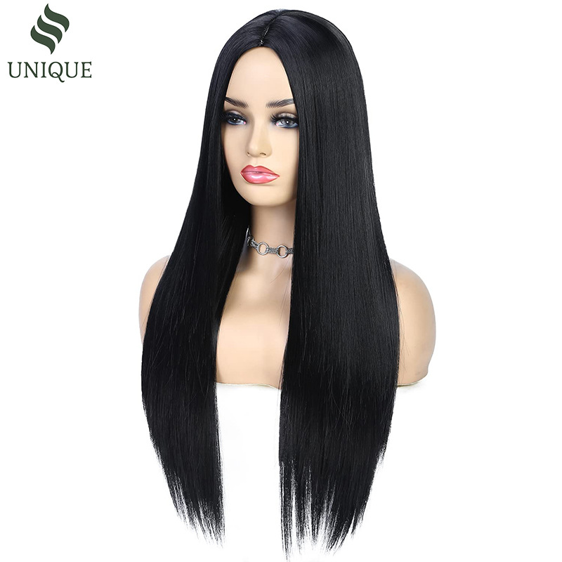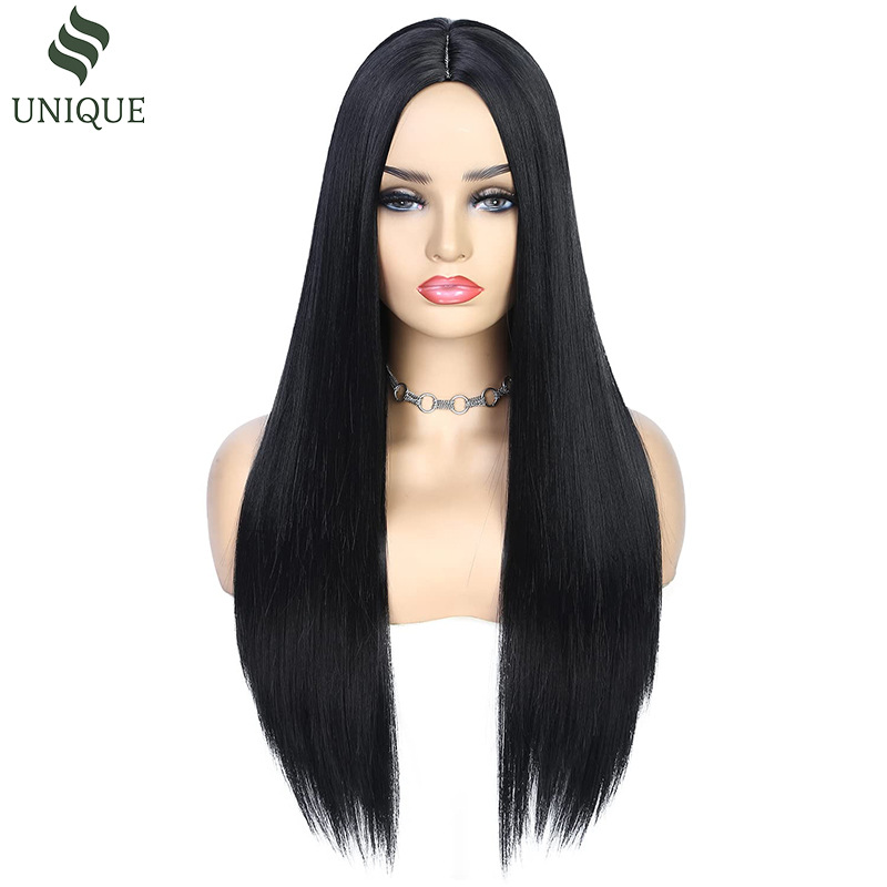 Peluca transfronteriza, pelo largo y liso negro natural, conjunto de cabello completo de encaje frontal con raya media, peluca cos de seda de alta temperatura para exportación
