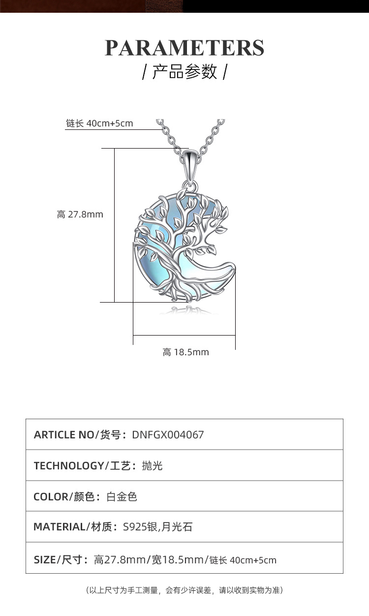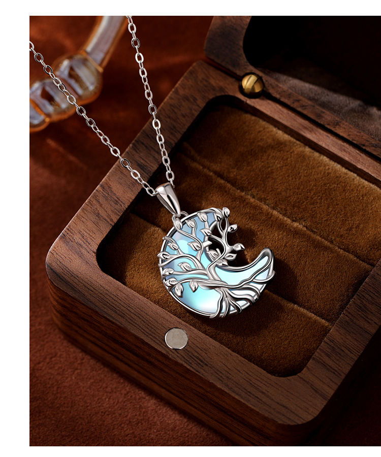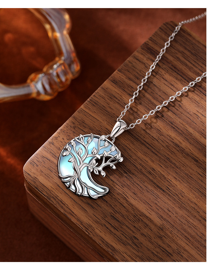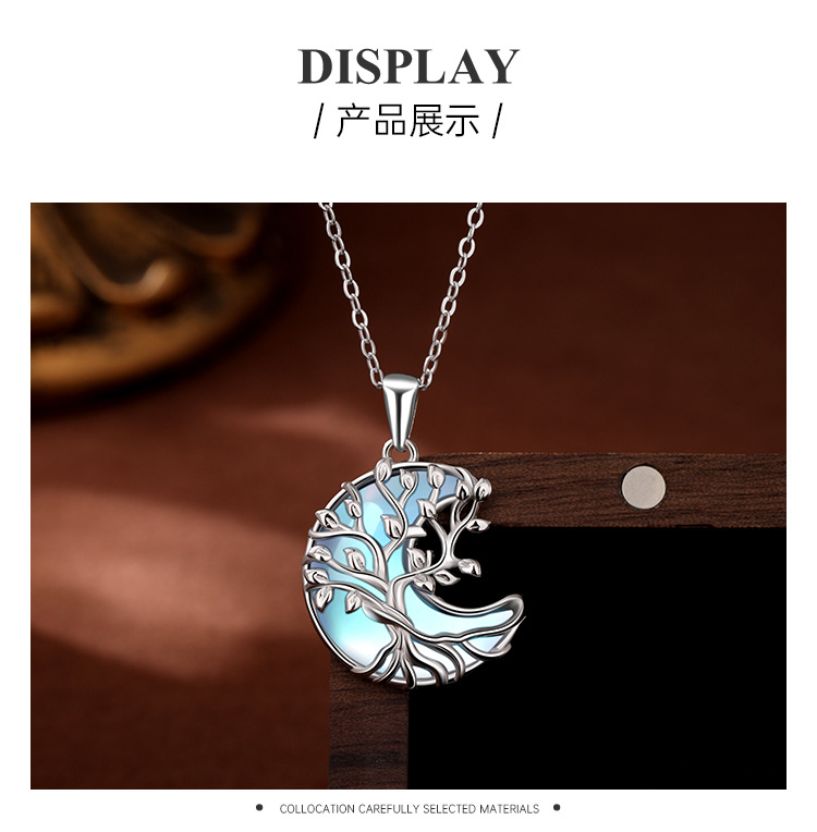 TEMU Cross-border S925 Colgante de luna de piedra lunar de plata esterlina Collar de árbol de vida de alta calidad de lujo ligero europeo y americano Mujer