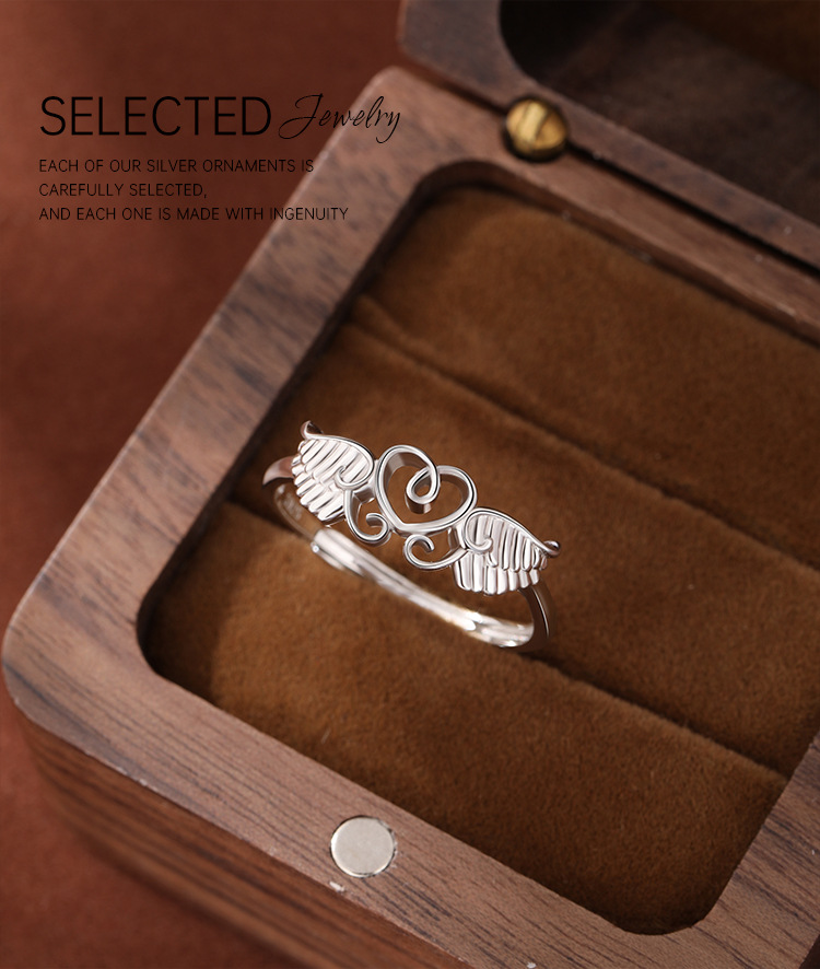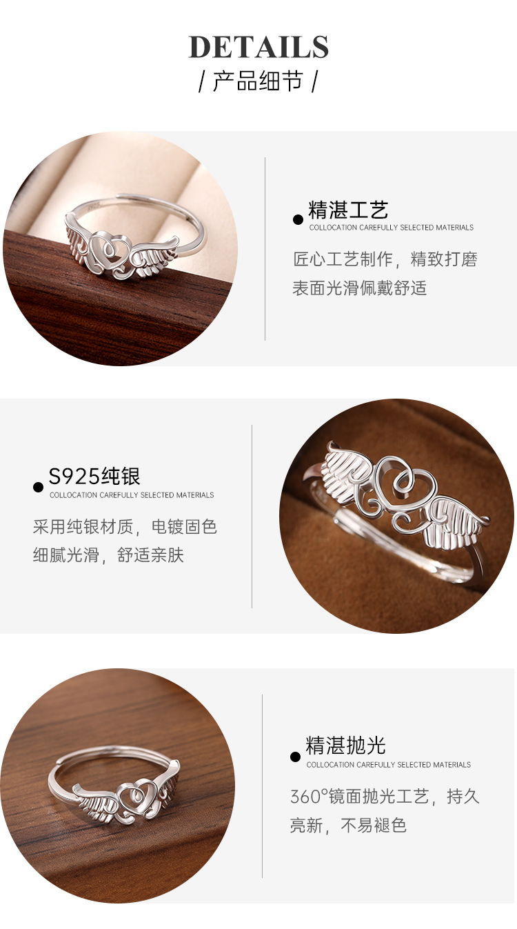TEMU transfronterizo nuevo anillo de ala de ángel de plata esterlina 925 con forma de corazón abierto para mujeres anillo ajustable joyas retro