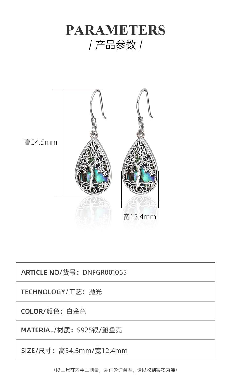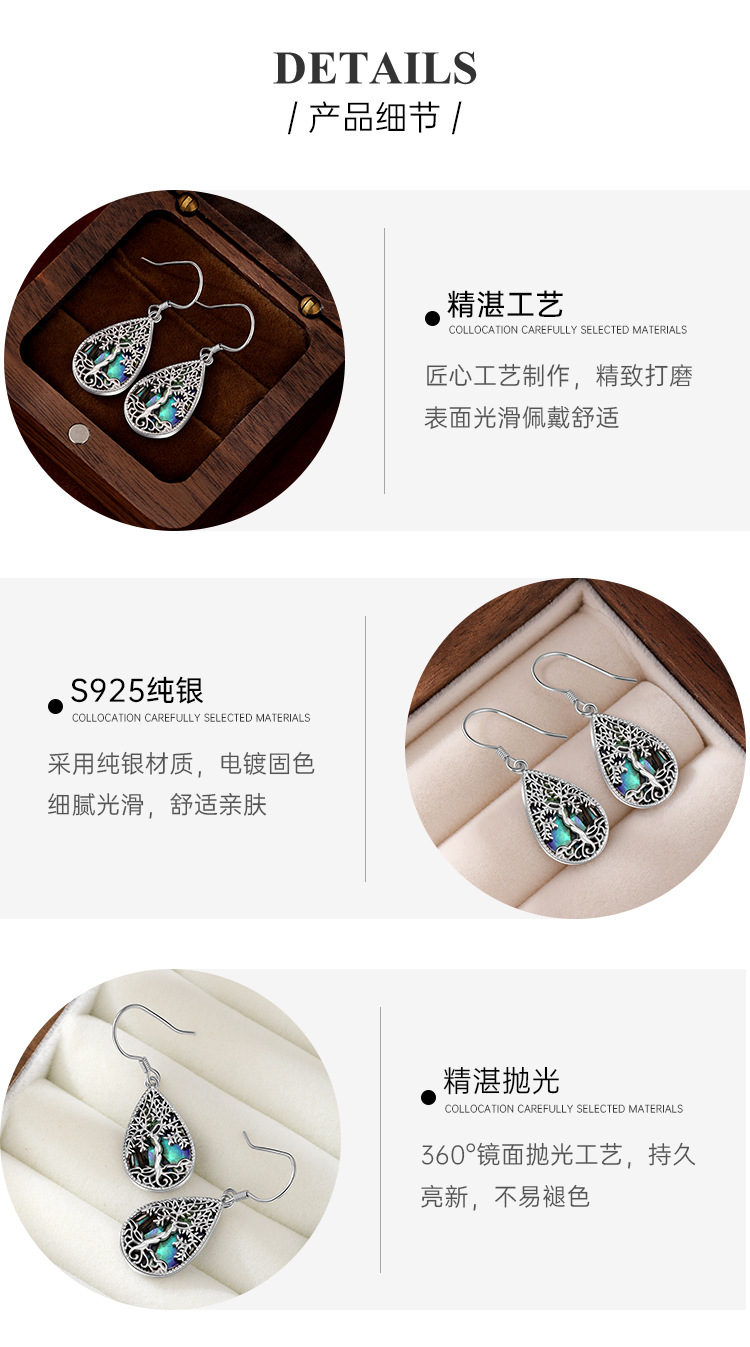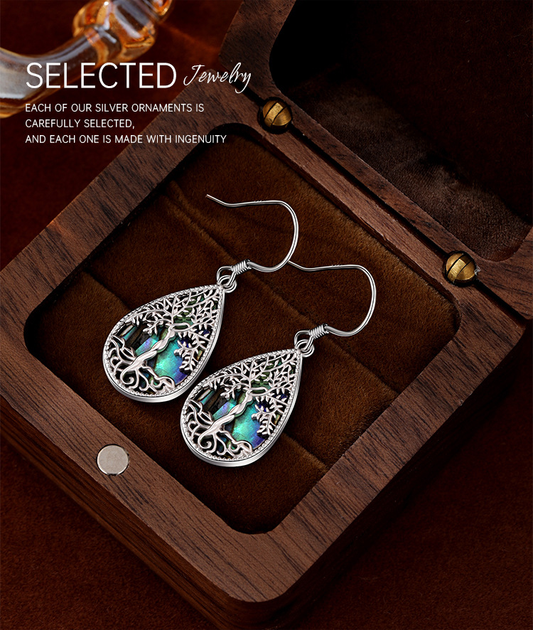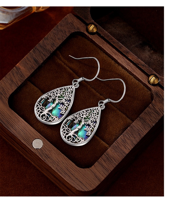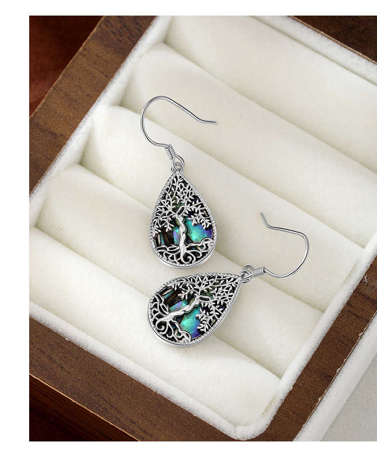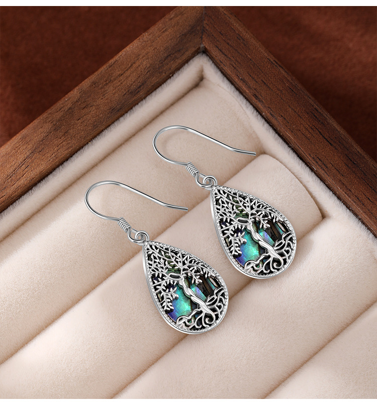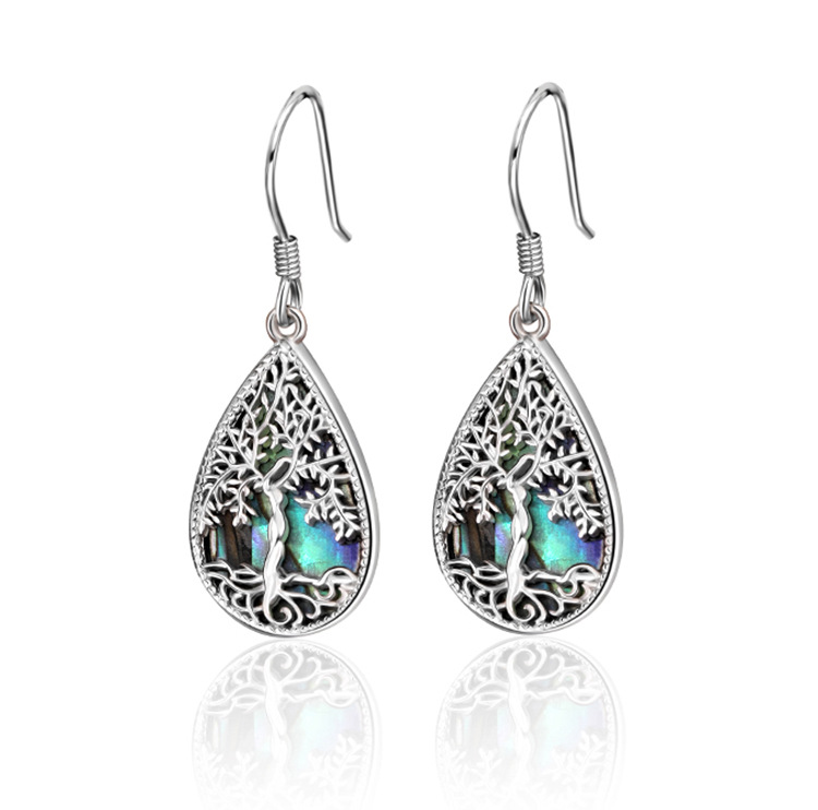 Pendientes de árbol de la vida de plata de ley 925 transfronterizos europeos y americanos Pendientes de lujo ligero femenino Pendientes en forma de gota de concha de abulón de alta calidad