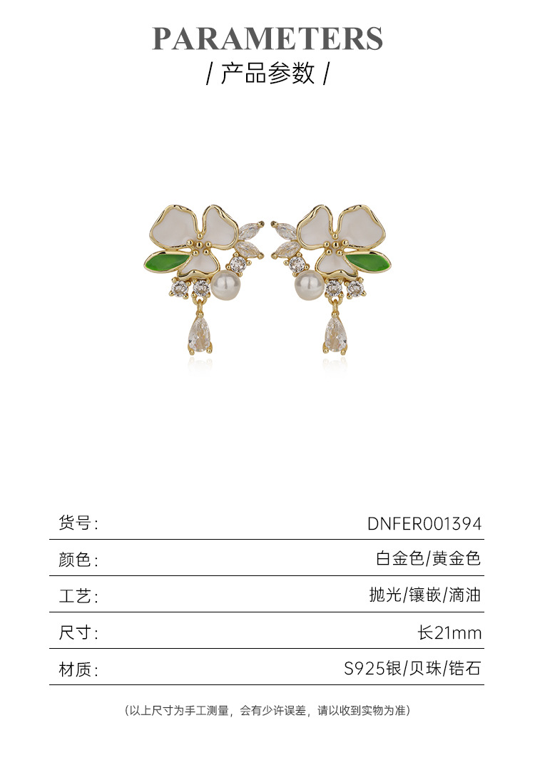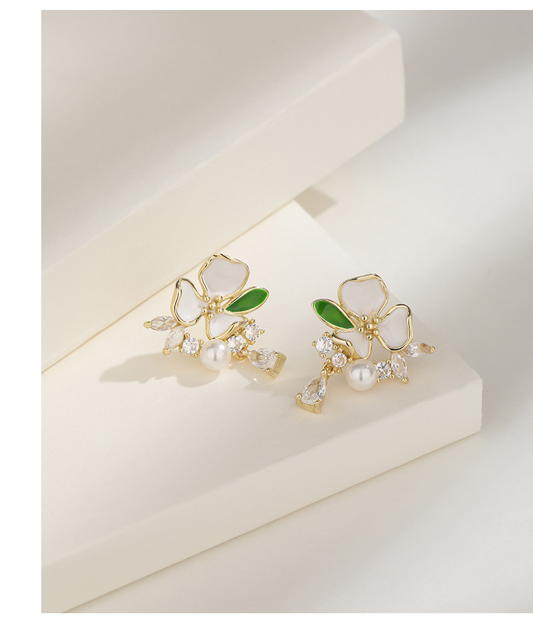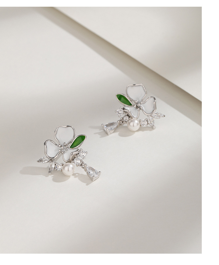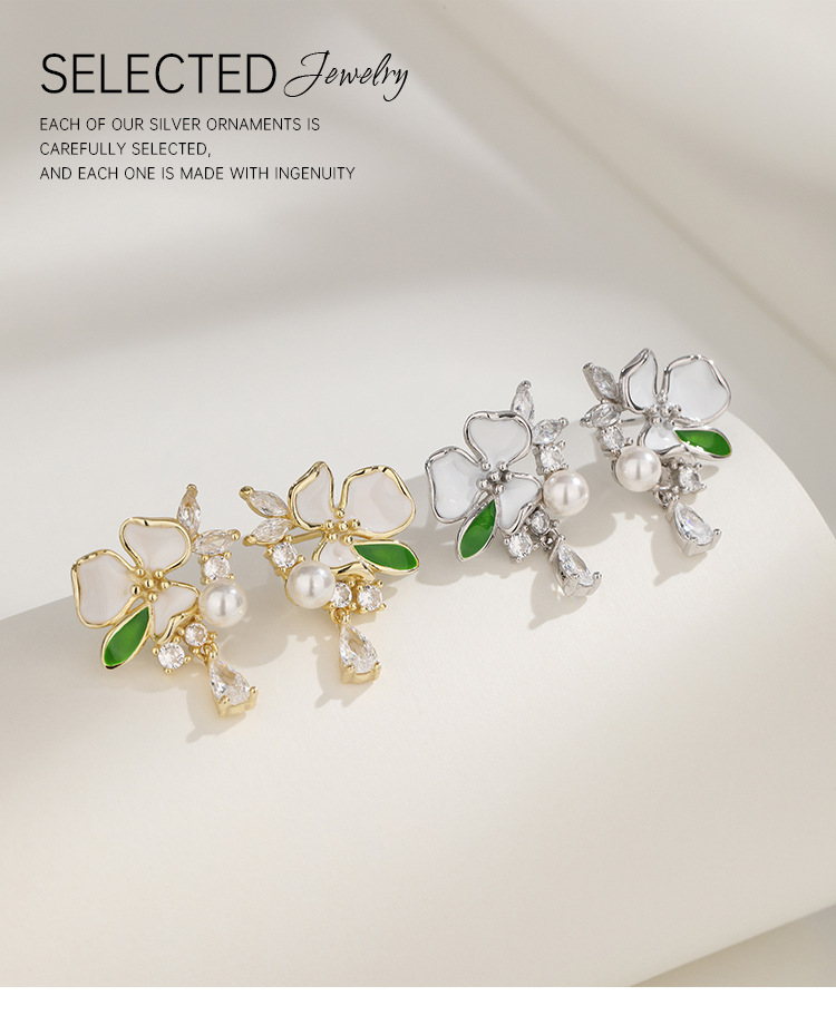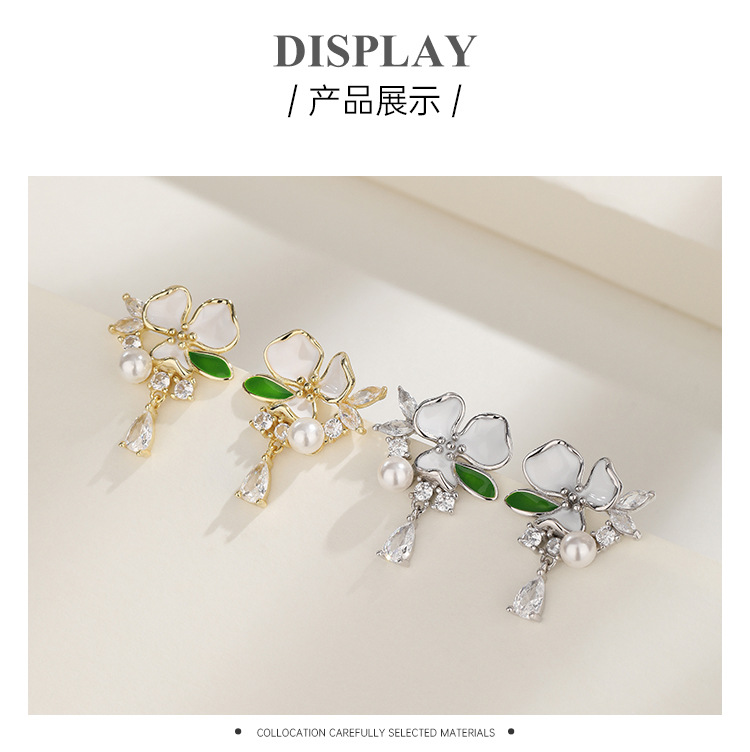 S925 plata esterlina Camelia perla Stud pendientes hembra gota de aceite circón pendientes de flores nicho temperamento pendientes de alta calidad