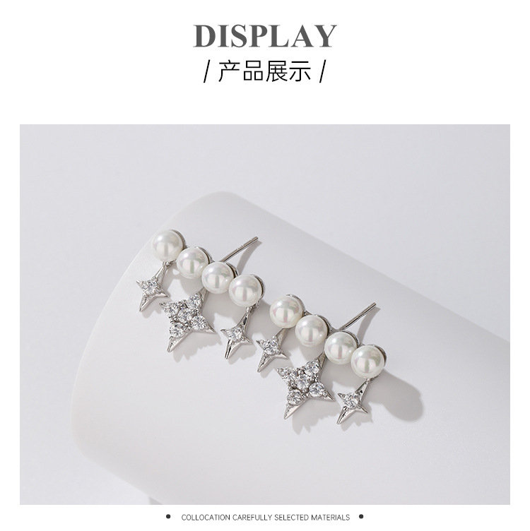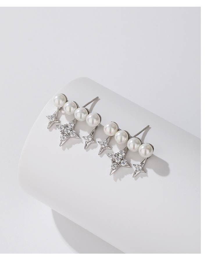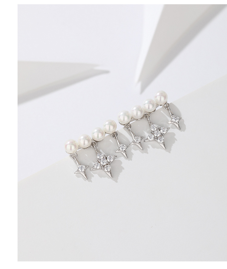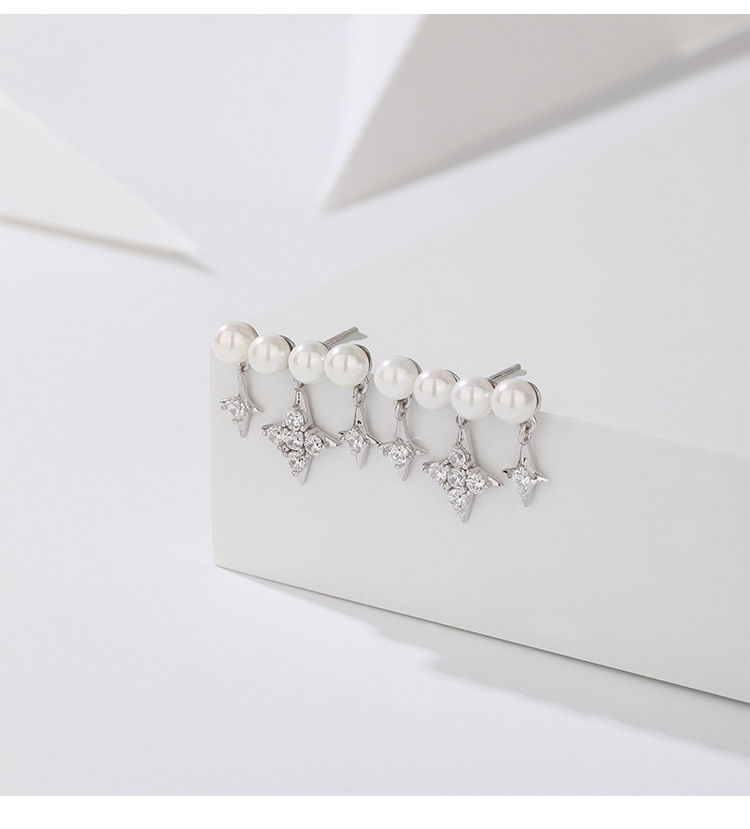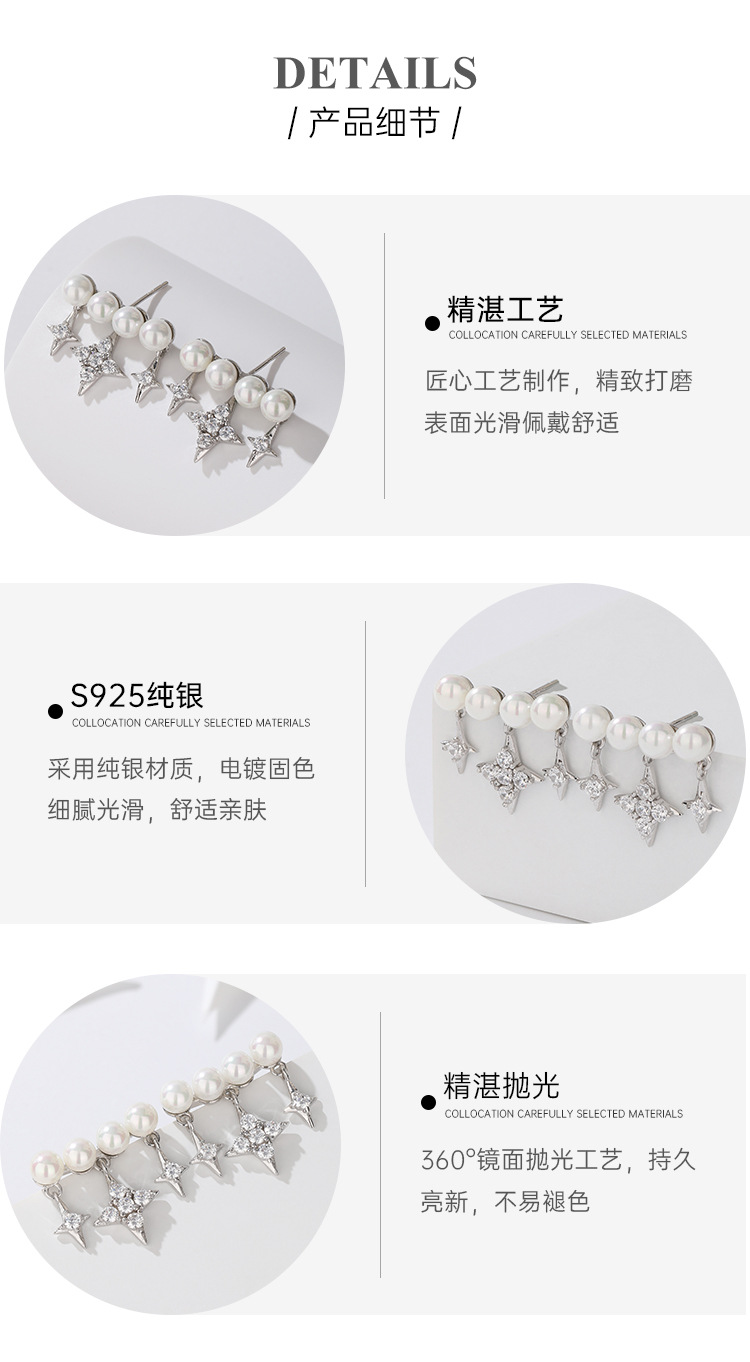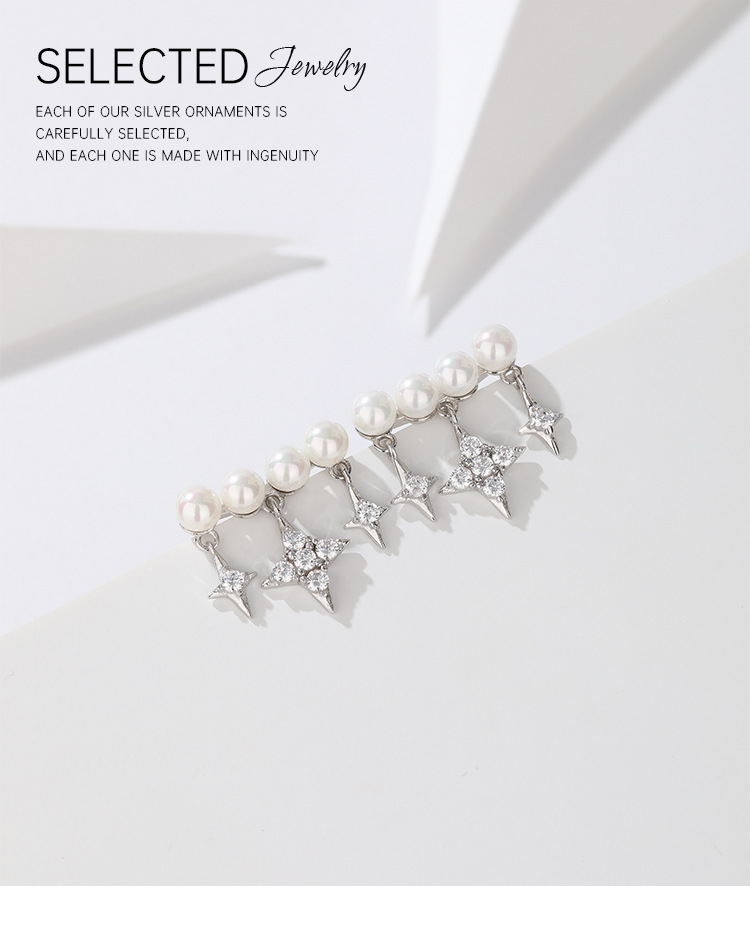 925 pendientes de perlas de plata esterlina Luz de lujo de alto grado de la vendimia borla diamante completo cuatro Awn estrella pendientes nicho de la joyería del oído