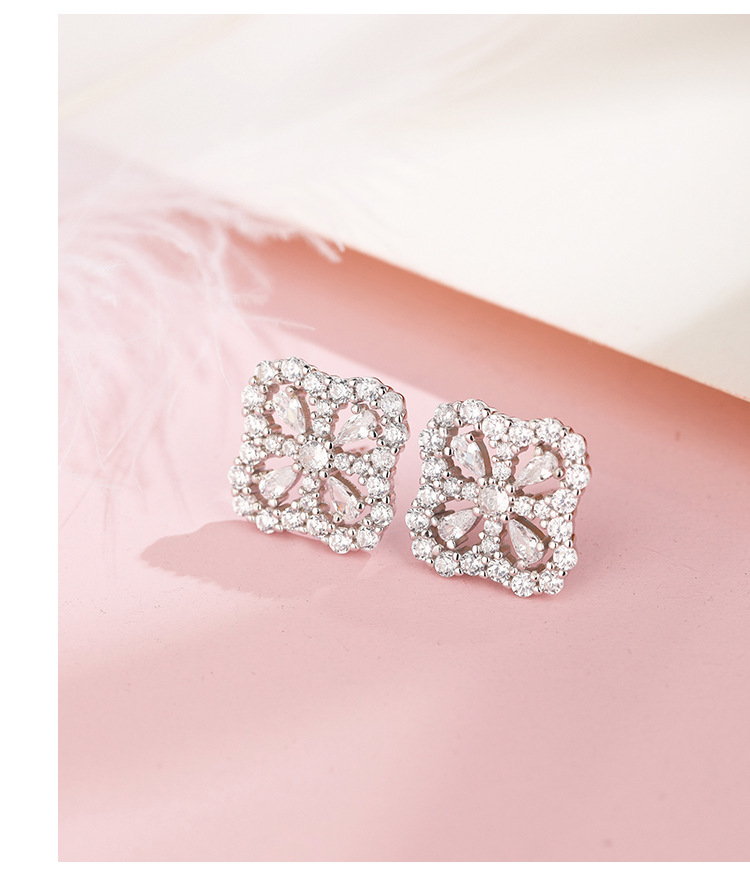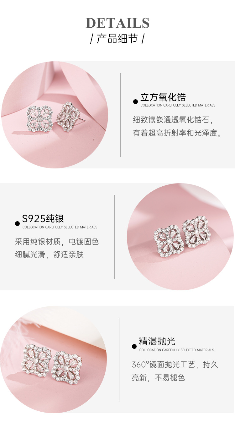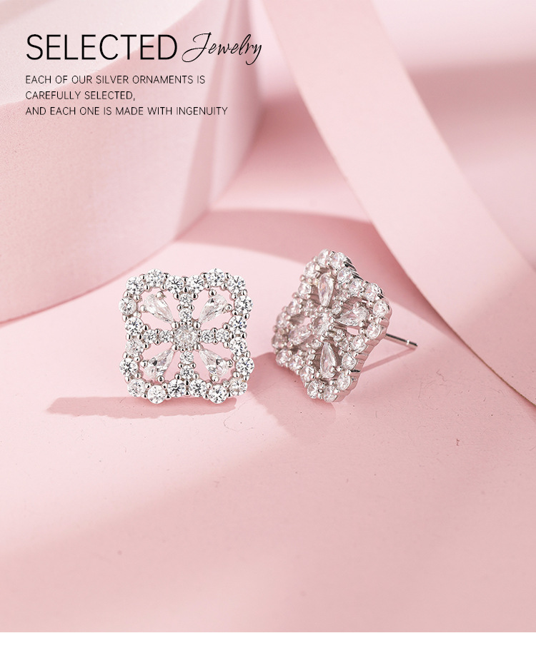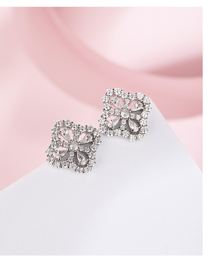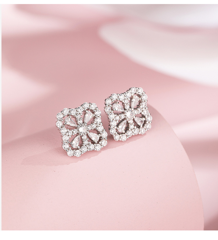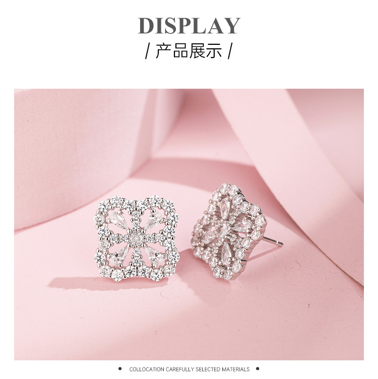 Pendientes de trébol de diamante completo para las mujeres 925 plata esterlina Luz de lujo de alto grado nicho diseño elegante pendientes de flores