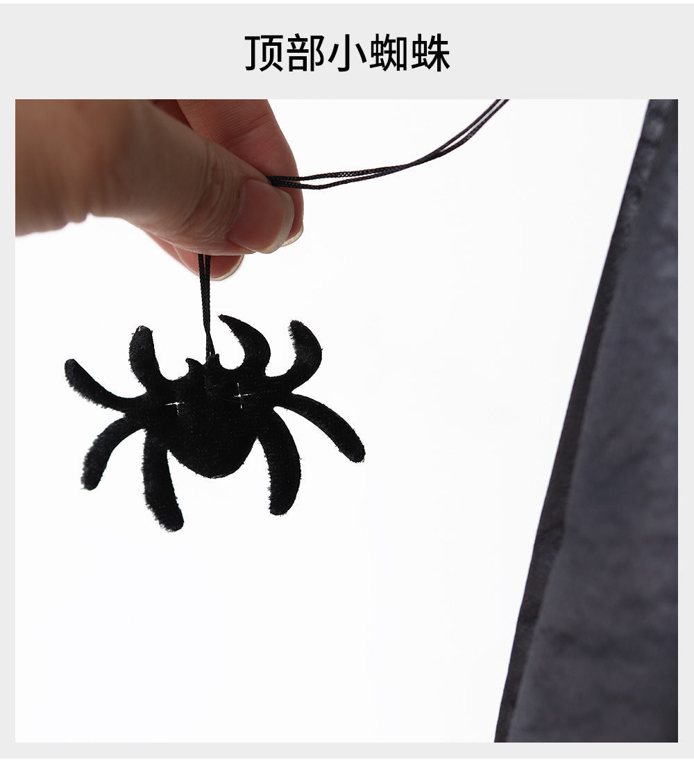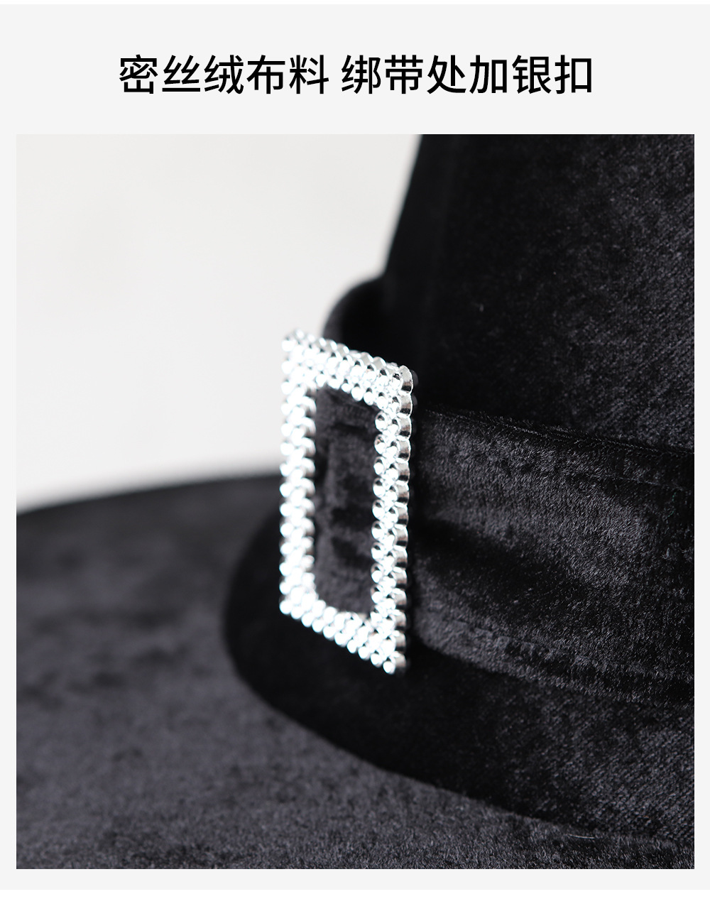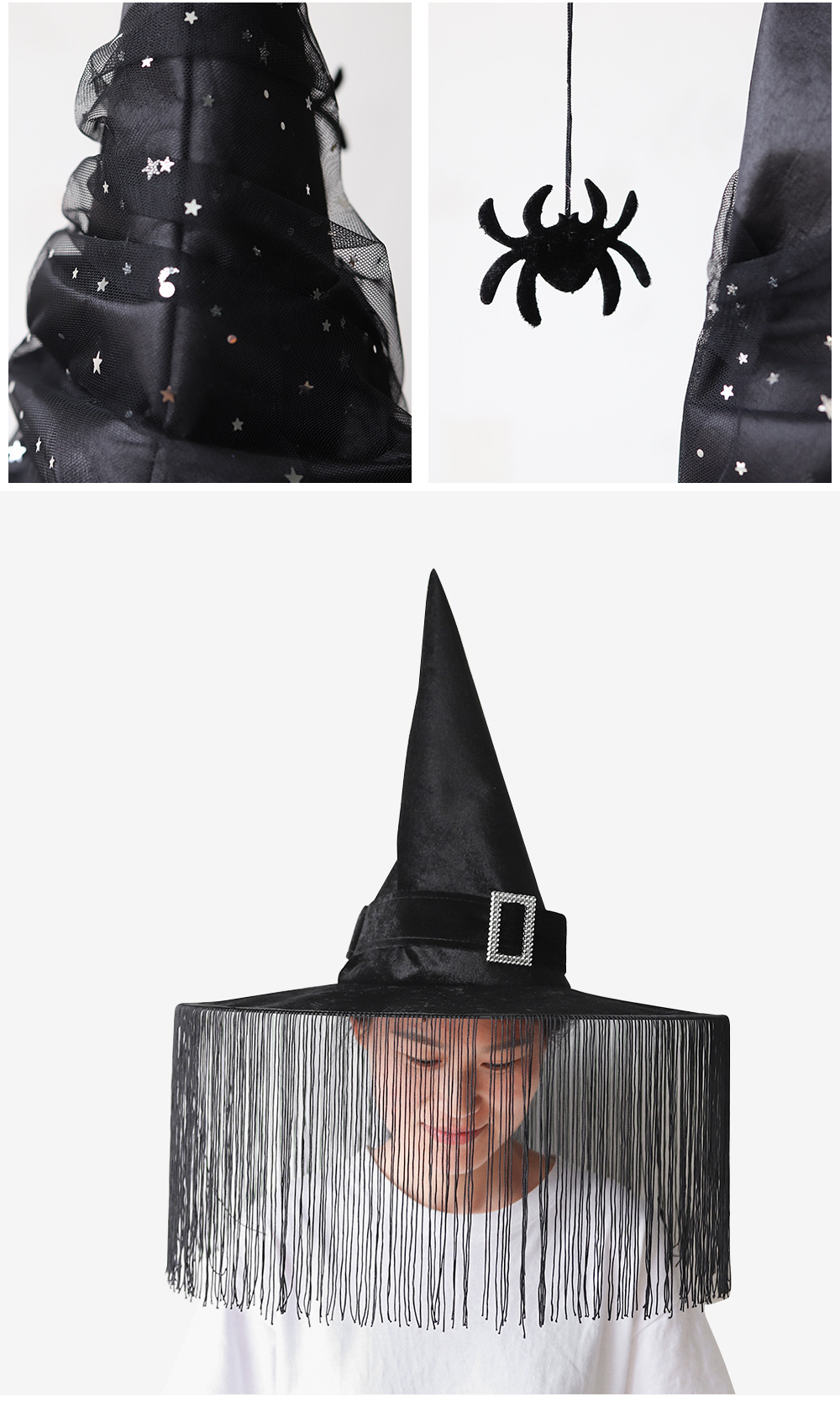 | Color | Sombrero de borla de terciopelo denso, tela de terciopelo negro plisada, tela de terciopelo negro plisada más araña, tela de terciopelo negro plisada más araña más hilo de lentejuelas |