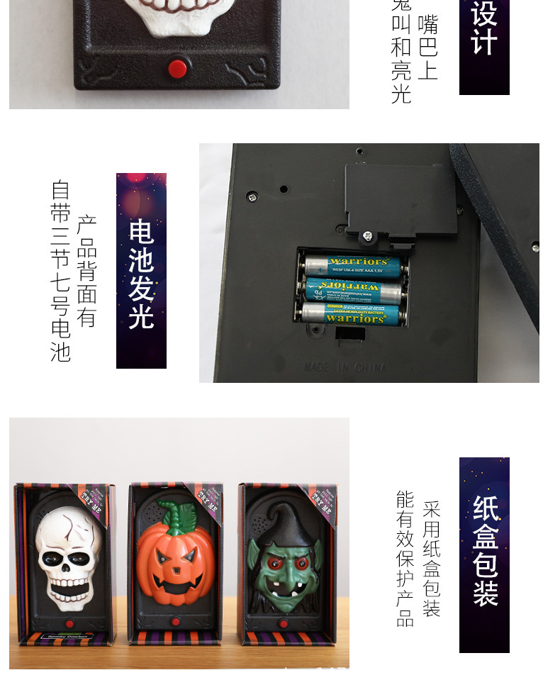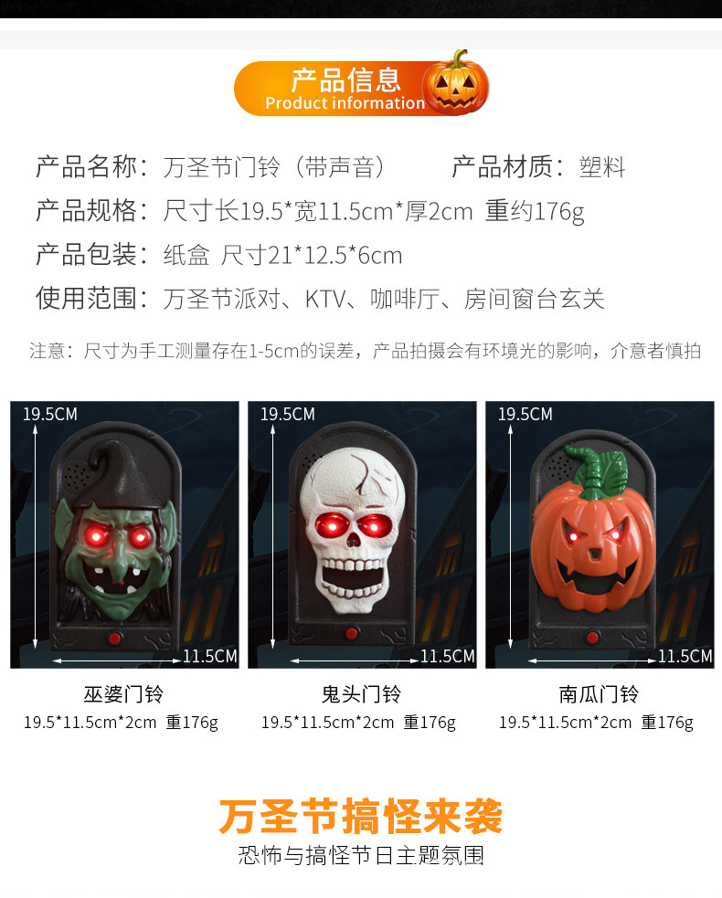 | Colores | Timbre de cabeza fantasma de Halloween,Campana de calabaza de Halloween,Timbre de bruja de Halloween |