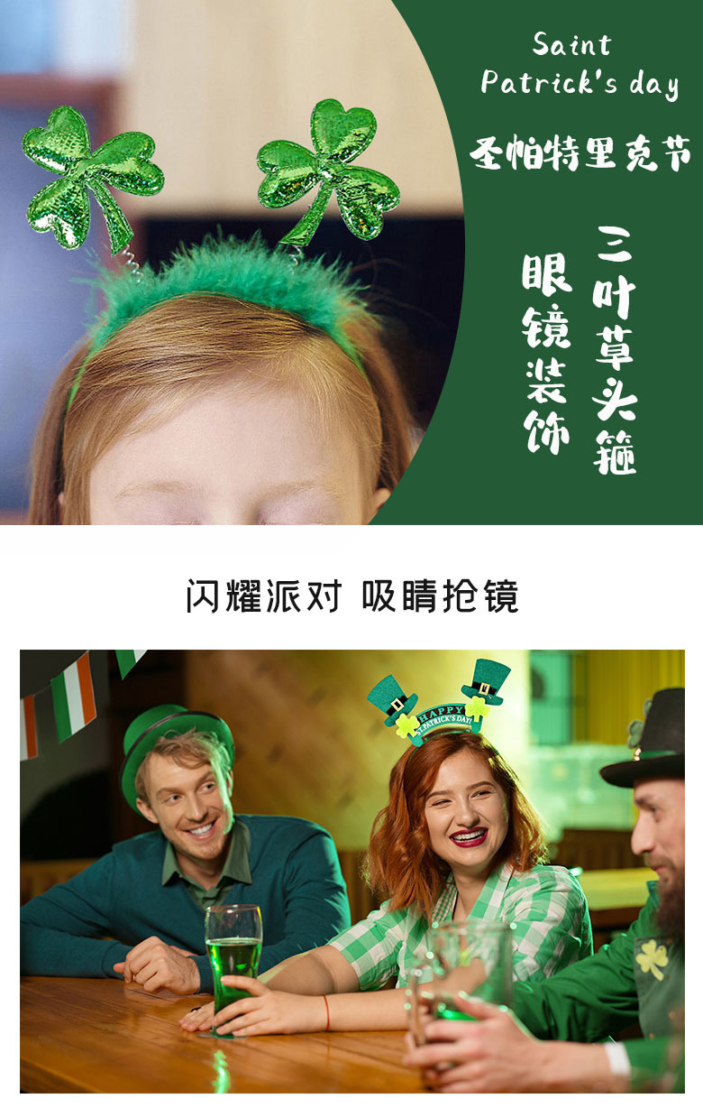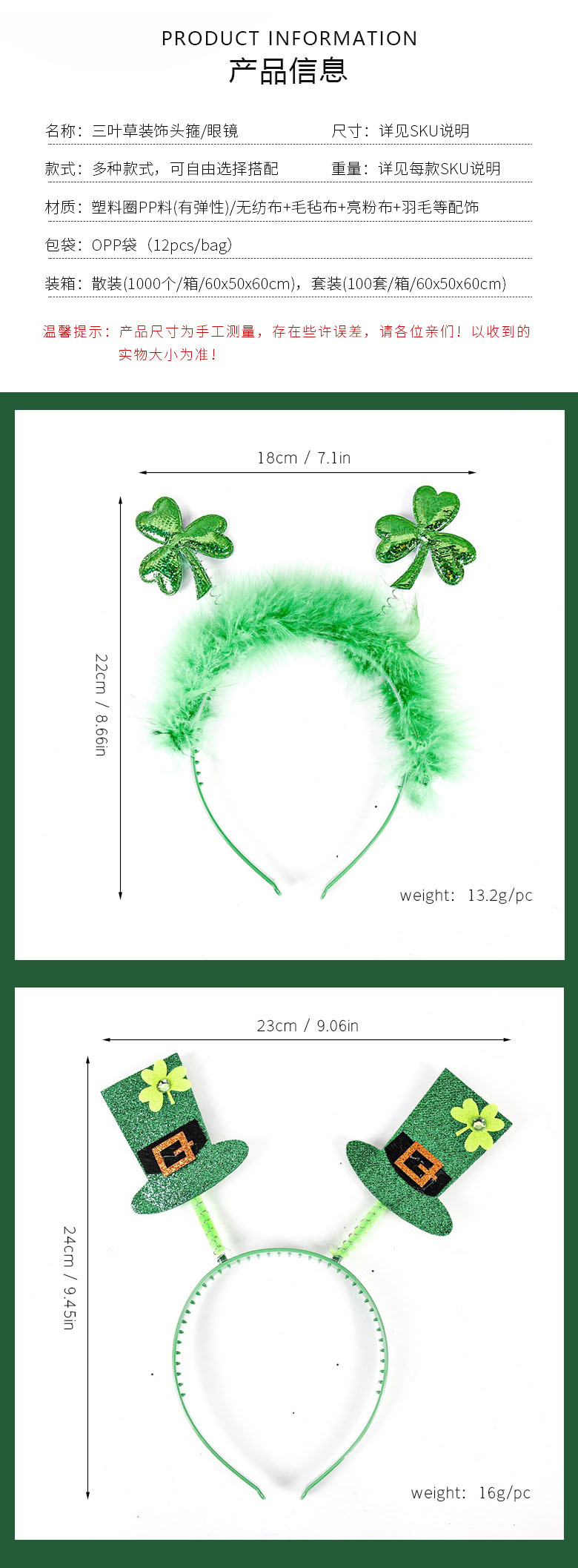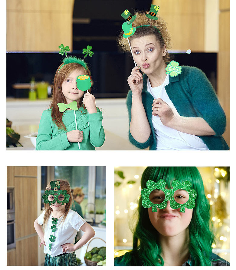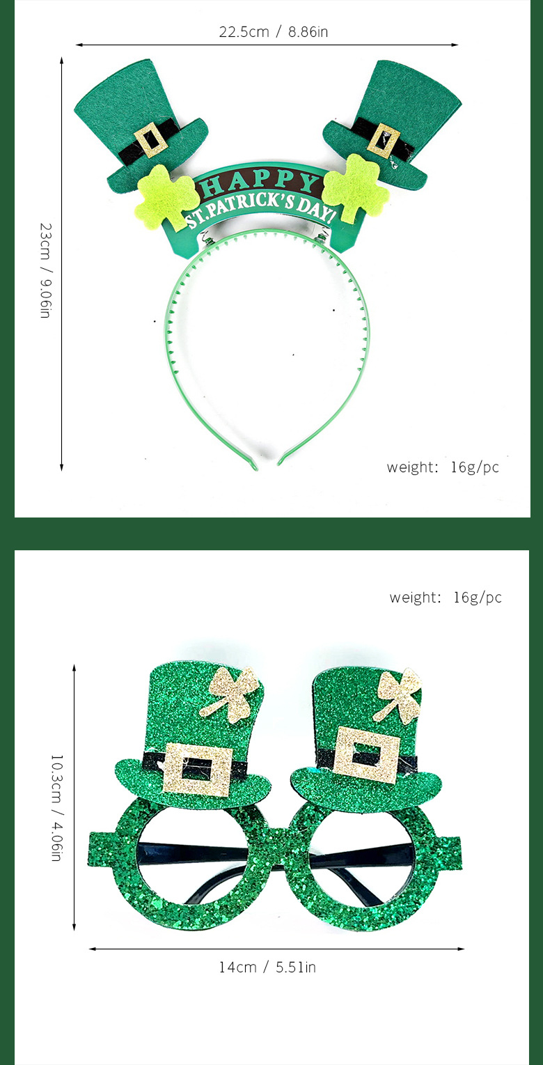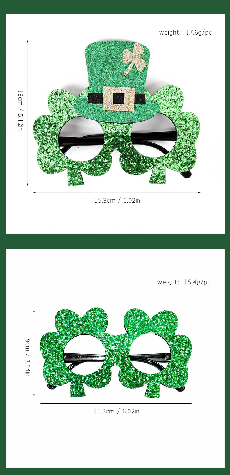 | Color | Gafas decoradas con trébol, gafas decoradas con Trébol de un solo sombrero, gafas decoradas con Trébol de dos sombreros, gafas decoradas con Trébol de Edición neta, gafas decoradas con Happy slpats, gafas decoradas con letras de San pablo, aro de Trébol de plumas, aro de Trébol de sombrero, aro de Trébol de letras de sombrero |