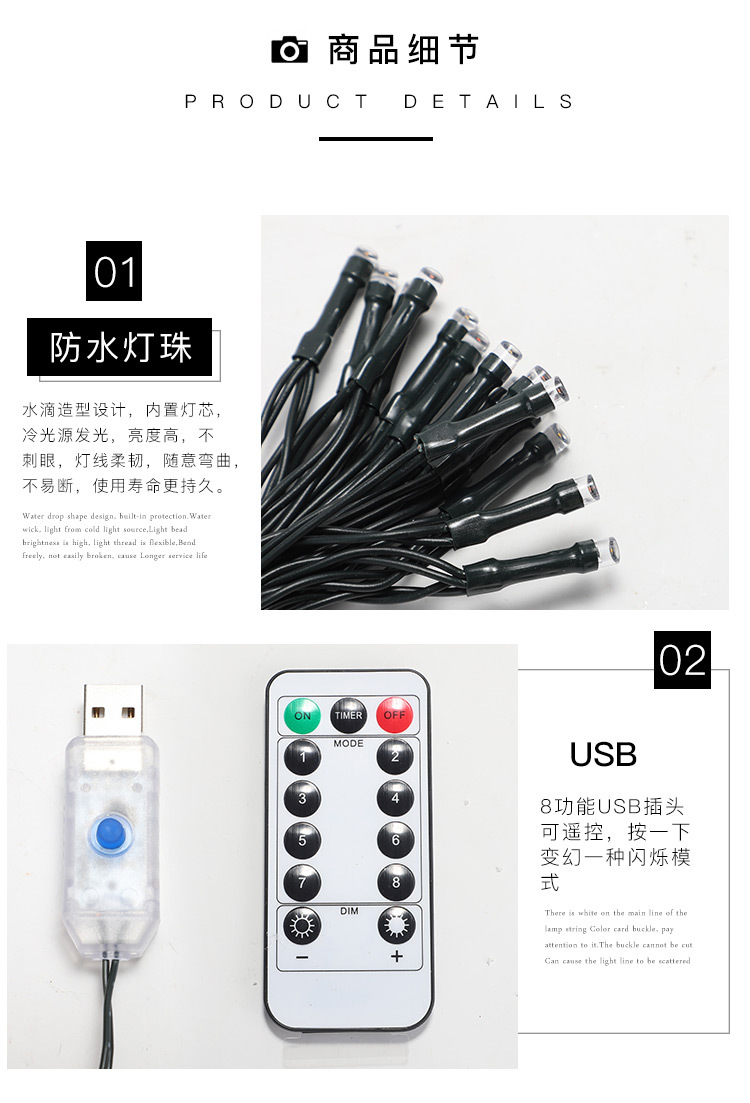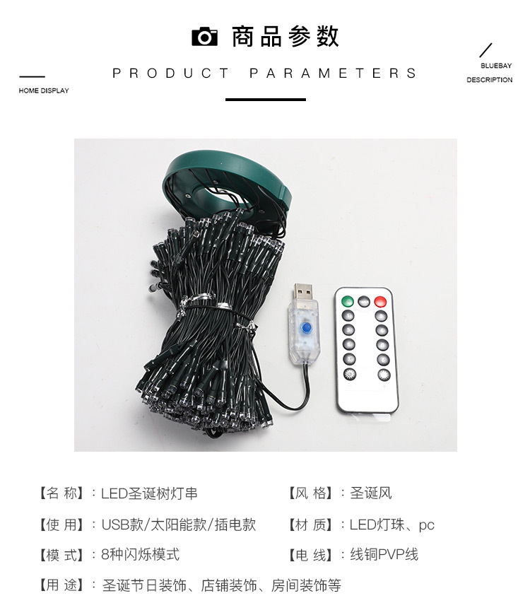 | Color de la luz | Color - modelo USB (con control remoto), color cálido - modelo USB (con control remoto), color - enchufe de regulación de belleza de baja tensión, color cálido - enchufe de regulación de belleza de baja tensión, color - control remoto solar + carga usb, color cálido - control remoto solar + carga USB |