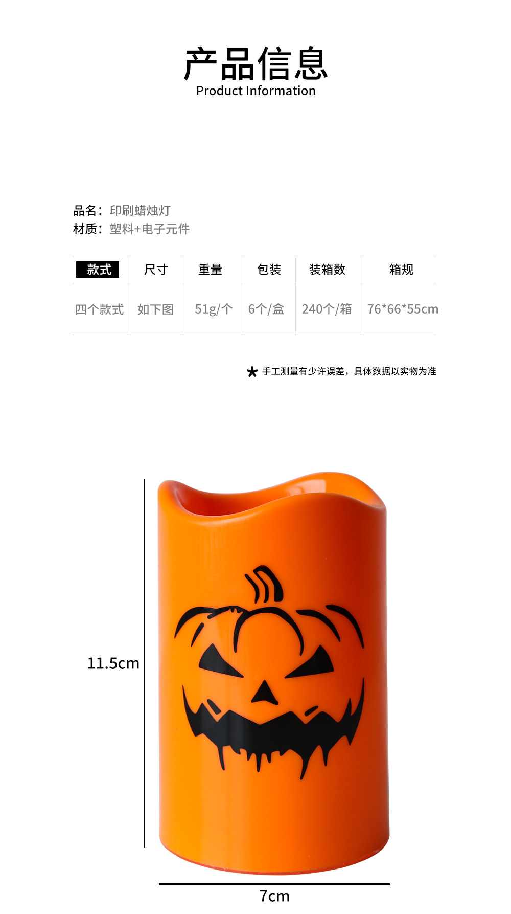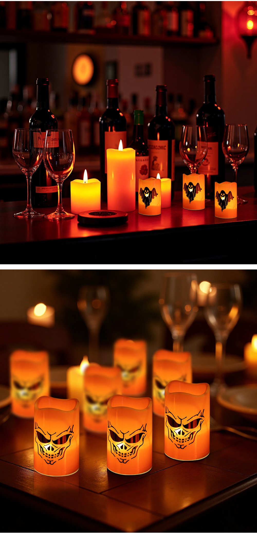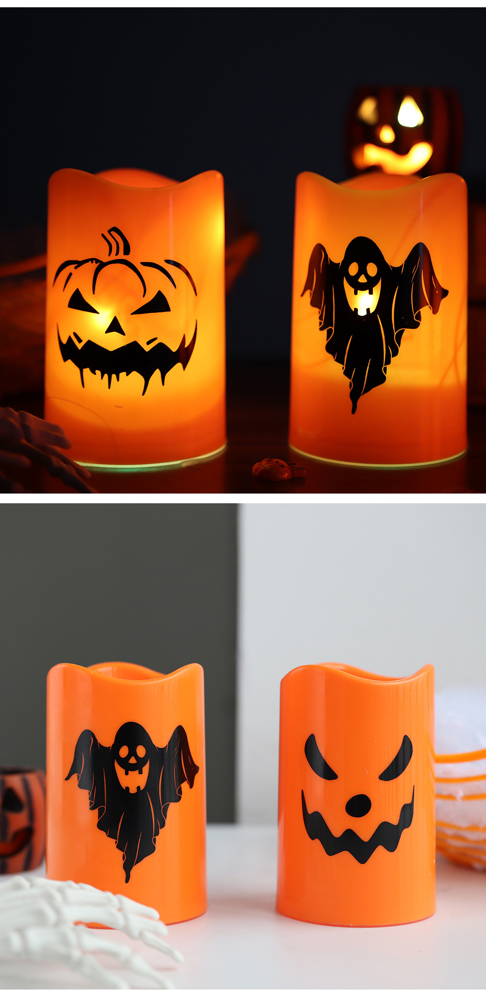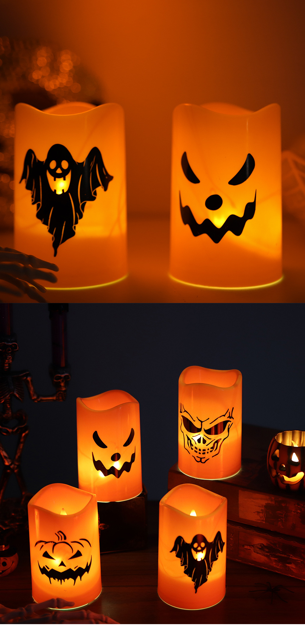 | Color | Candela de patrón de calabaza, vela de patrón de cráneo |