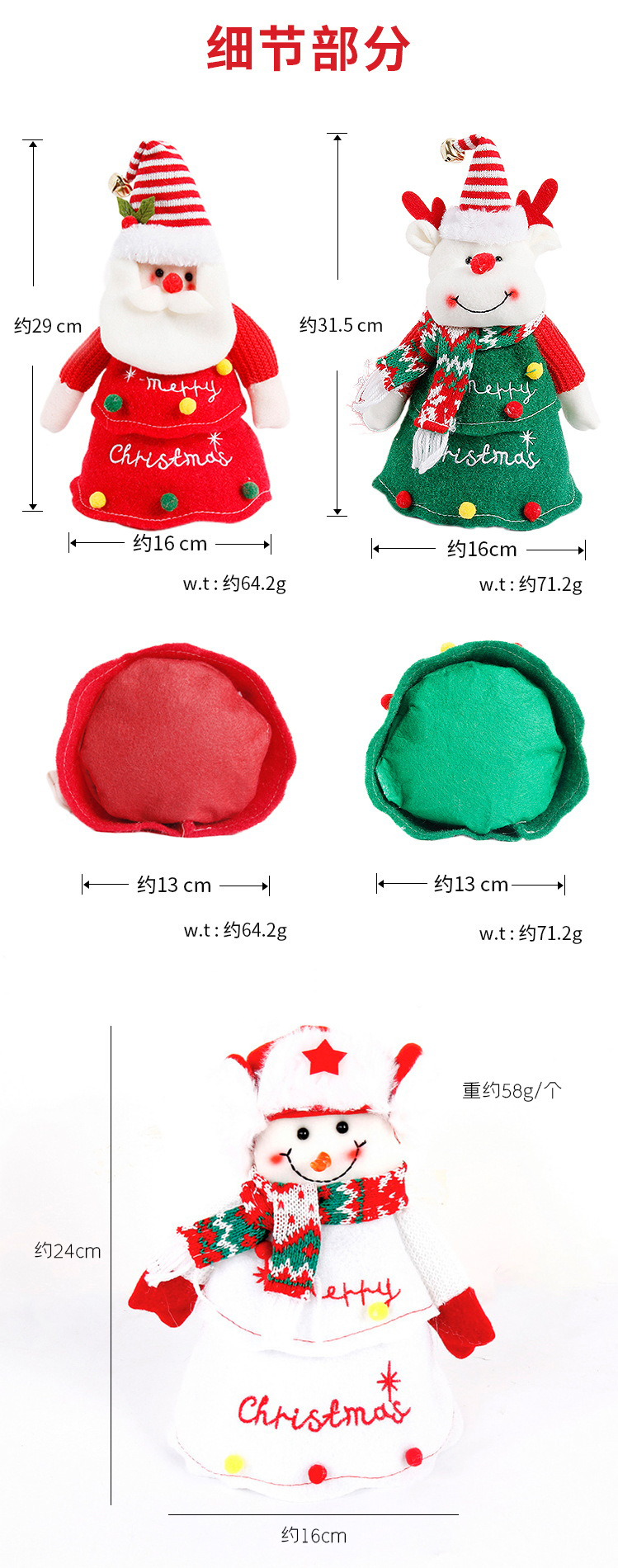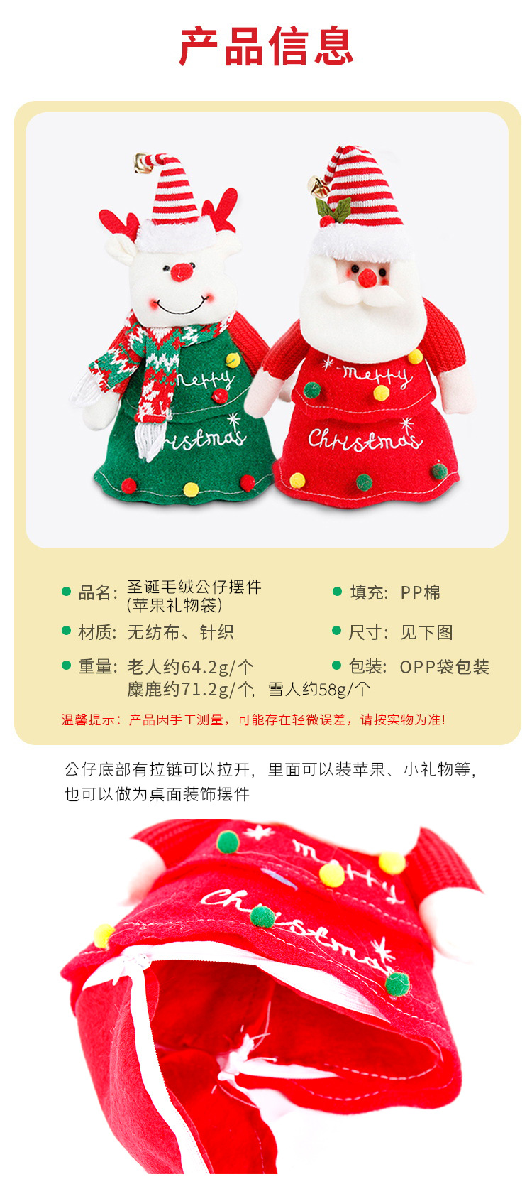 | Especificaciones | Muñeca de peluche adornos/Apple bolsa regalo (Santa Claus),Muñeca de peluche adornos/Apple bolsa regalo (Navidad ciervos),Muñeca de peluche adornos/bolsa de regalo de Apple (muñeco de nieve de Navidad) |