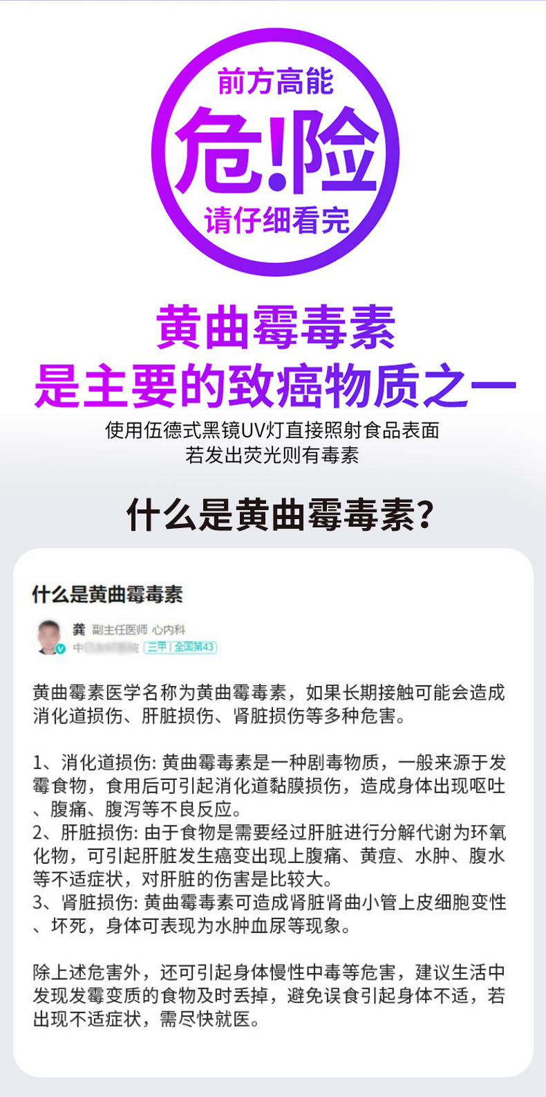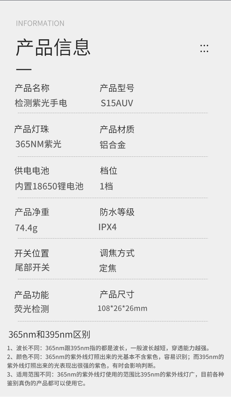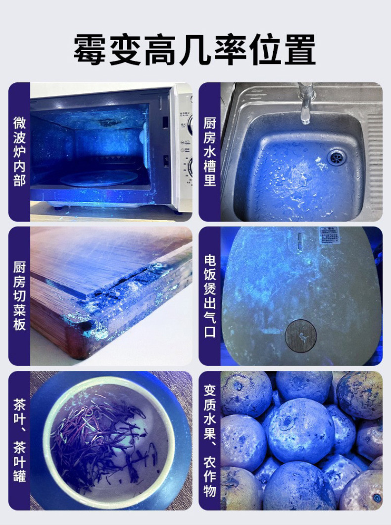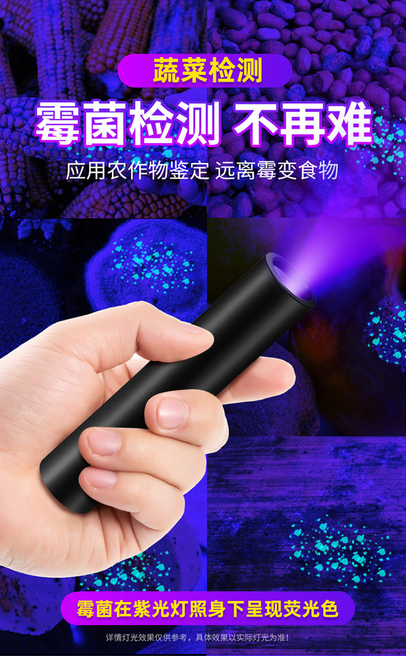 Fúngico aflatoxina, inspección de residuos de pesticidas de frutas y verduras, luz púrpura, tabaco y alcohol, identificación y detección contra la falsificación, linterna de luz púrpura