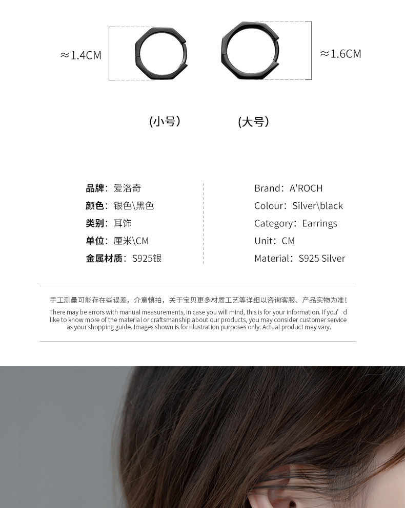 | Color | S925 un par de plata G9576 plata grande 16MM, S925 un par de plata G9576 negro grande 16MM, S925 un par de plata E7897 plata pequeño 14MM, S925 un par de plata E7897 negro pequeño 14MM |