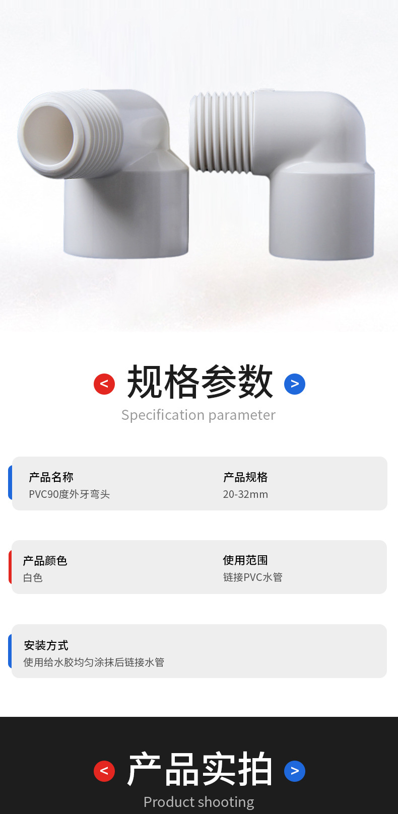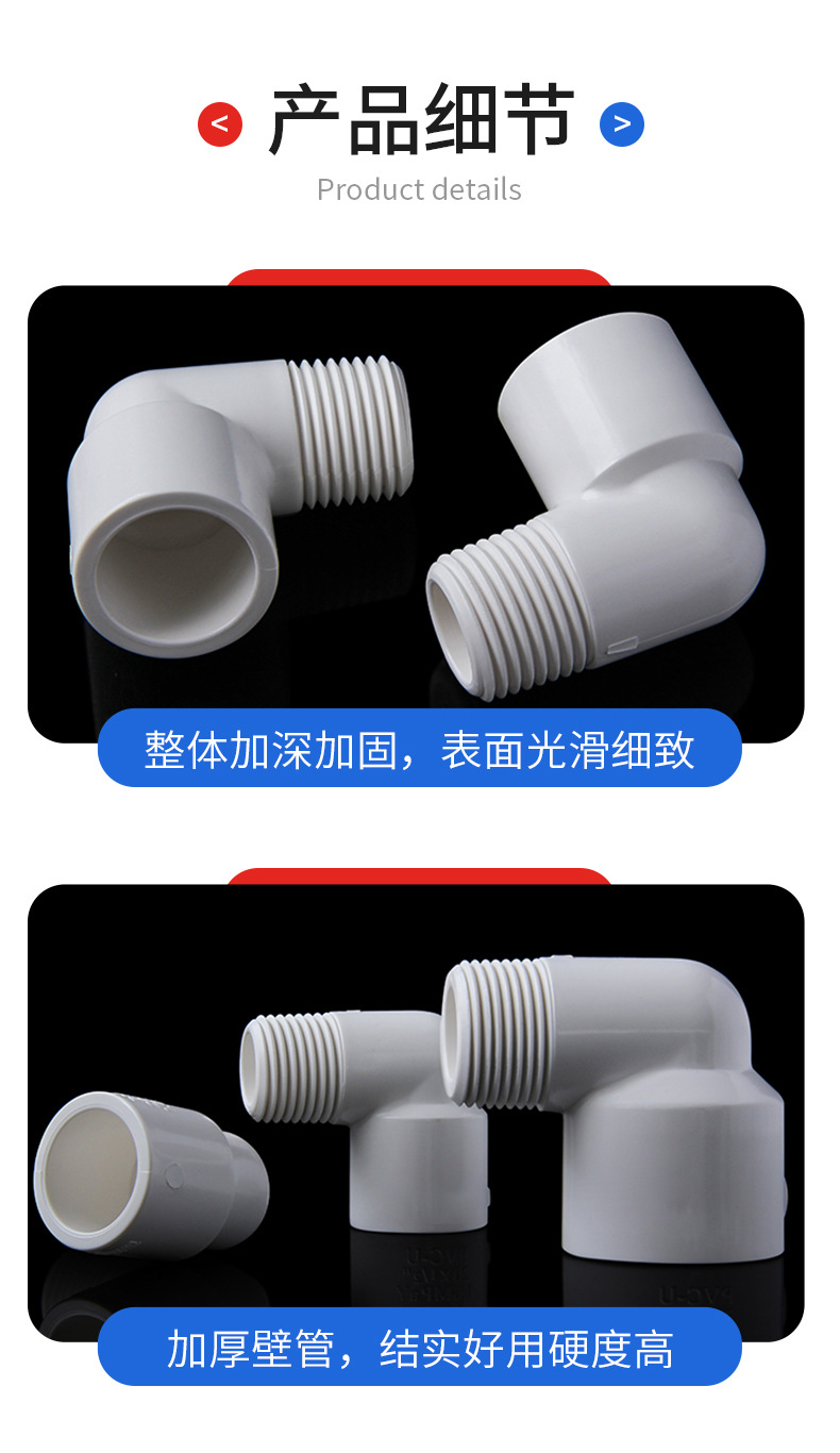 | Especificaciones del producto | 20 codos de hilo exterior (1.100 / caja), 25 codos de hilo exterior (700 / caja), 32 codos de hilo exterior (360 / caja), 25 * 20 codos de hilo exterior (1.000 / caja), 32 * 20 codos de hilo exterior (600 / caja), 32 * 25 codos de hilo exterior (500 / caja) |
