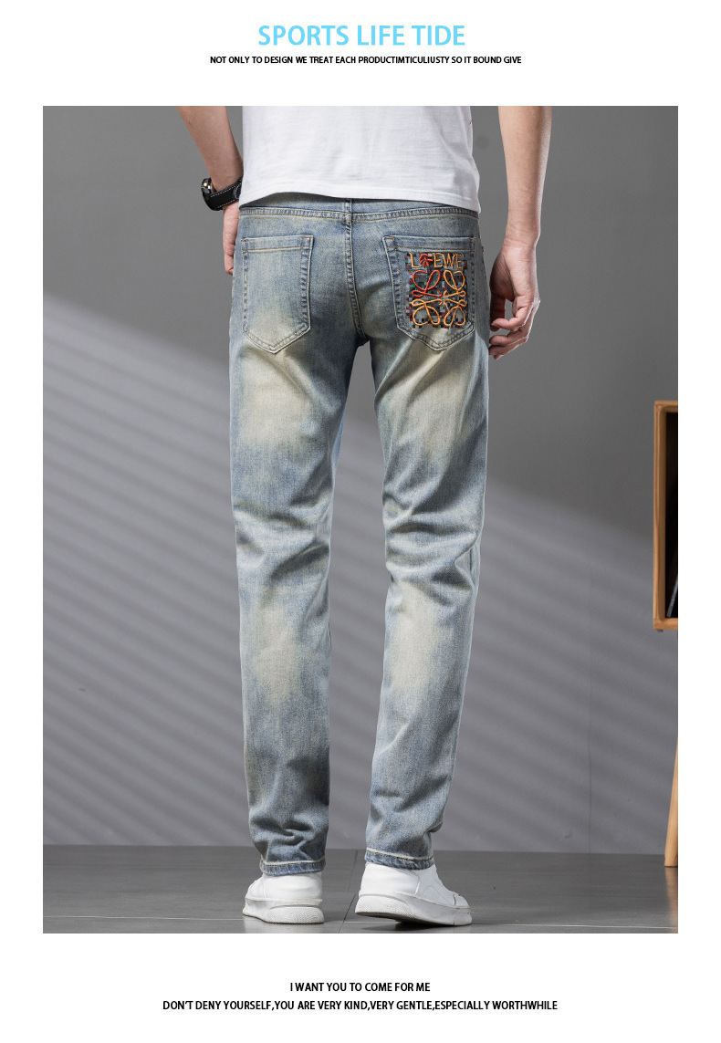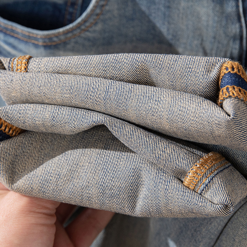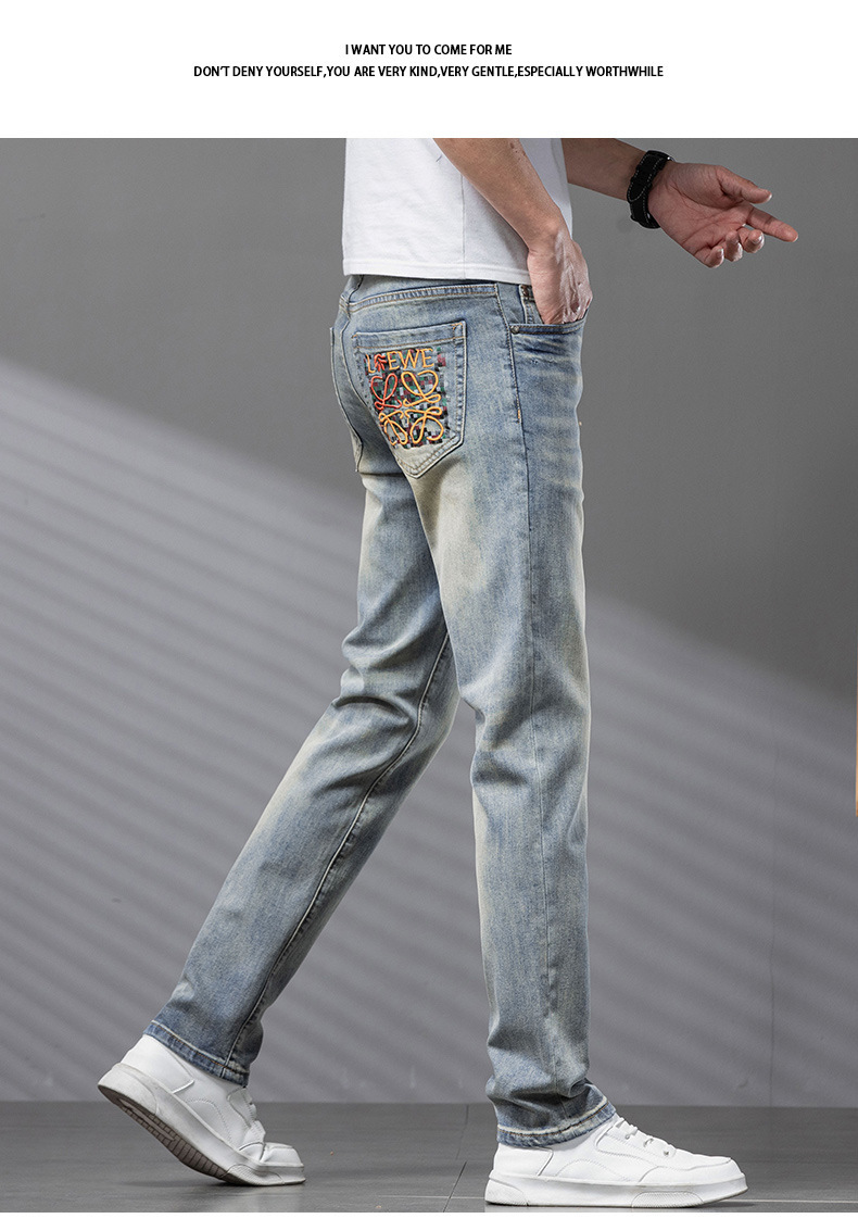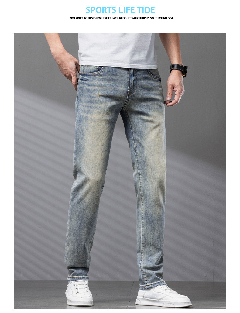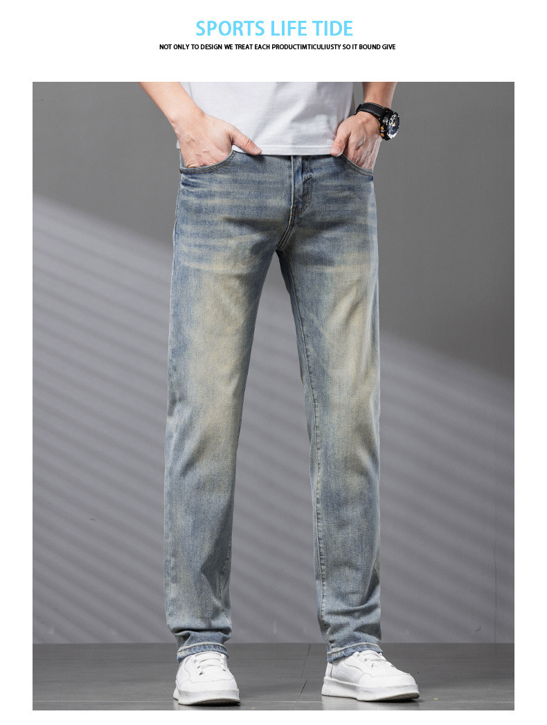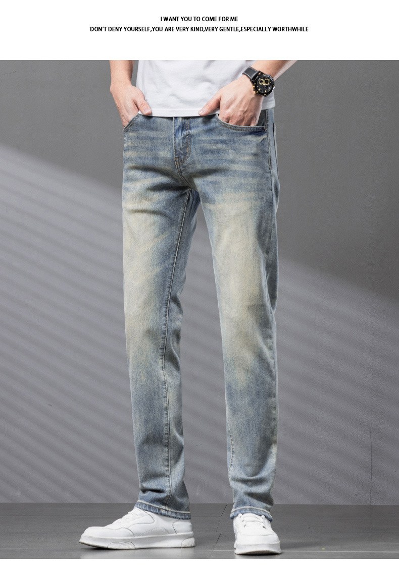 Bordado Mizongtu Jeans de hombre europeo de gama alta, amarillo fangoso pesado, lavado elástico delgado, pantalones de hombre rectos pequeños