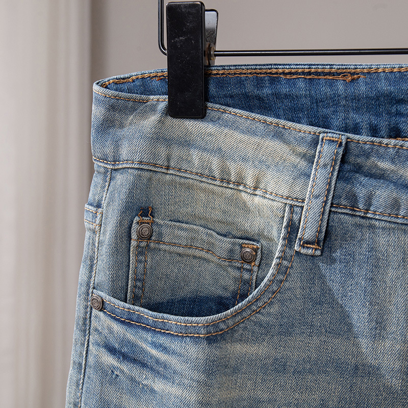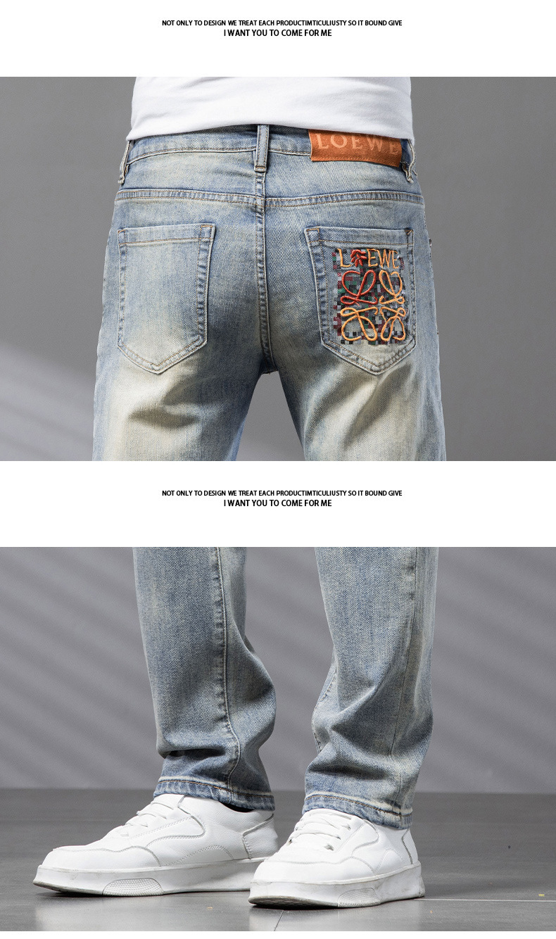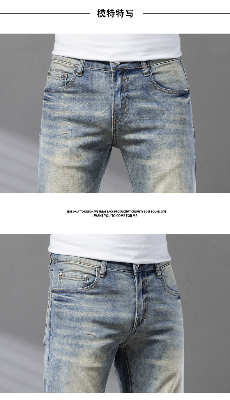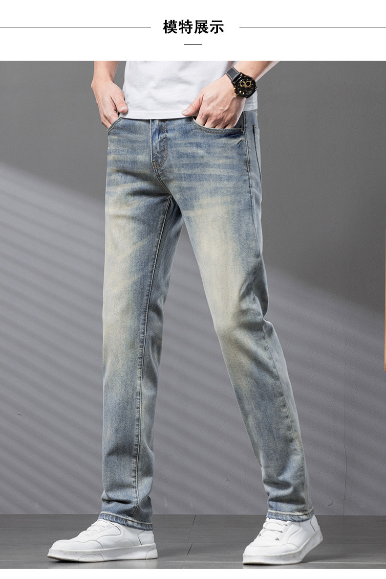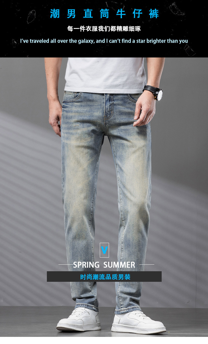 Bordado Mizongtu Jeans de hombre europeo de gama alta, amarillo fangoso pesado, lavado elástico delgado, pantalones de hombre rectos pequeños
