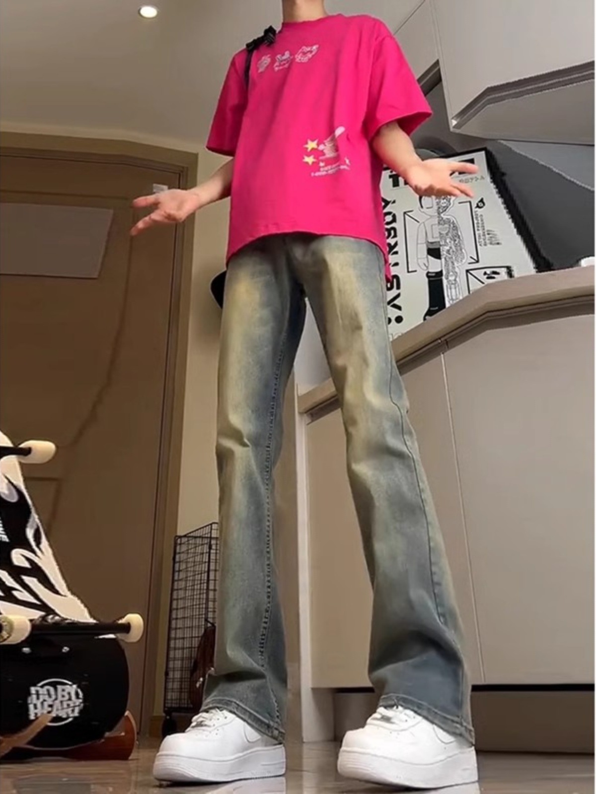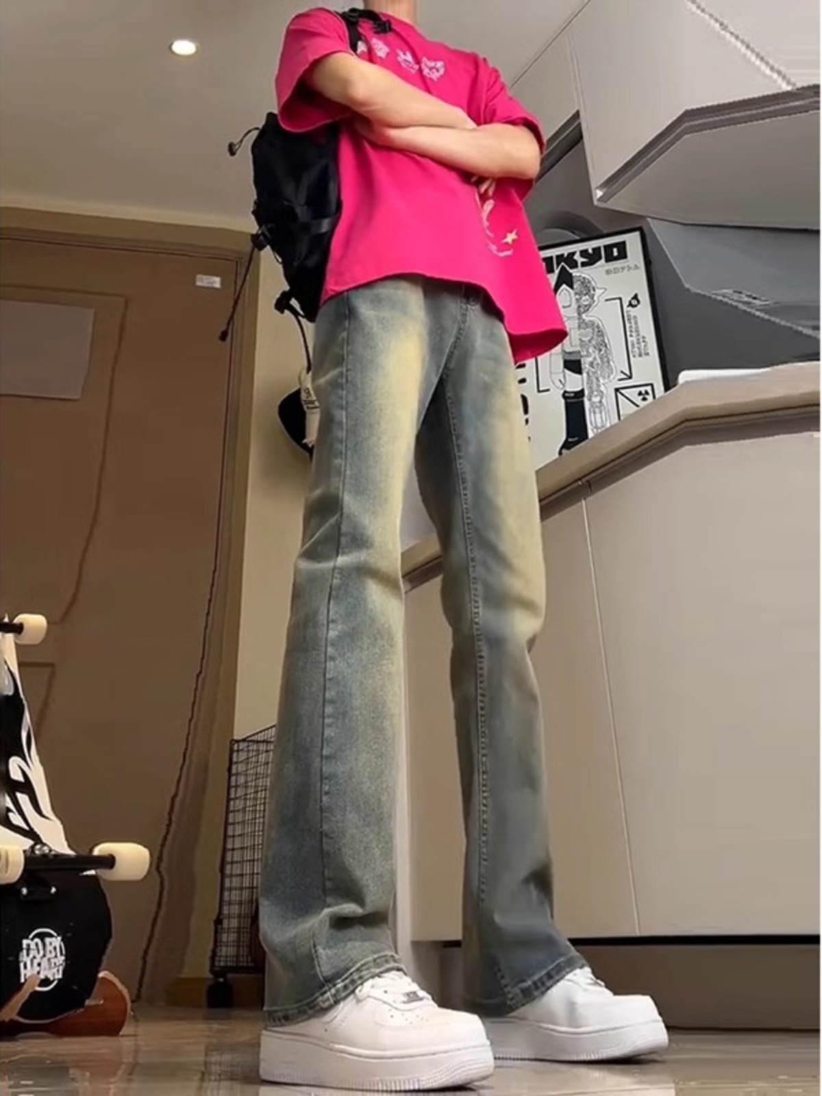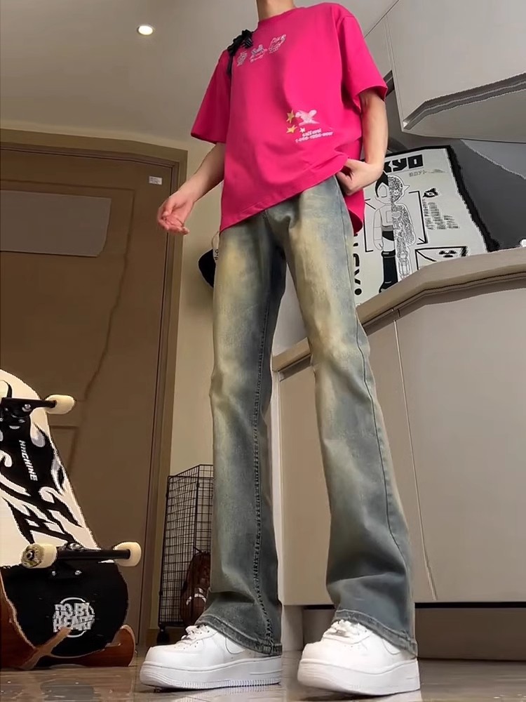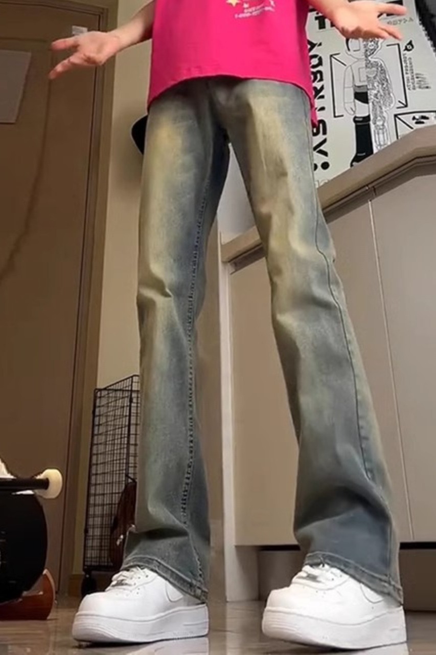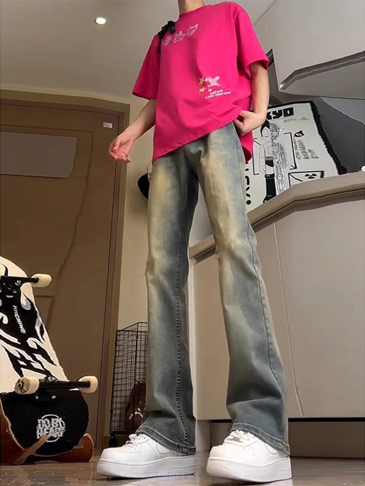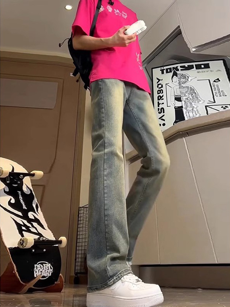 Lavados con agua hechos viejos jeans de estilo americano de alta calle vibe viento hombre vintage slimming rectas pantalones largos