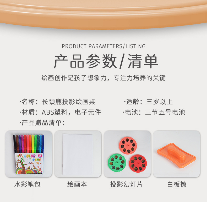 | Colores | Mesa de proyección azul,Mesa de proyección rosa,Mesa de proyección jirafa grande-amarillo,Mesa de proyección jirafa grande-rosa,Mesa de proyección de jirafa mediana-amarillo,Mesa de proyección de jirafa mediana-rosa,Mesa de proyección de jirafa pequeña-amarillo,Mesa de proyección de jirafa pequeña-rosa,Presentación de diapositivas pequeña * 3 |