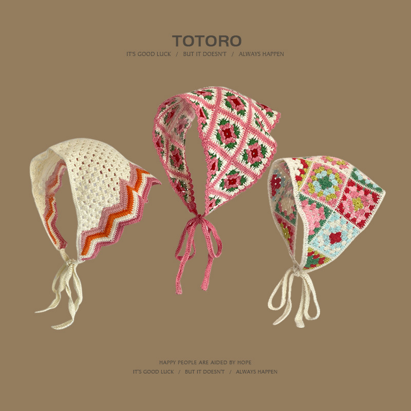 Turbante retro francés, bufanda triangular para mujer, diadema, salida de primavera y verano, dulce y lindo, estilo artístico de ganchillo hecho a mano, sombrero de Baotou