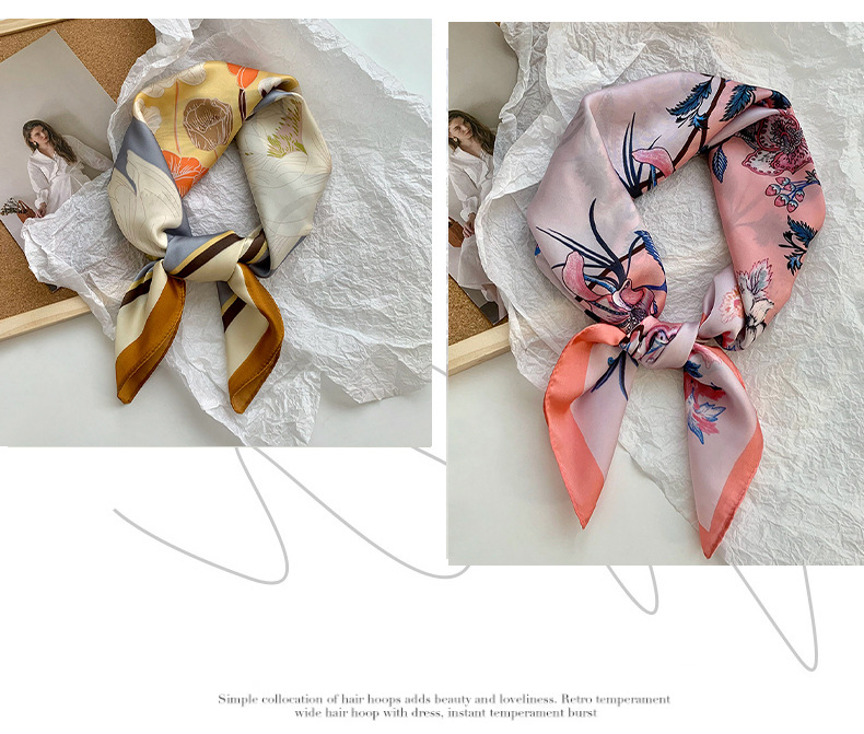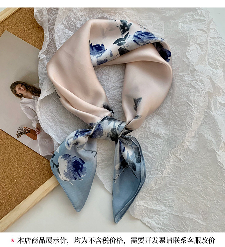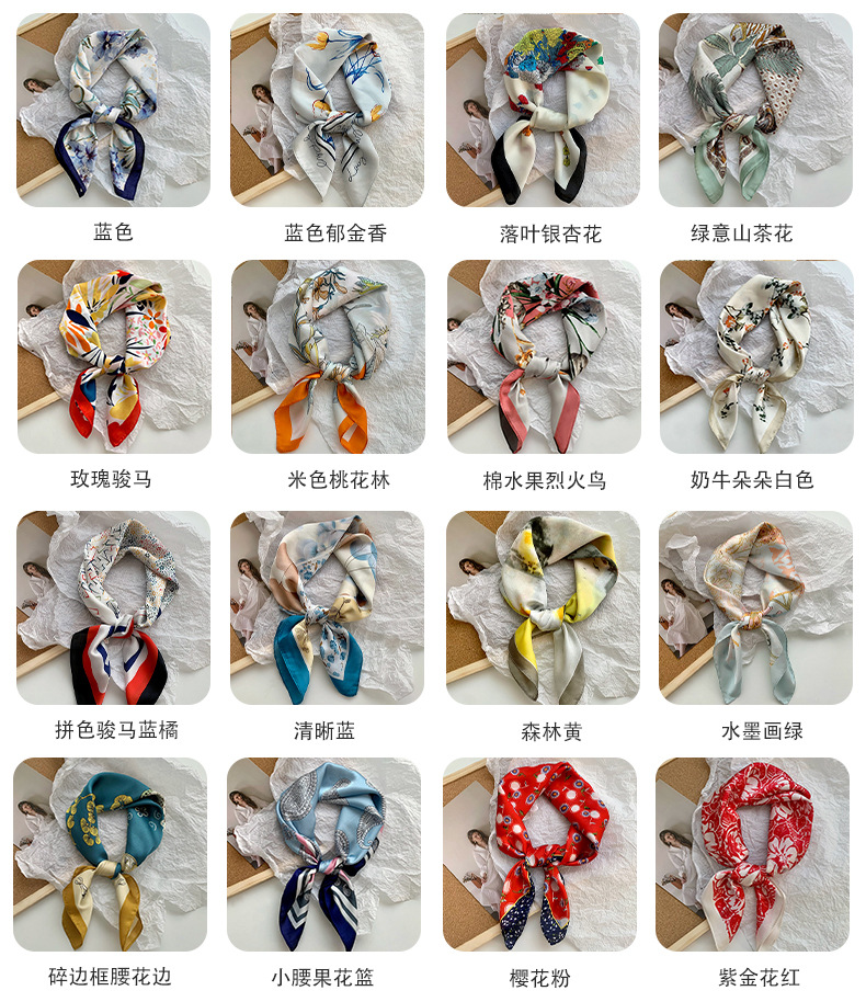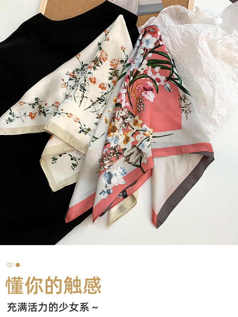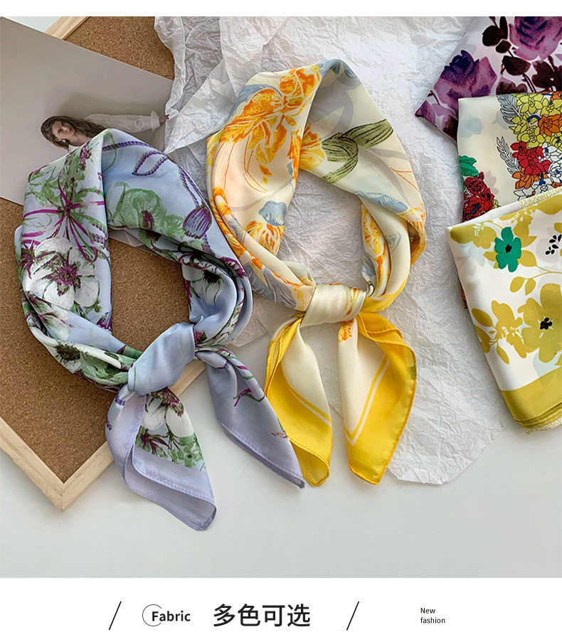 Bufanda de seda, bufanda cuadrada pequeña, sensación premium, nuevo estilo coreano, chal de seda de imitación dulce y fresco, bolso de flores, pañuelo en la cabeza, cinturón para el cabello