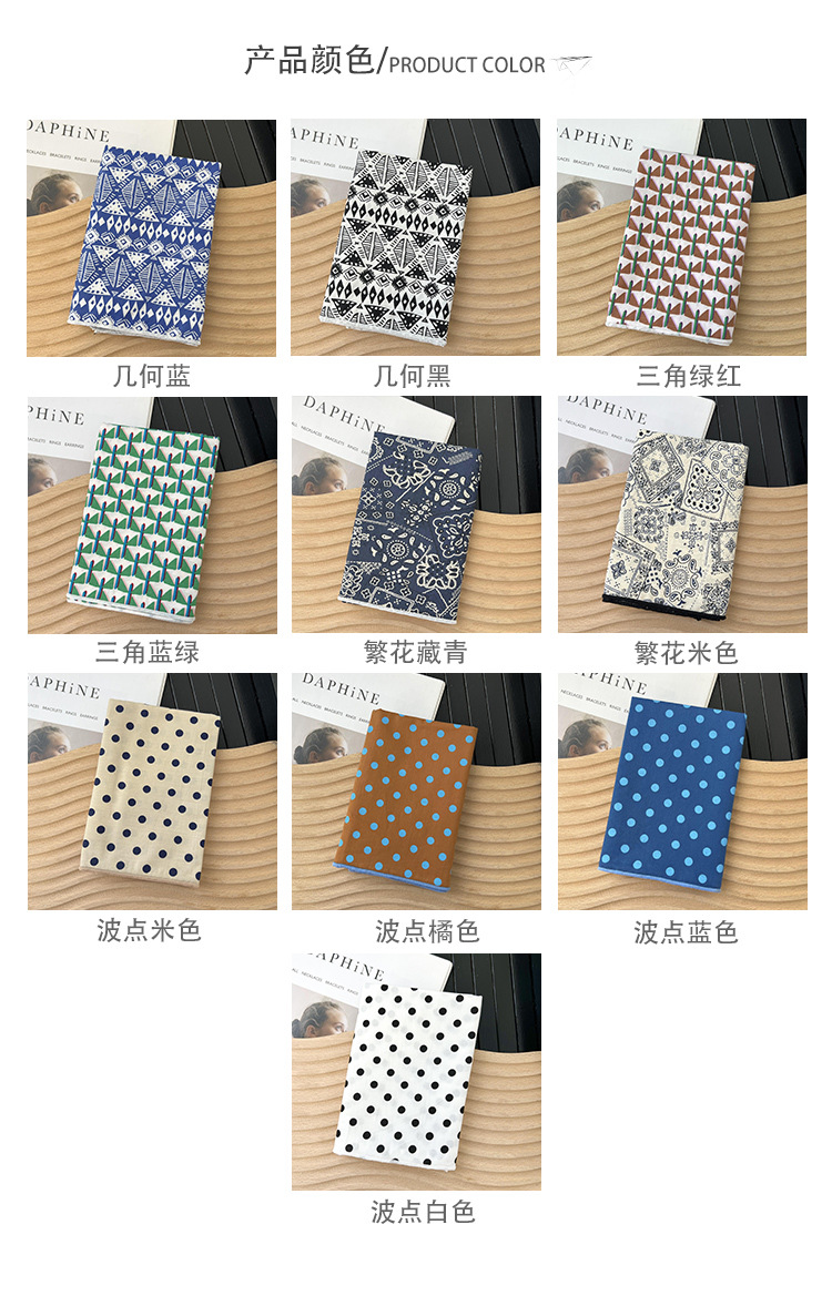 | Colores | Punto de onda blanco,Naranja de lunares,Punto de onda azul,Punto de onda beige,Flores,Flor beige,Negro geométrico,Azul geométrico,Triángulo verde rojo,Flor de animal azul marino,Pequeña flor azul marino,Pequeña flor beige,Pequeña flor verde frijol claro,Estrella flor blanco,Estrella flor azul marino,Estrella flor caqi |