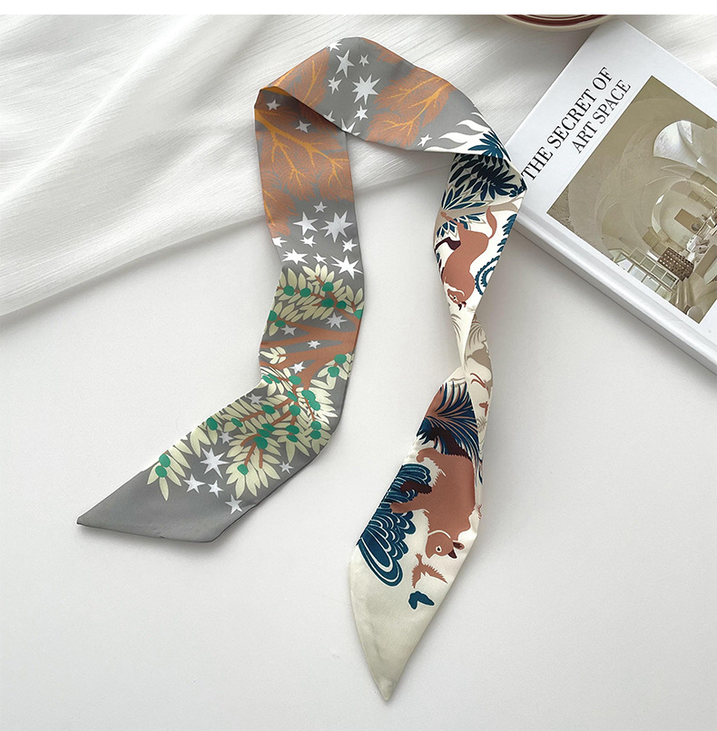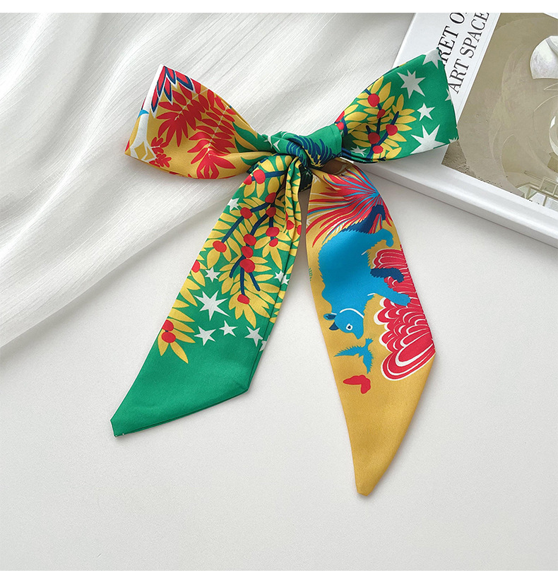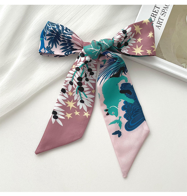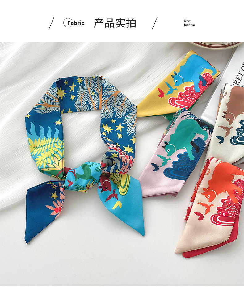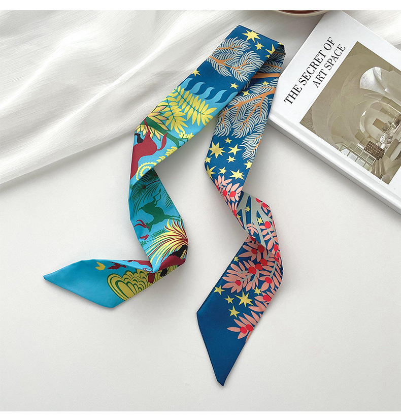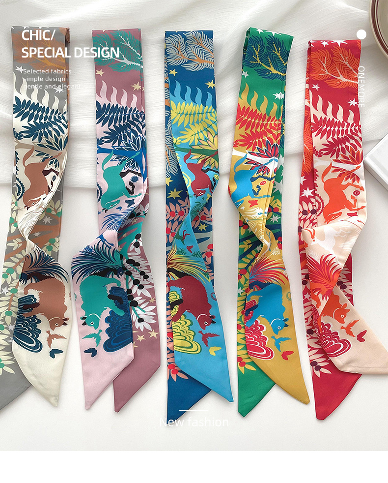 Nueva delgada estrecha larga bufanda de seda para las mujeres primavera y verano versátil animal selva impresión lazo pelo bolsa mango cinta