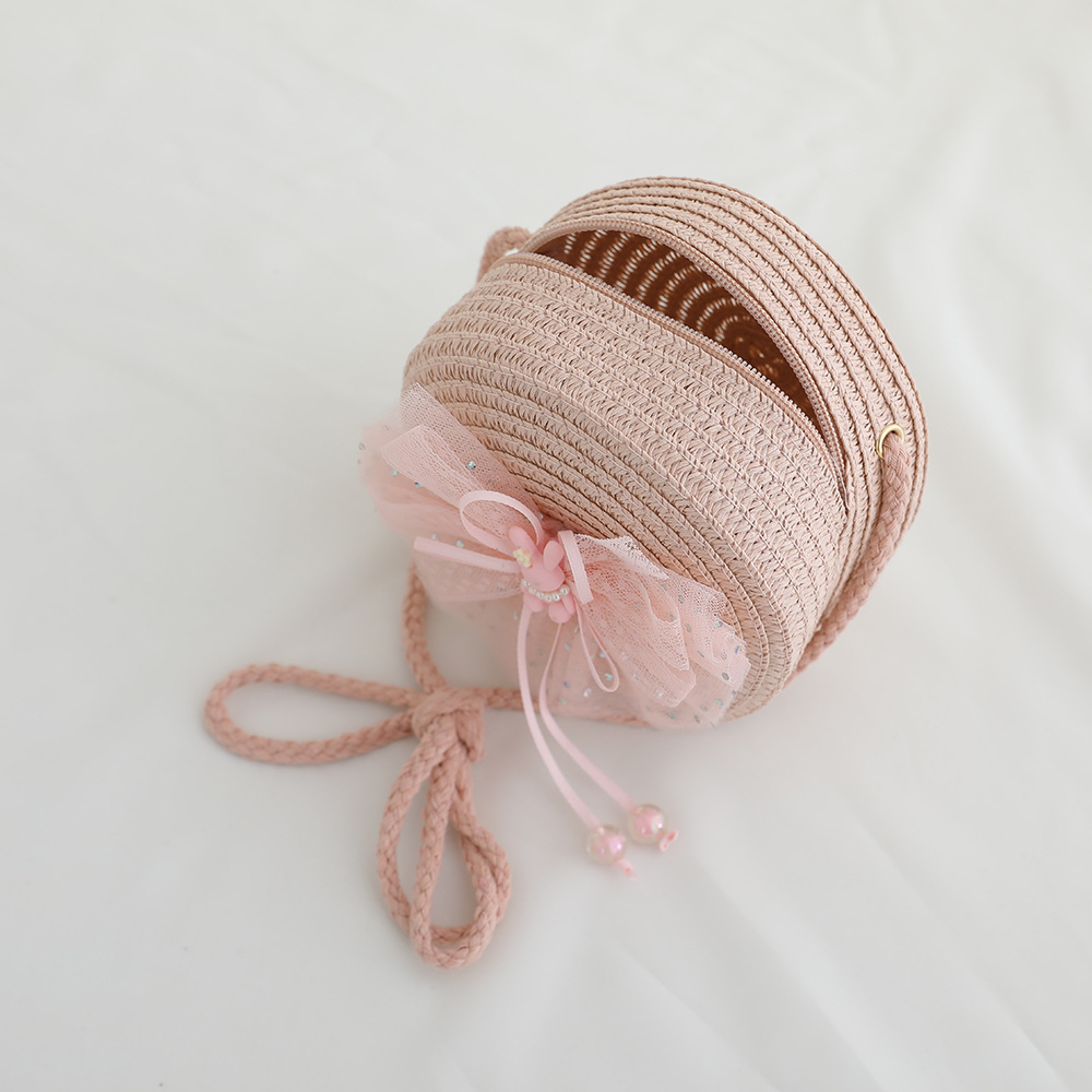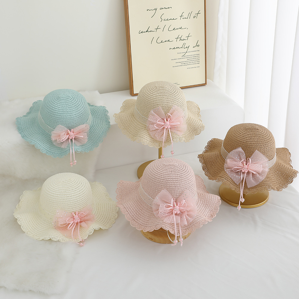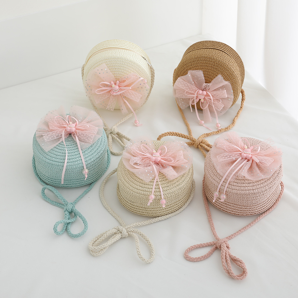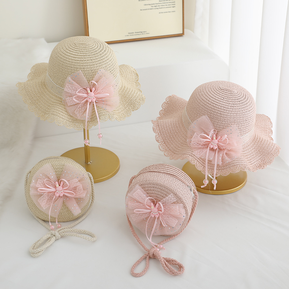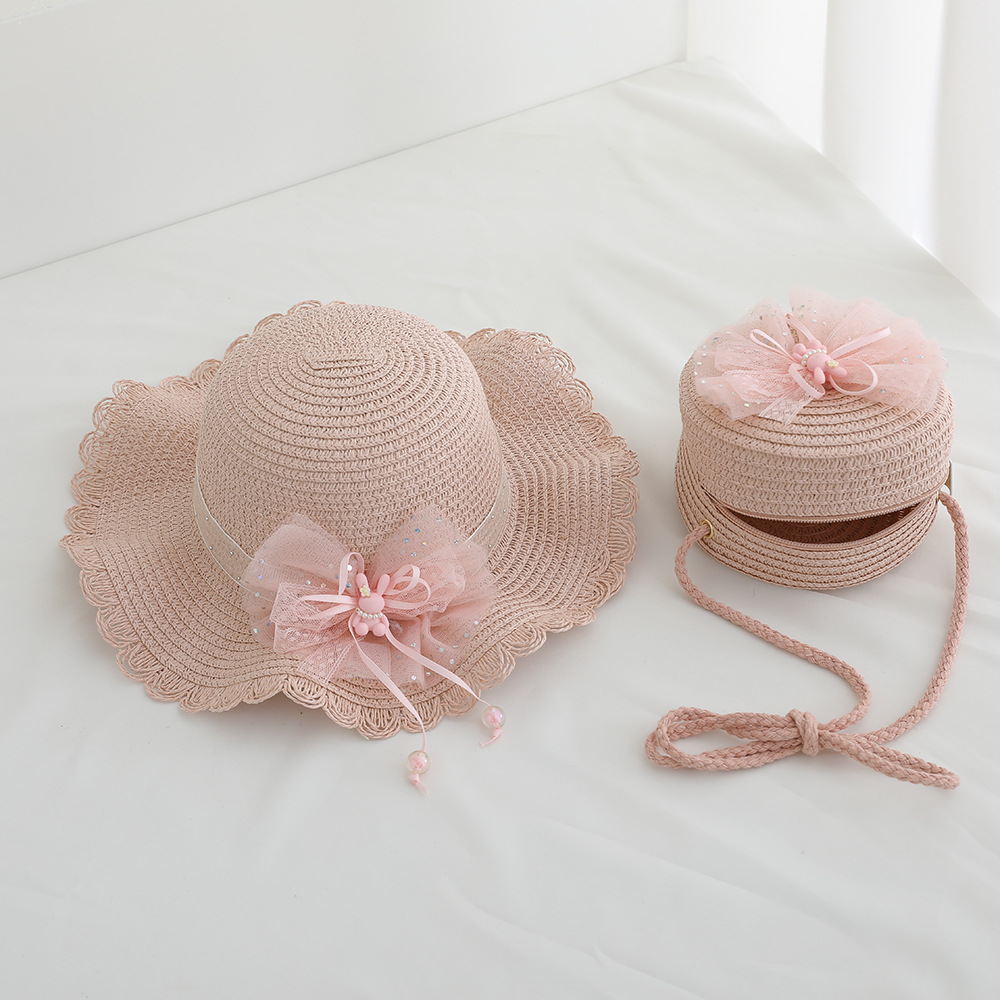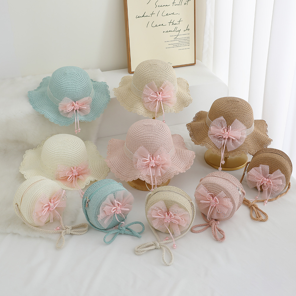 Verano nuevo sombrero para niños sombreado sombrero de paja bolso de dos piezas lindo encaje flor niña sombrero de playa al por mayor