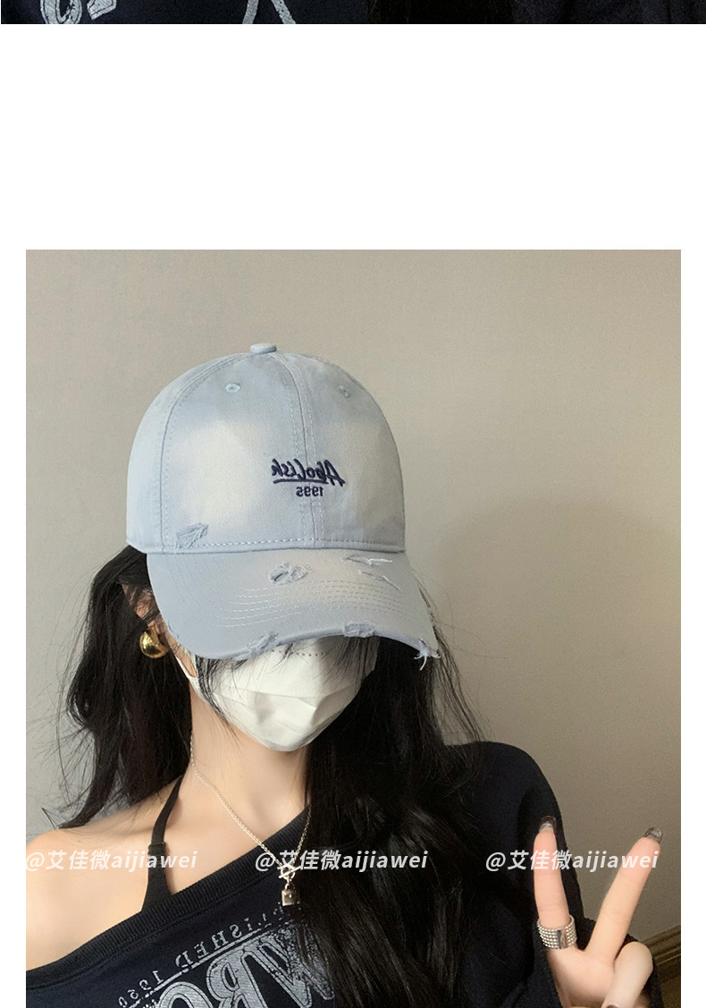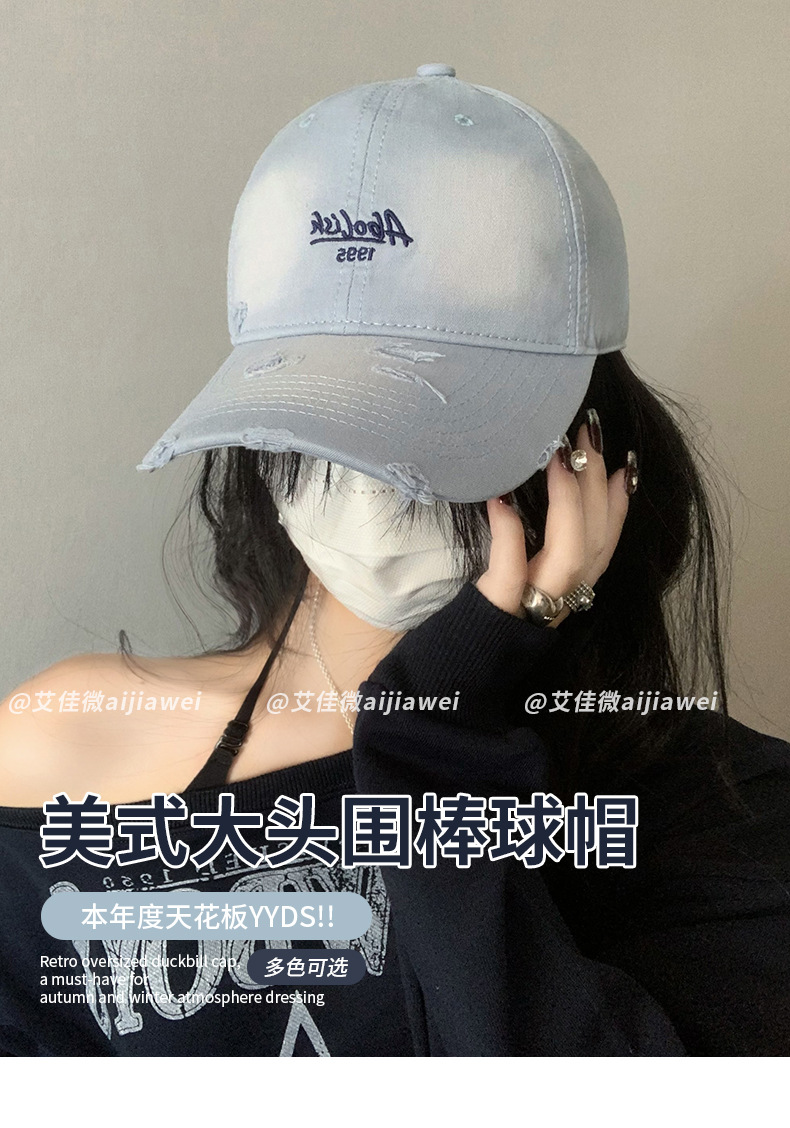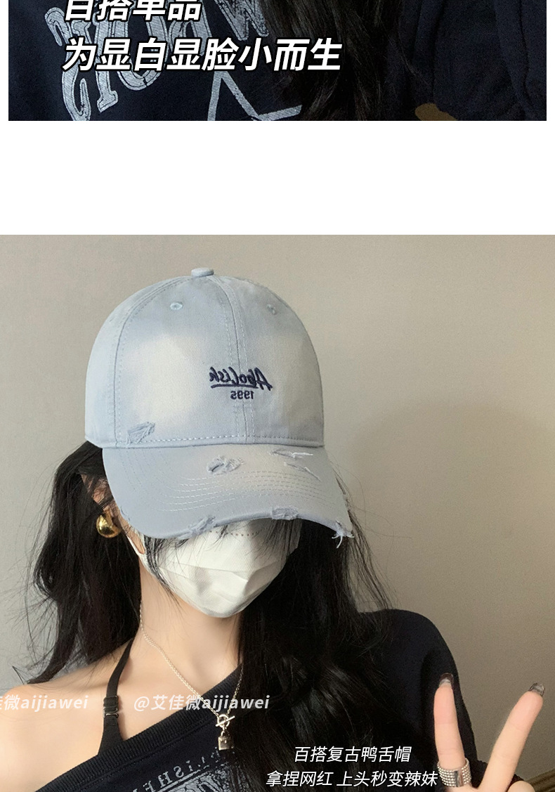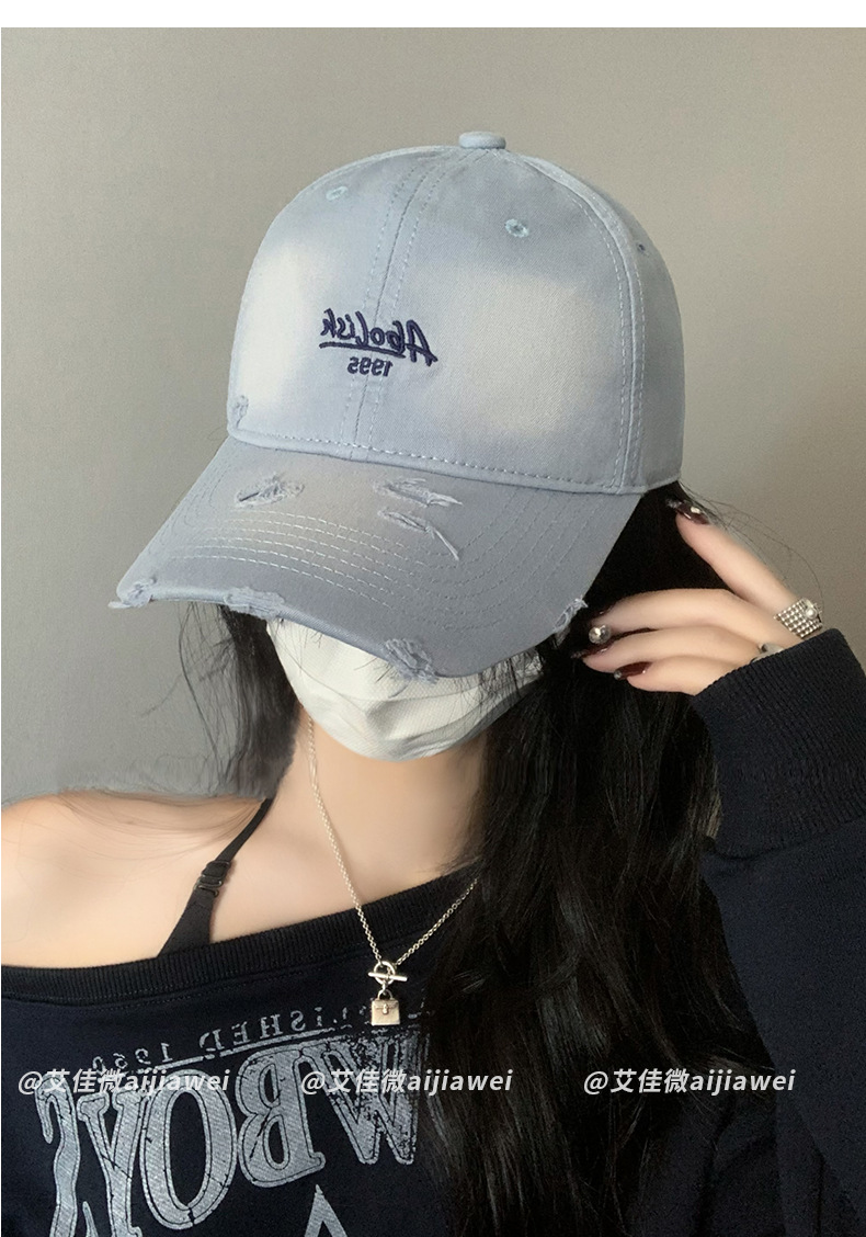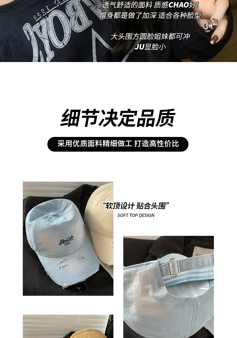 2025 nuevo agua lavada bordada gorra de boca de pato agujero gorra de primavera y verano mujer cabeza grande cara pequeña sombrera de béisbol versátil sombrero de sombrero de sombrero de sombrero de béisbol