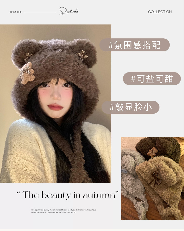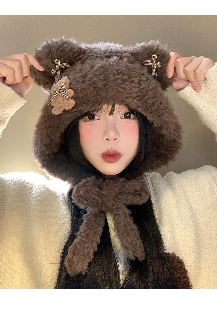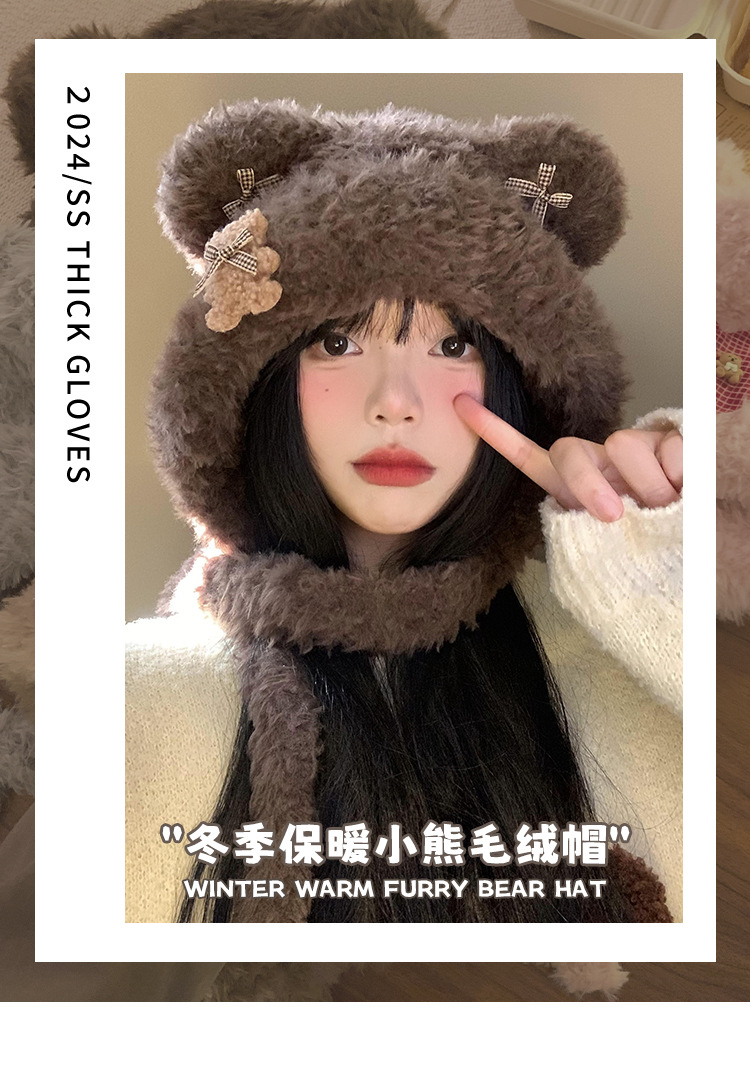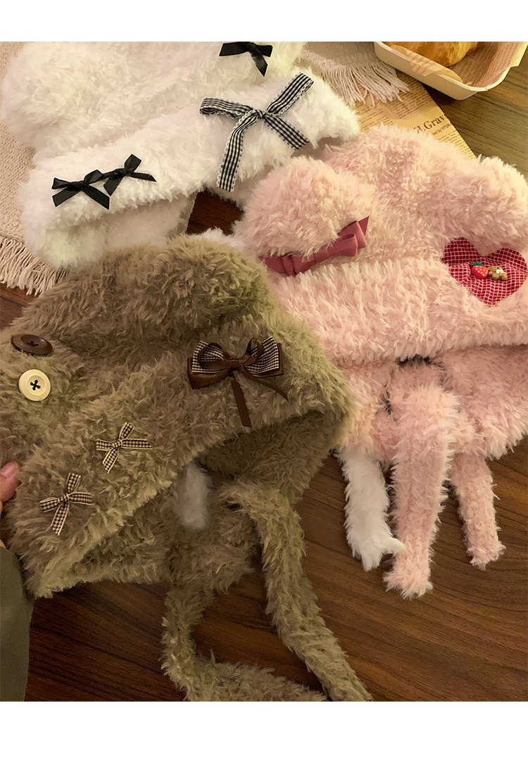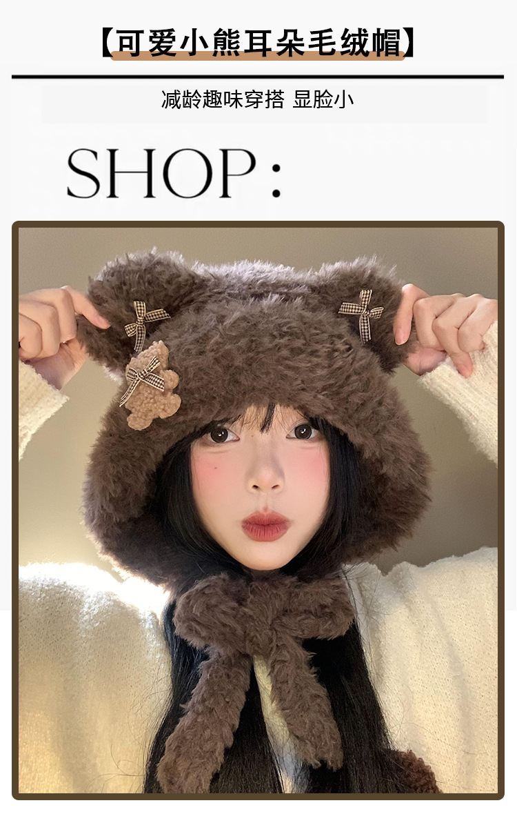 Hermoso arco de oso orejas gorra de peluche para mujeres otoño y invierno cara pequeña gorra de punto protector de orejas gorra de calor frío