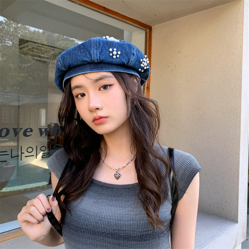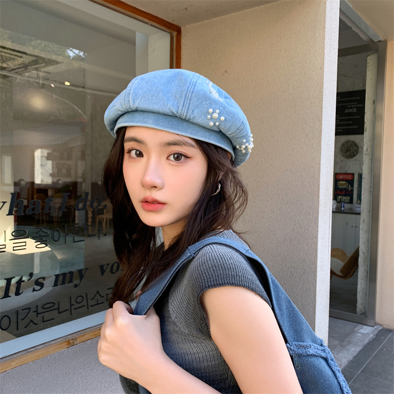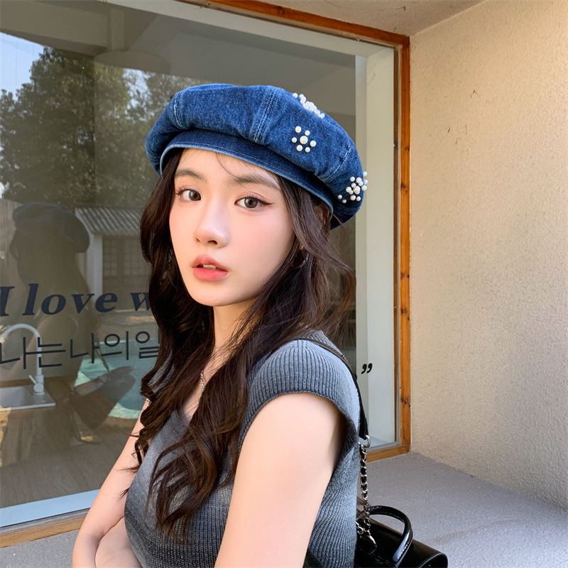 Boina de vaquero coreana para mujeres nuevas cara pequeña gorra pintora primavera y otoño red red inns moda perla decoración brilla
