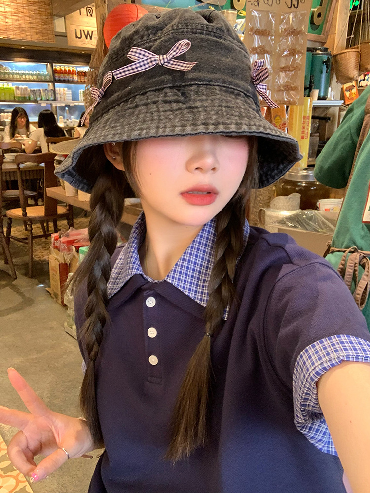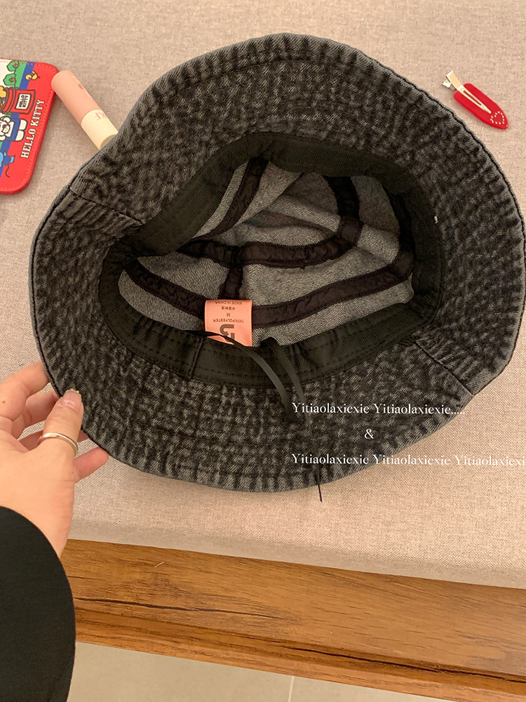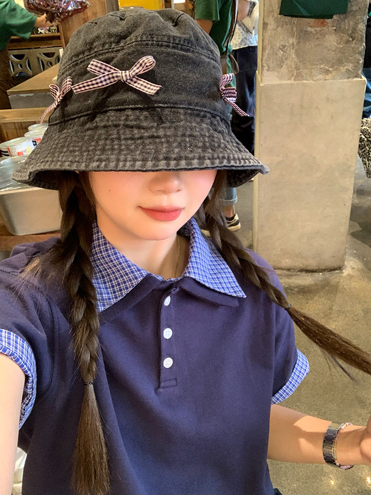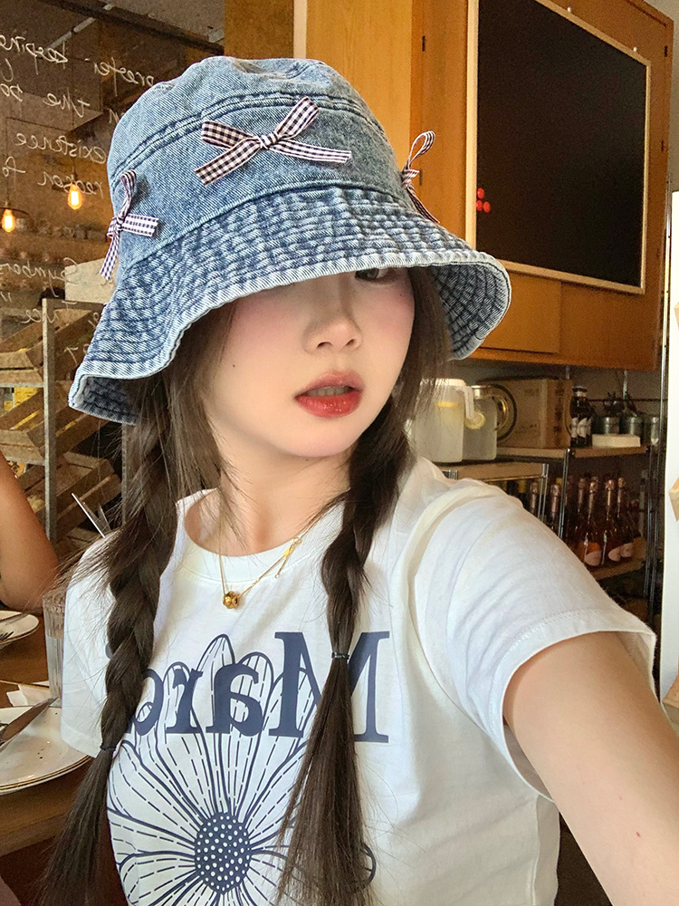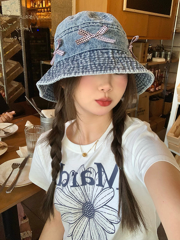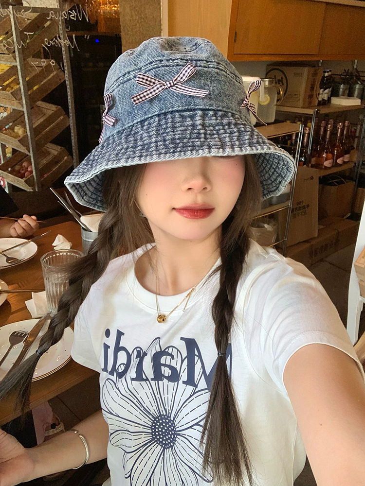 Japón retro arco vaquero sombrero pescador mujer dulce encantador versátil sombrero de bañera de protección solar grande alrededor de la cabeza muestra cara pequeña