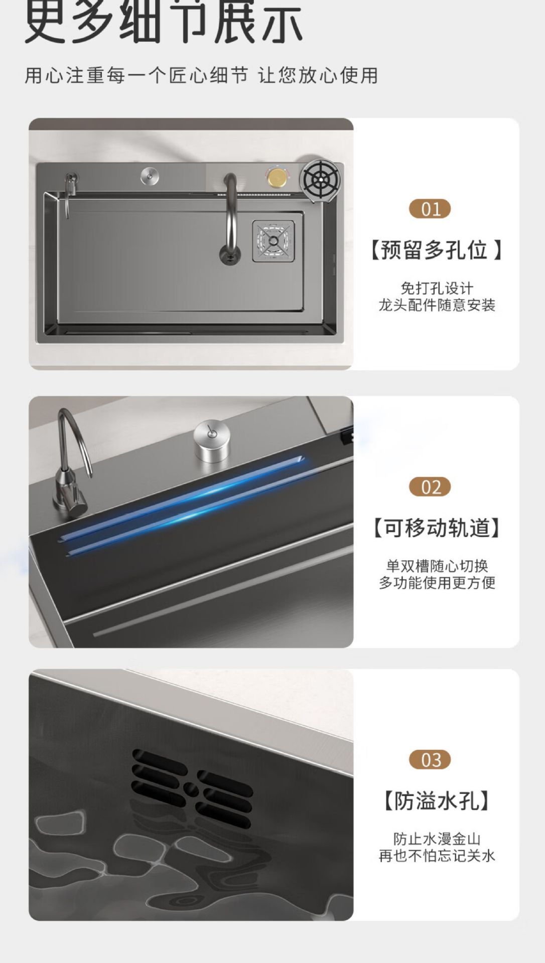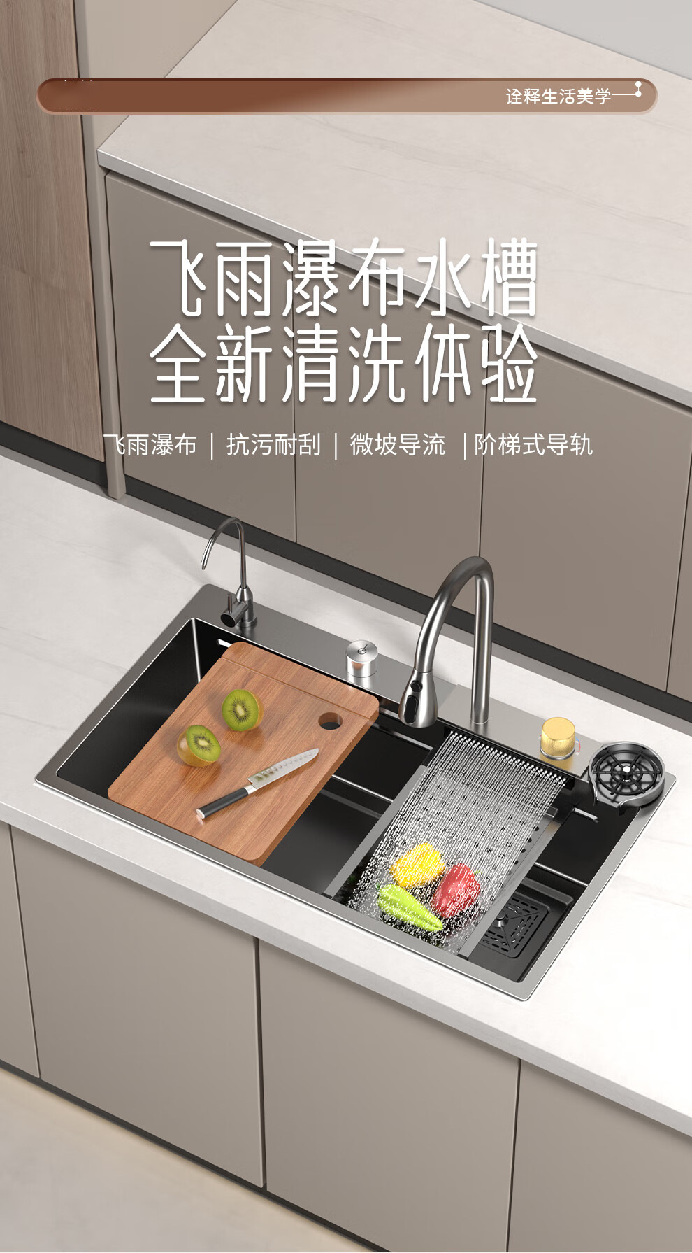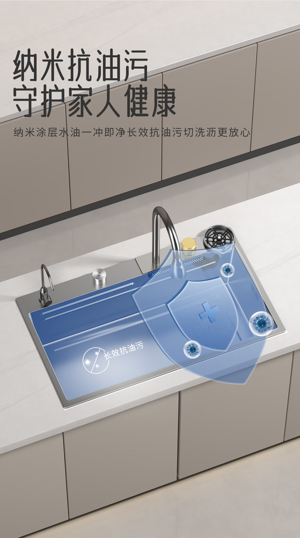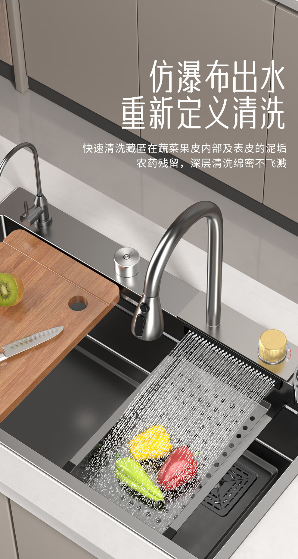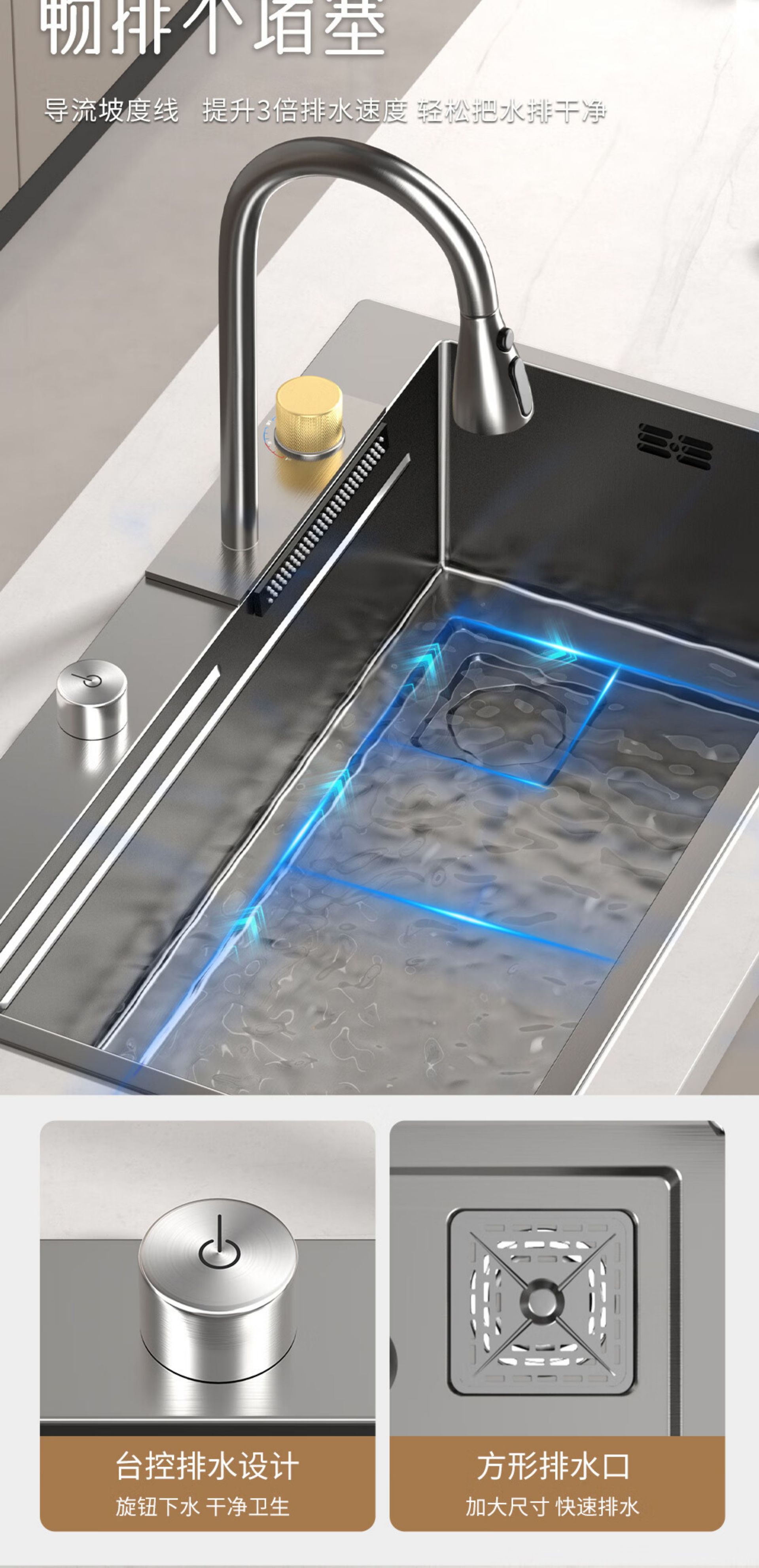 Fregadero de cocina grande de un solo tanque Feiyu Waterfall Pantalla digital Nano Acero inoxidable engrosamiento Lavado de verduras Fregadero Multifunción debajo del escenario