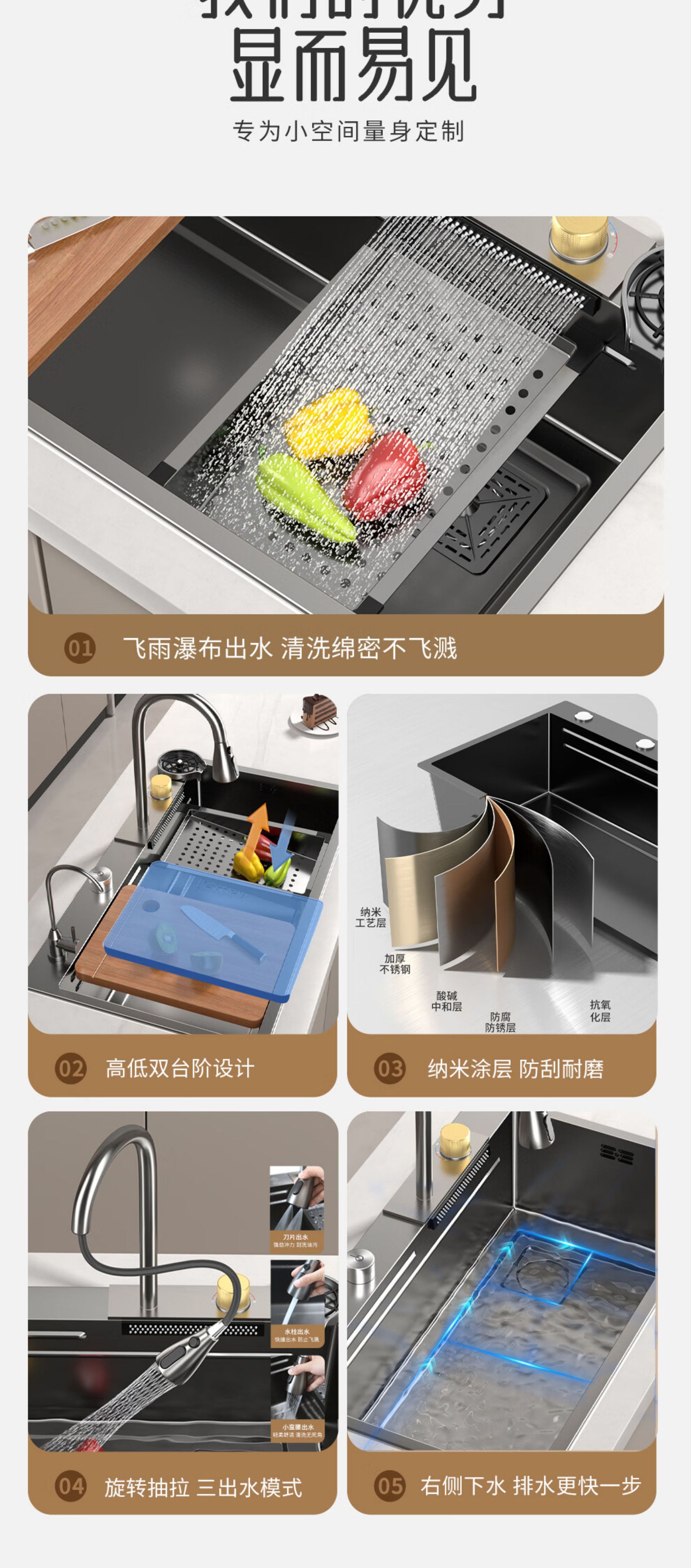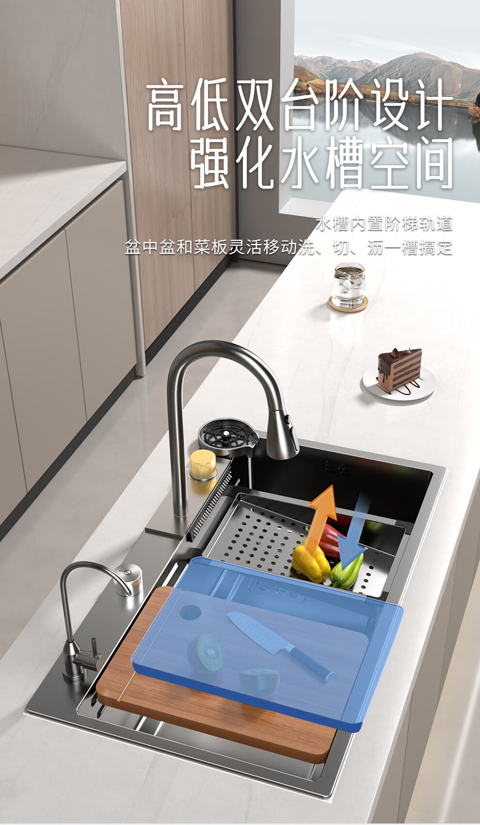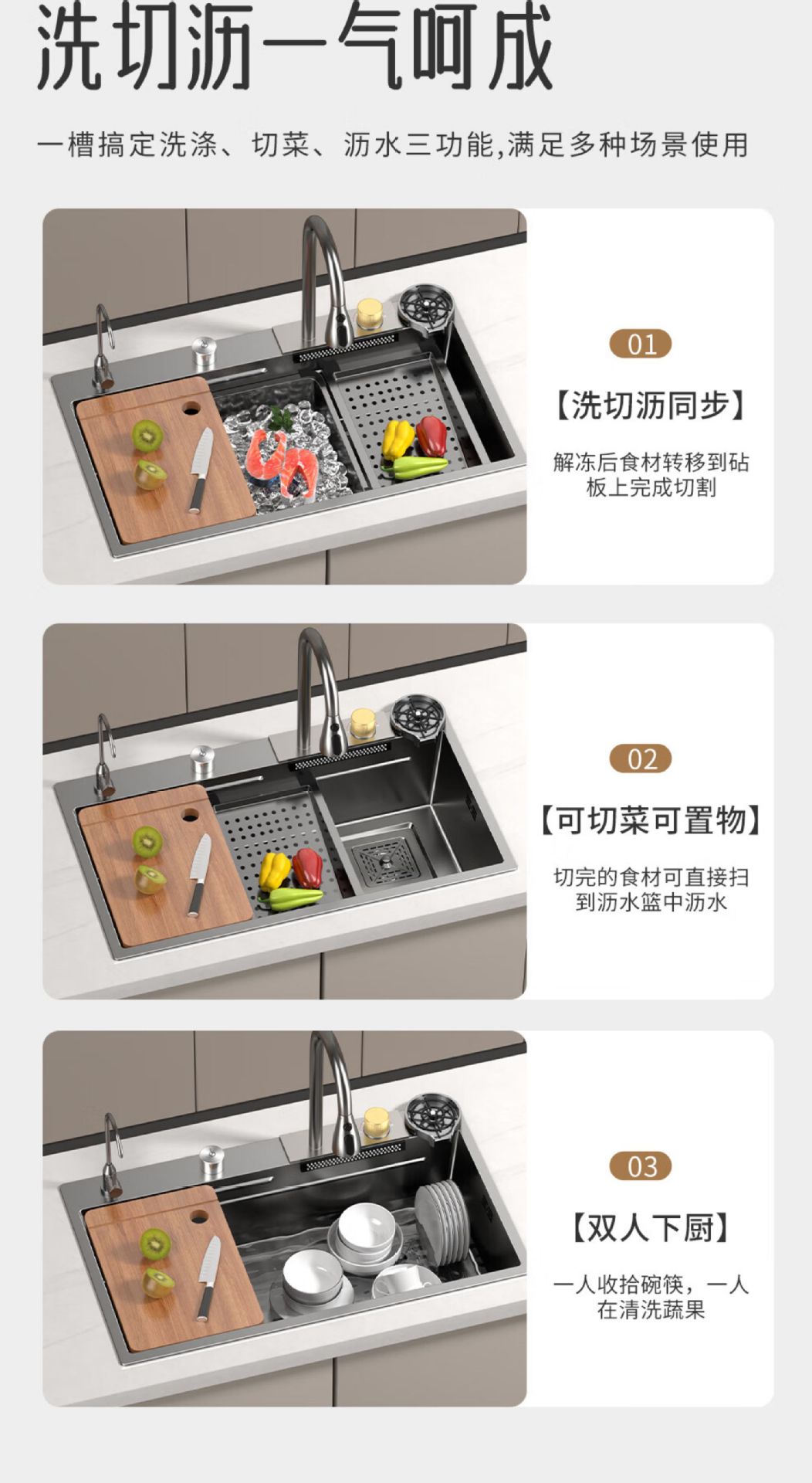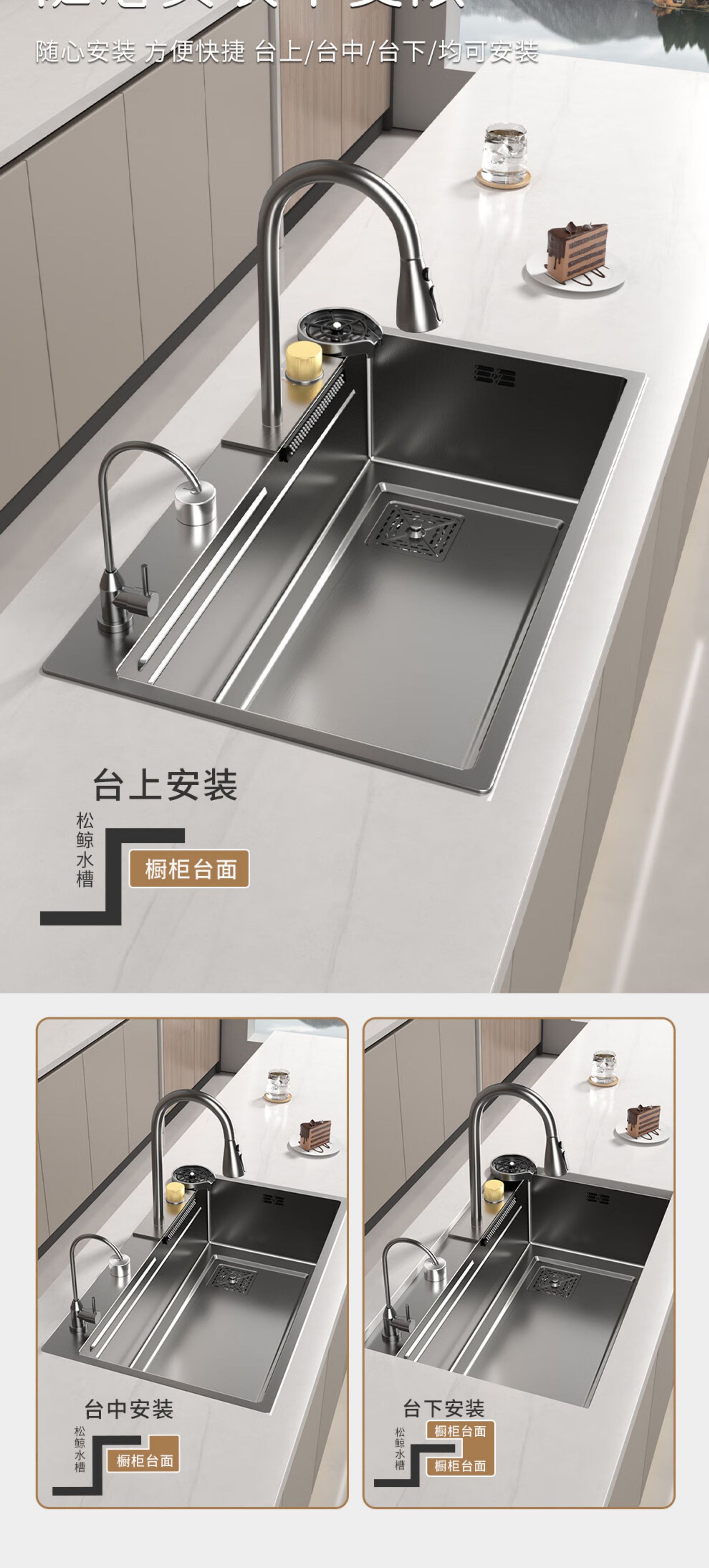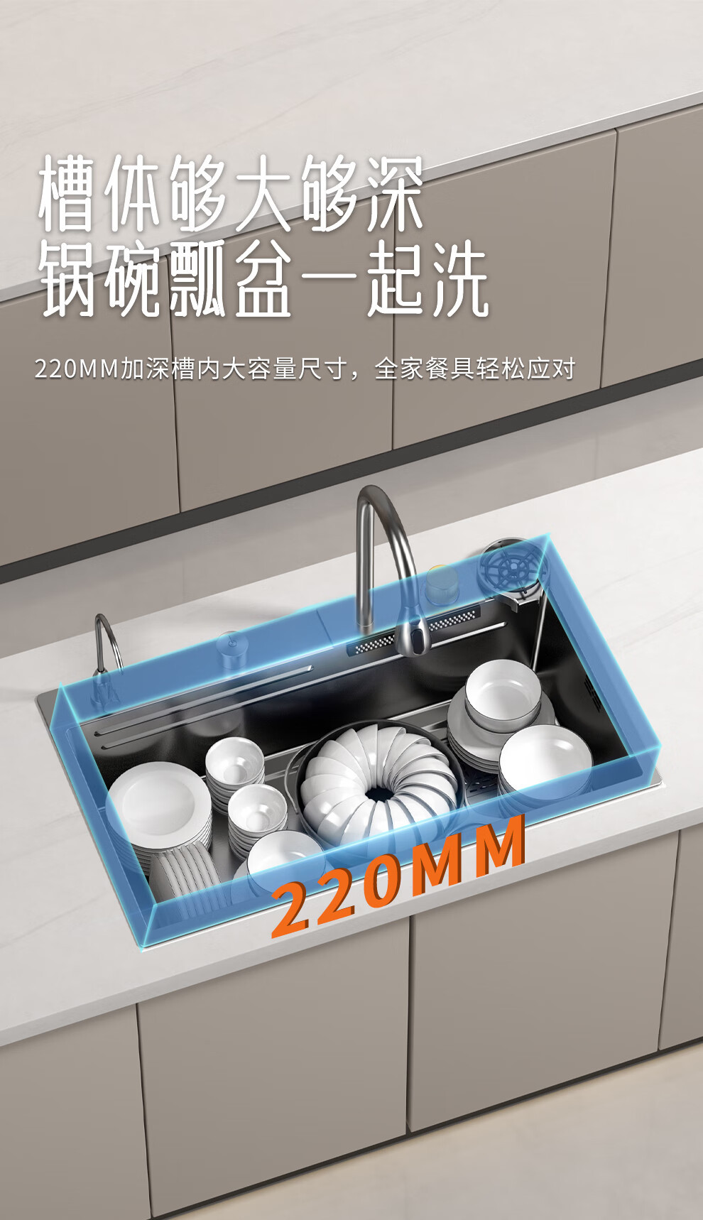 Fregadero de cocina grande de un solo tanque Feiyu Waterfall Pantalla digital Nano Acero inoxidable engrosamiento Lavado de verduras Fregadero Multifunción debajo del escenario