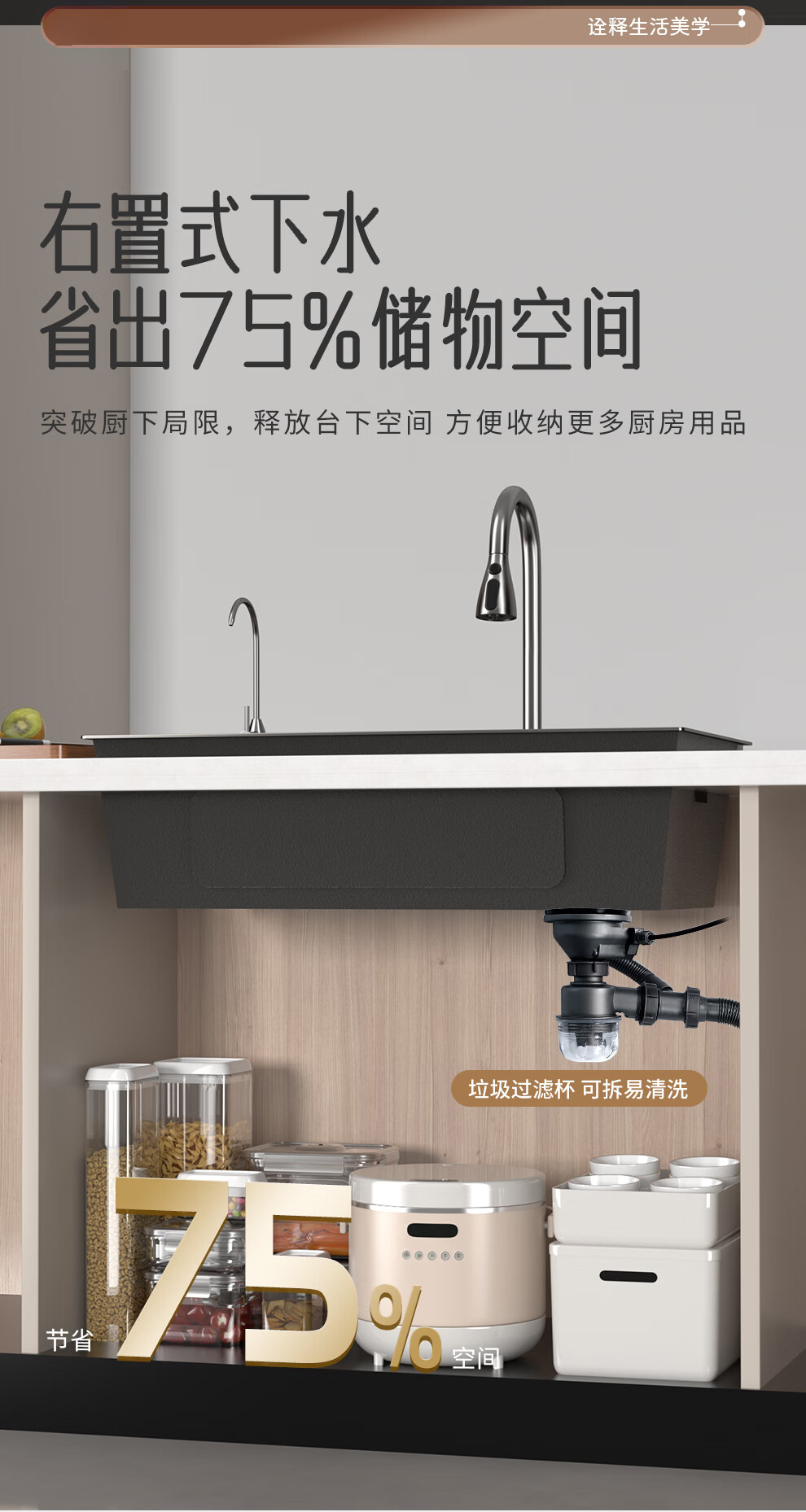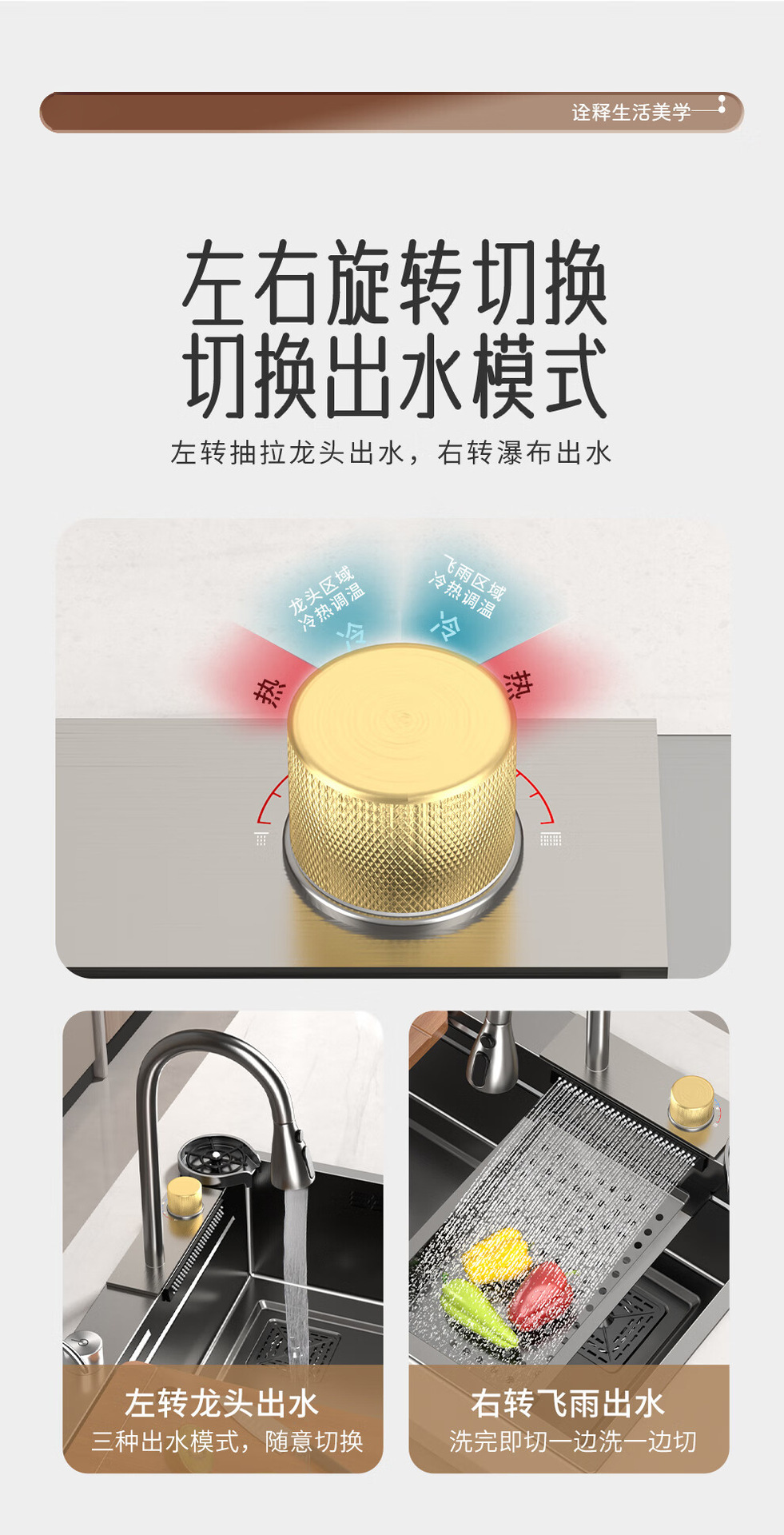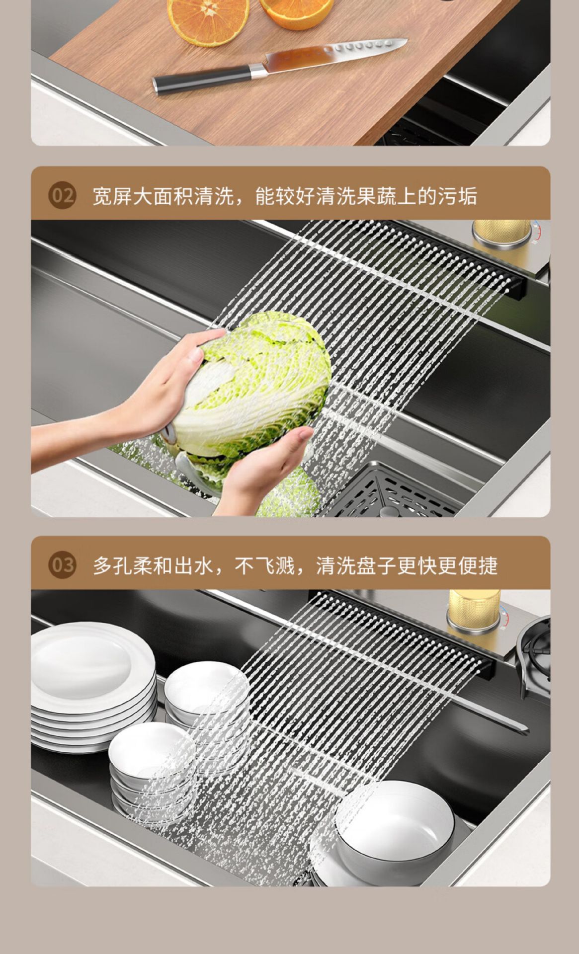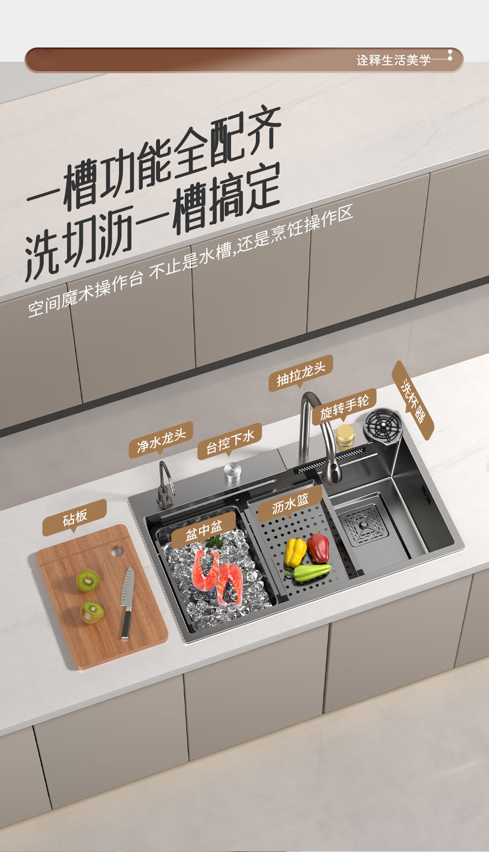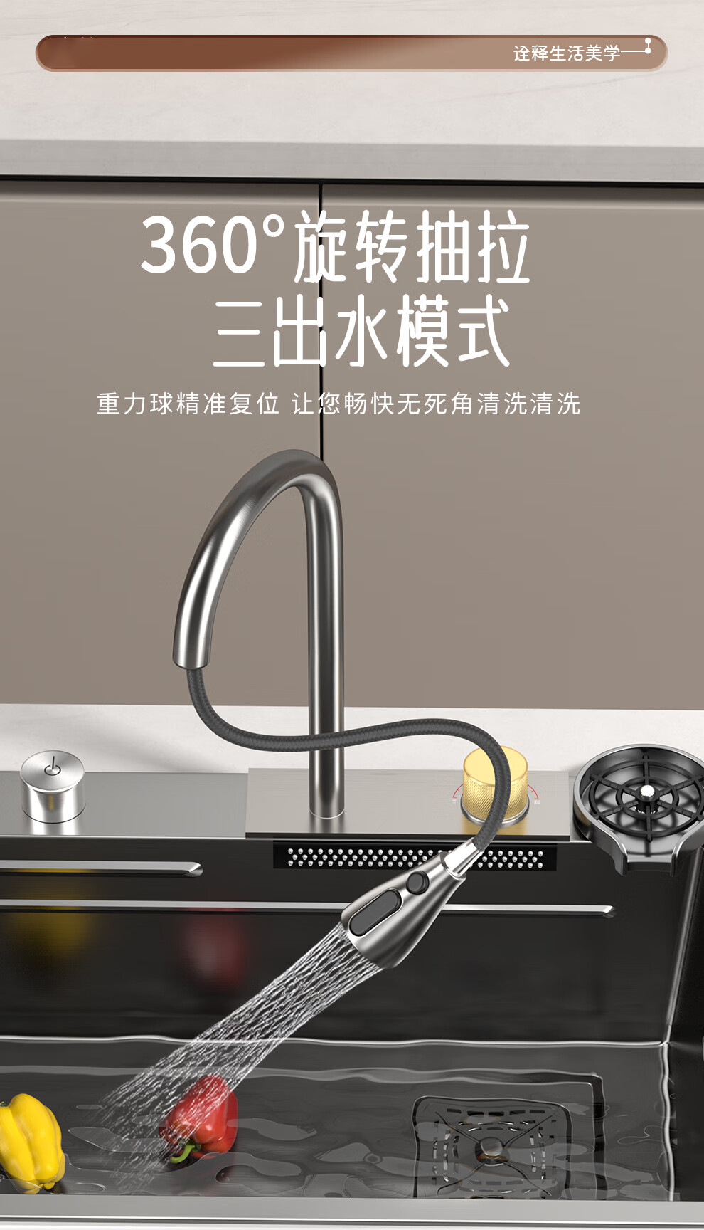 Fregadero de cocina grande de un solo tanque Feiyu Waterfall Pantalla digital Nano Acero inoxidable engrosamiento Lavado de verduras Fregadero Multifunción debajo del escenario