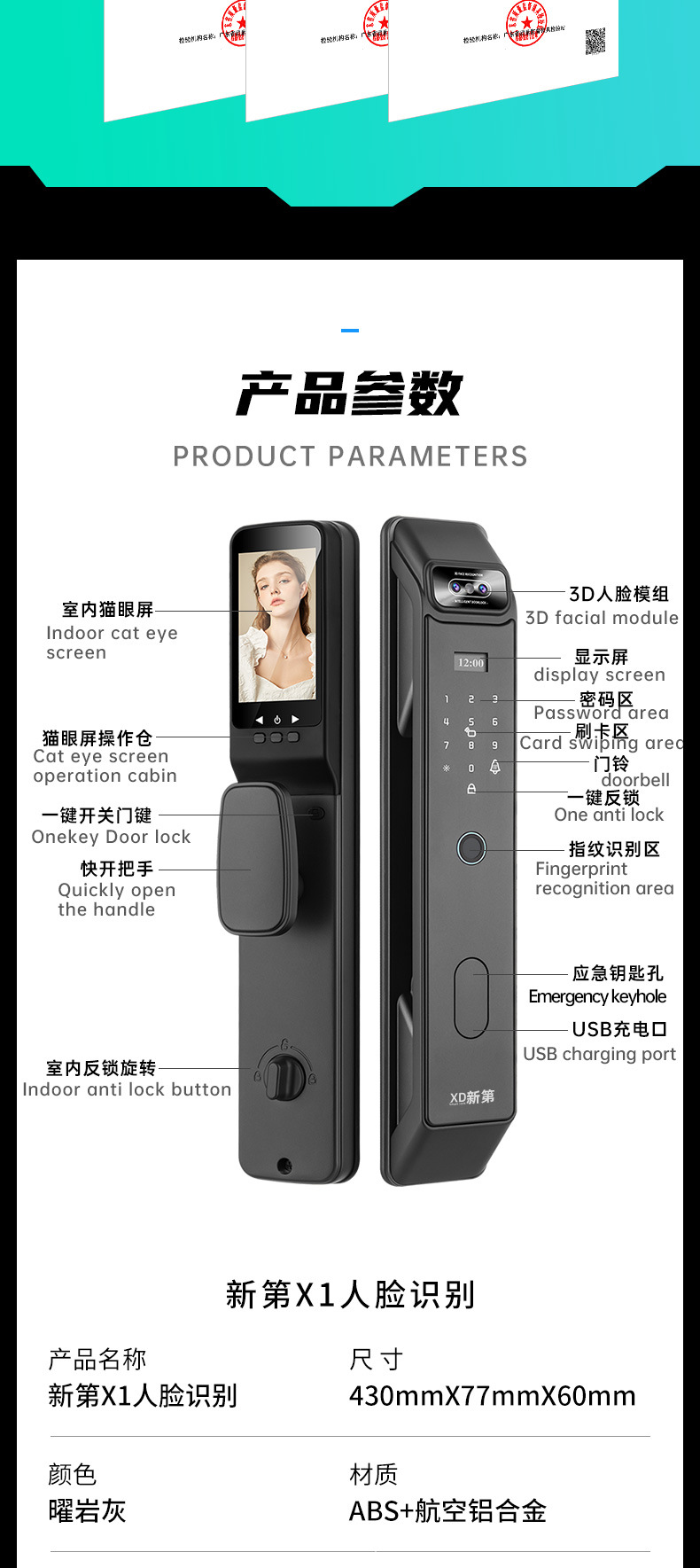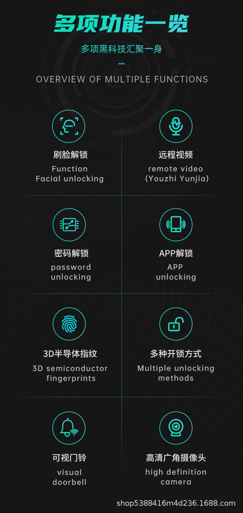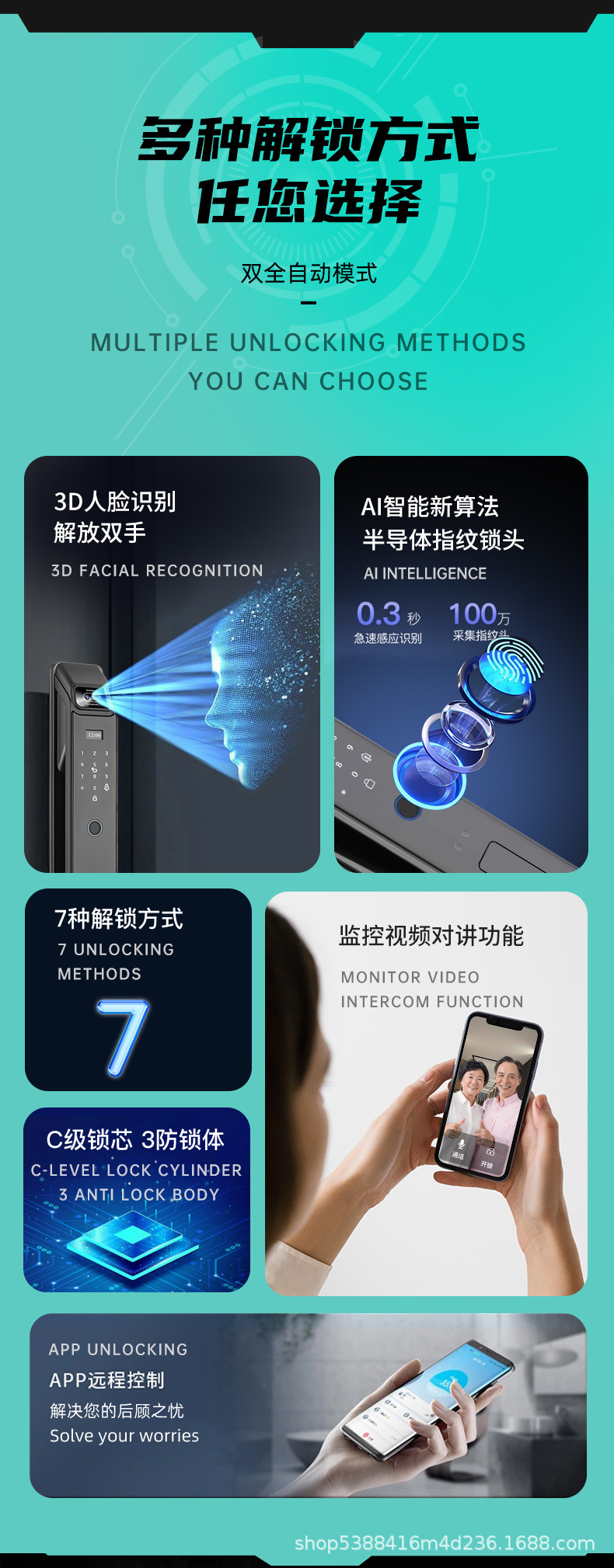 EstiloHuella digital,Contraseña,Con llave,Ojo visual de gato,Reconocimiento facial,Desbloqueo remoto