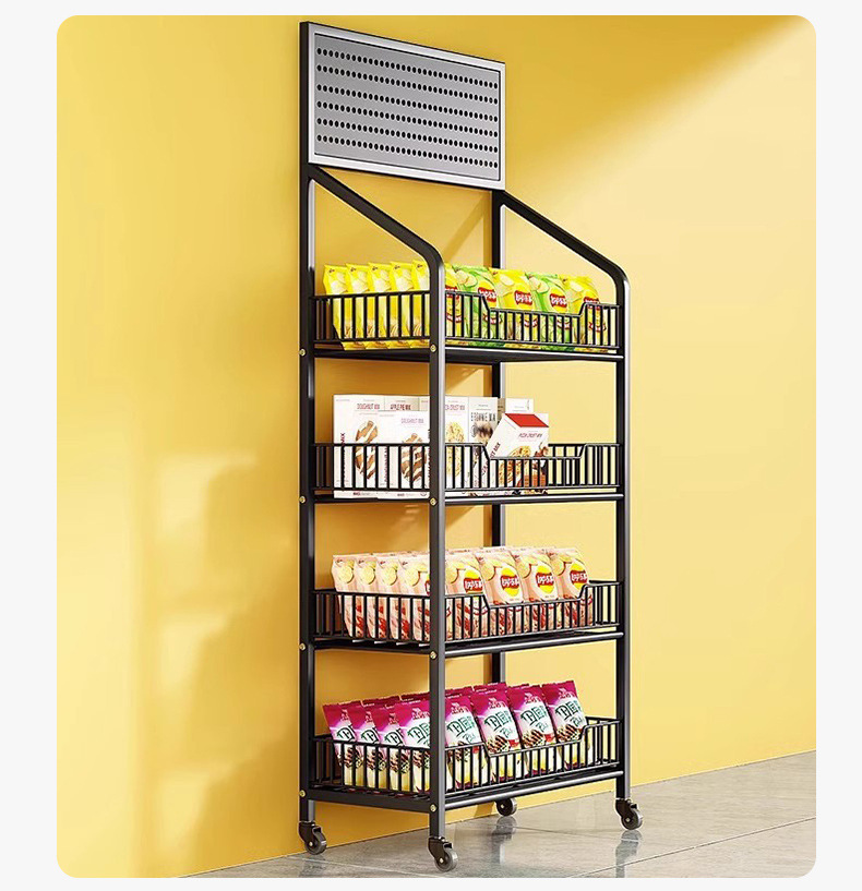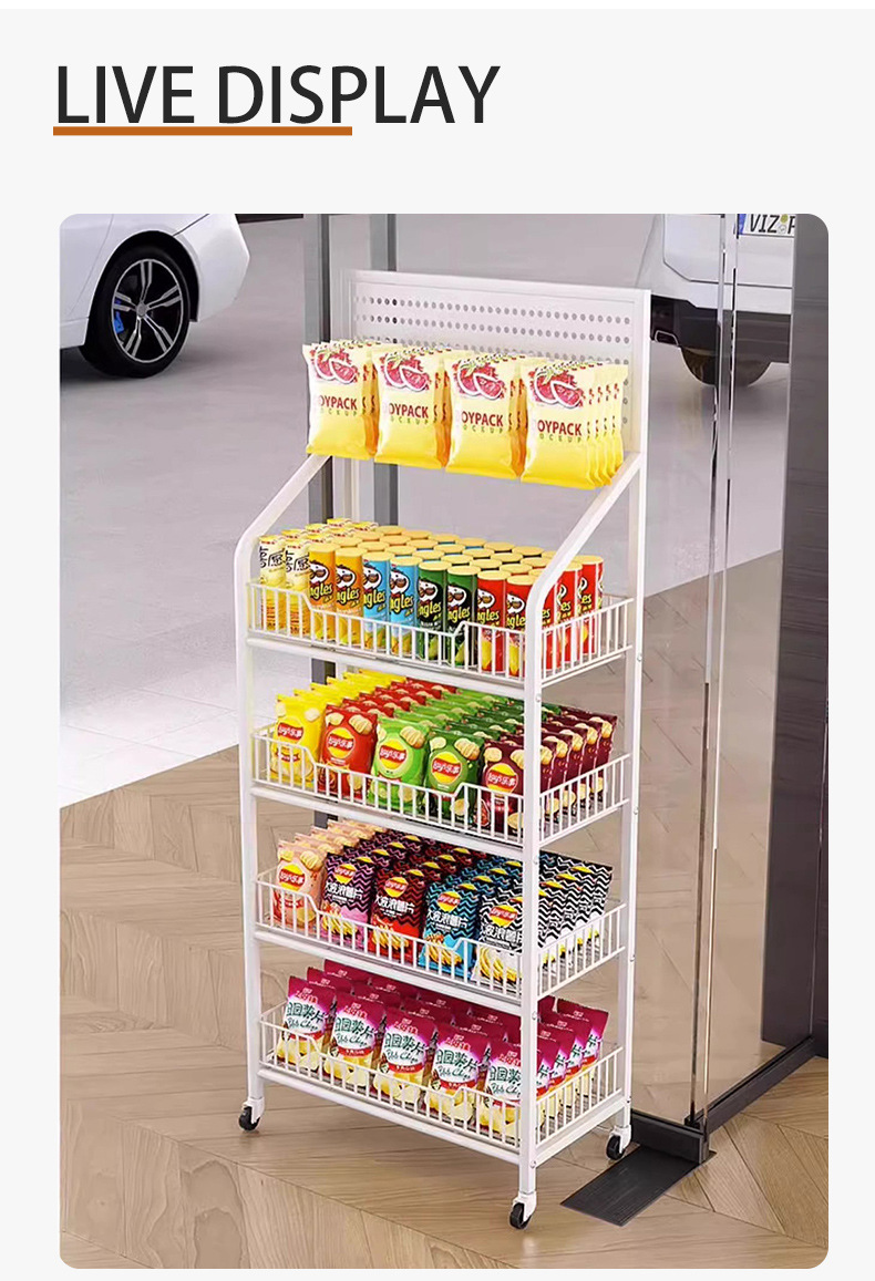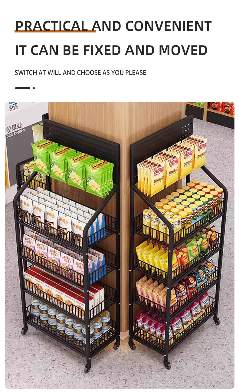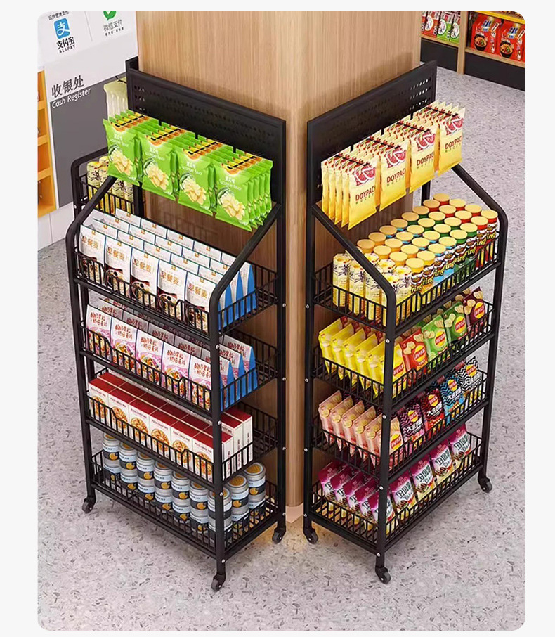 Estante metálico móvil para supermercado, bebidas y snacks, ideal para tiendas y mostradores.
