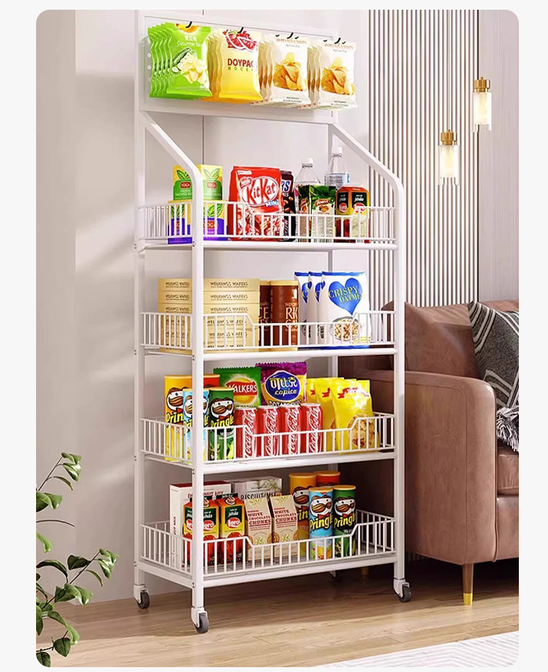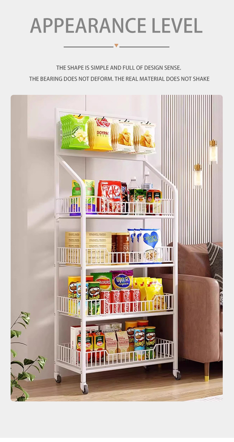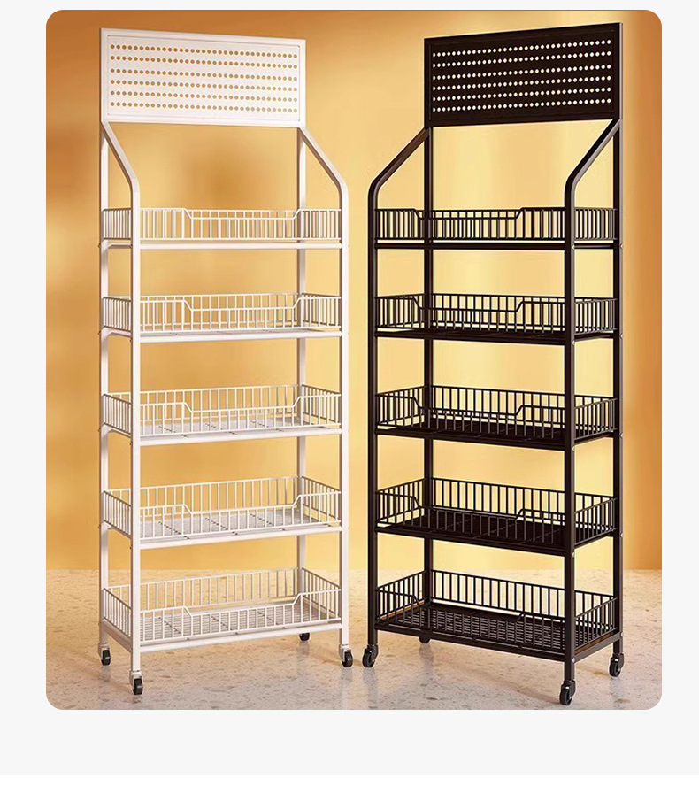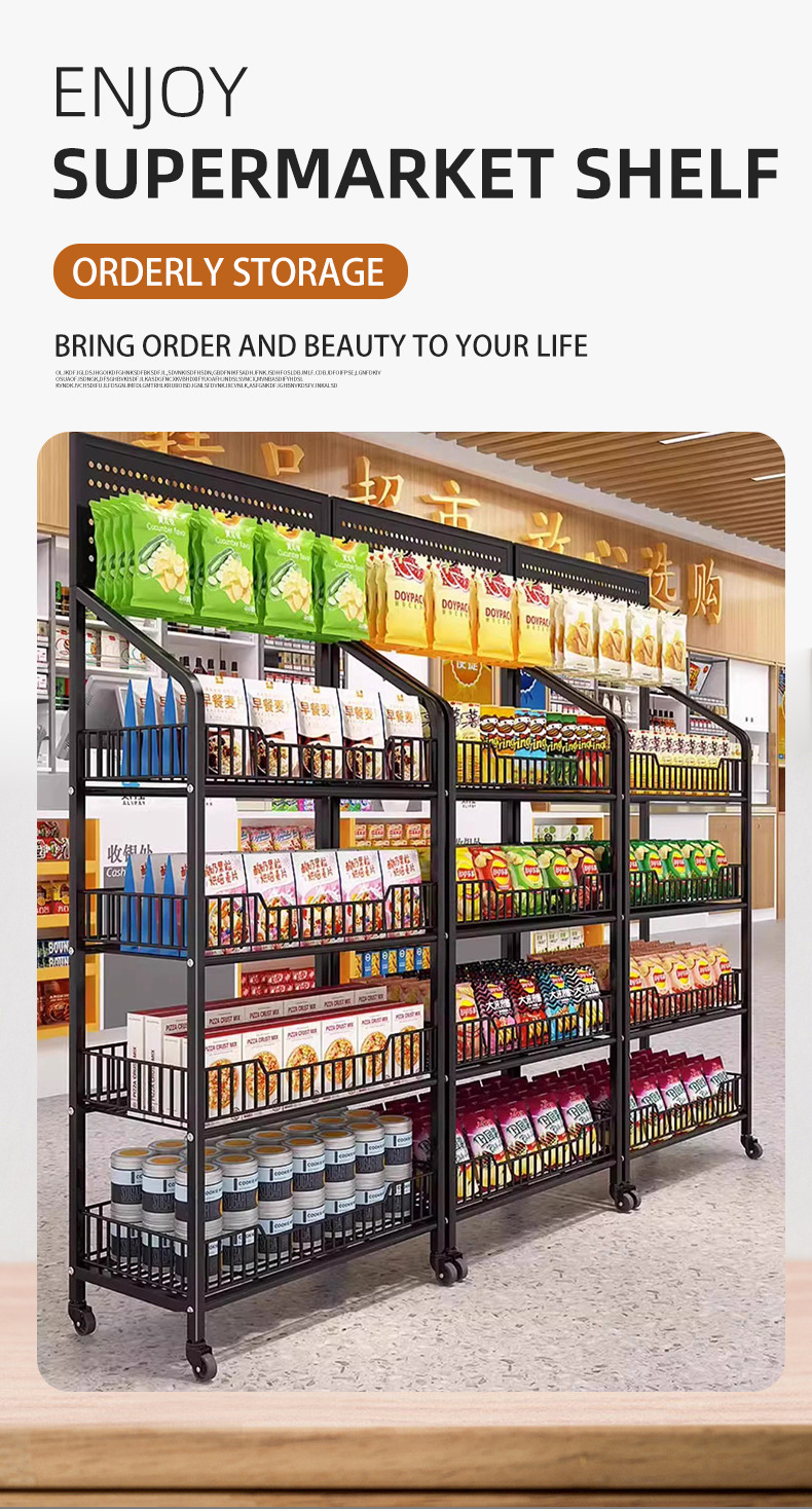 Estante metálico móvil para supermercado, bebidas y snacks, ideal para tiendas y mostradores.