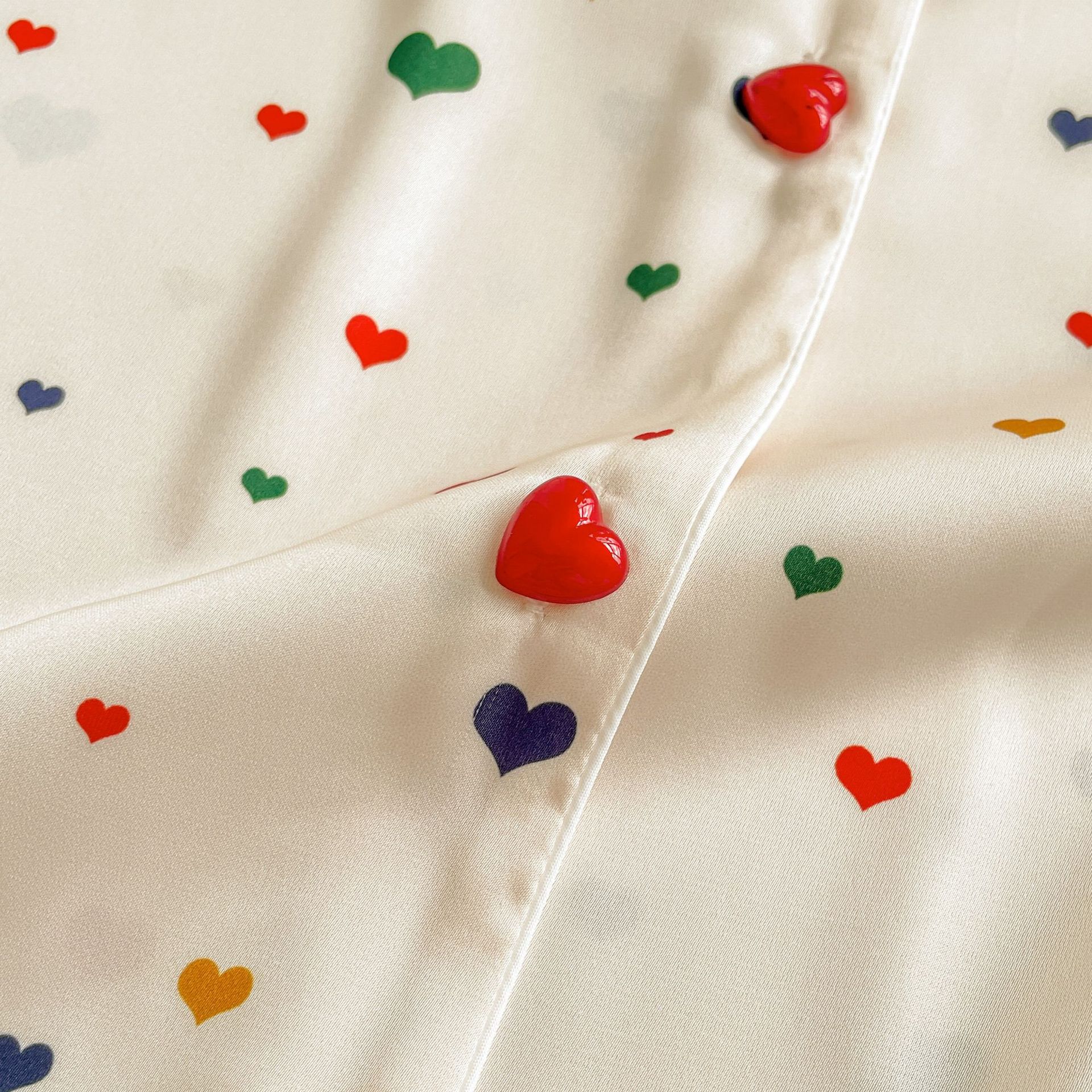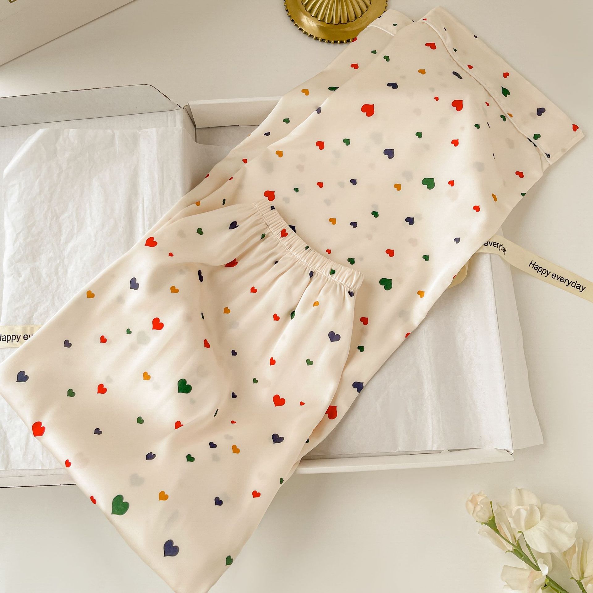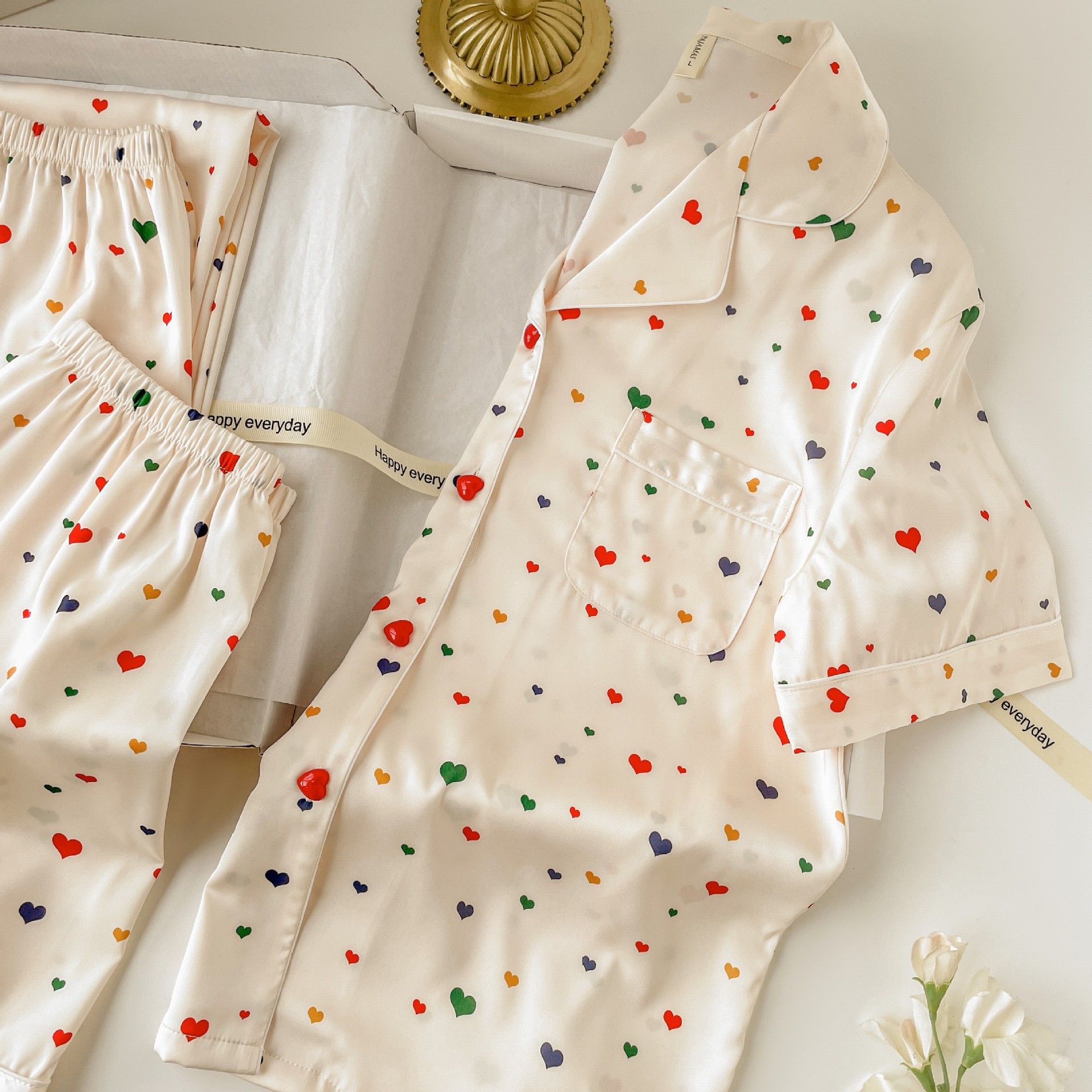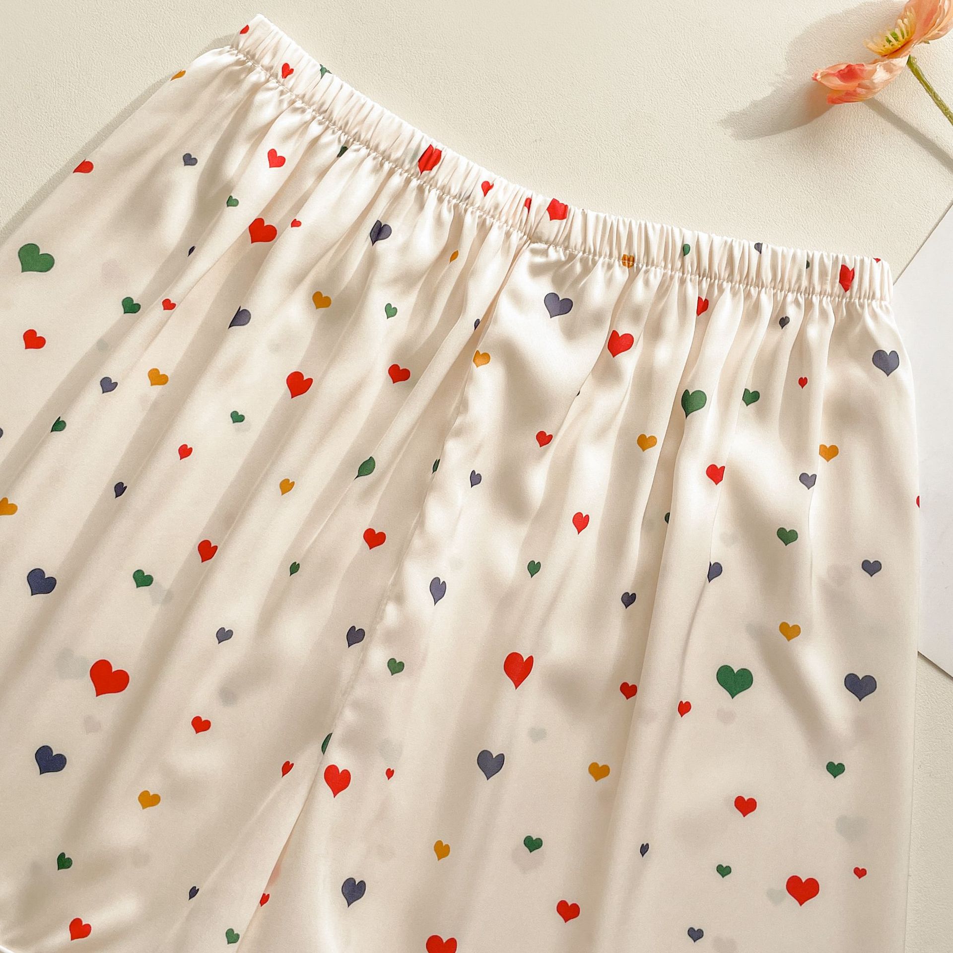 Pijama de seda fría con estampado de corazones, set de 3 piezas, ligero para verano
