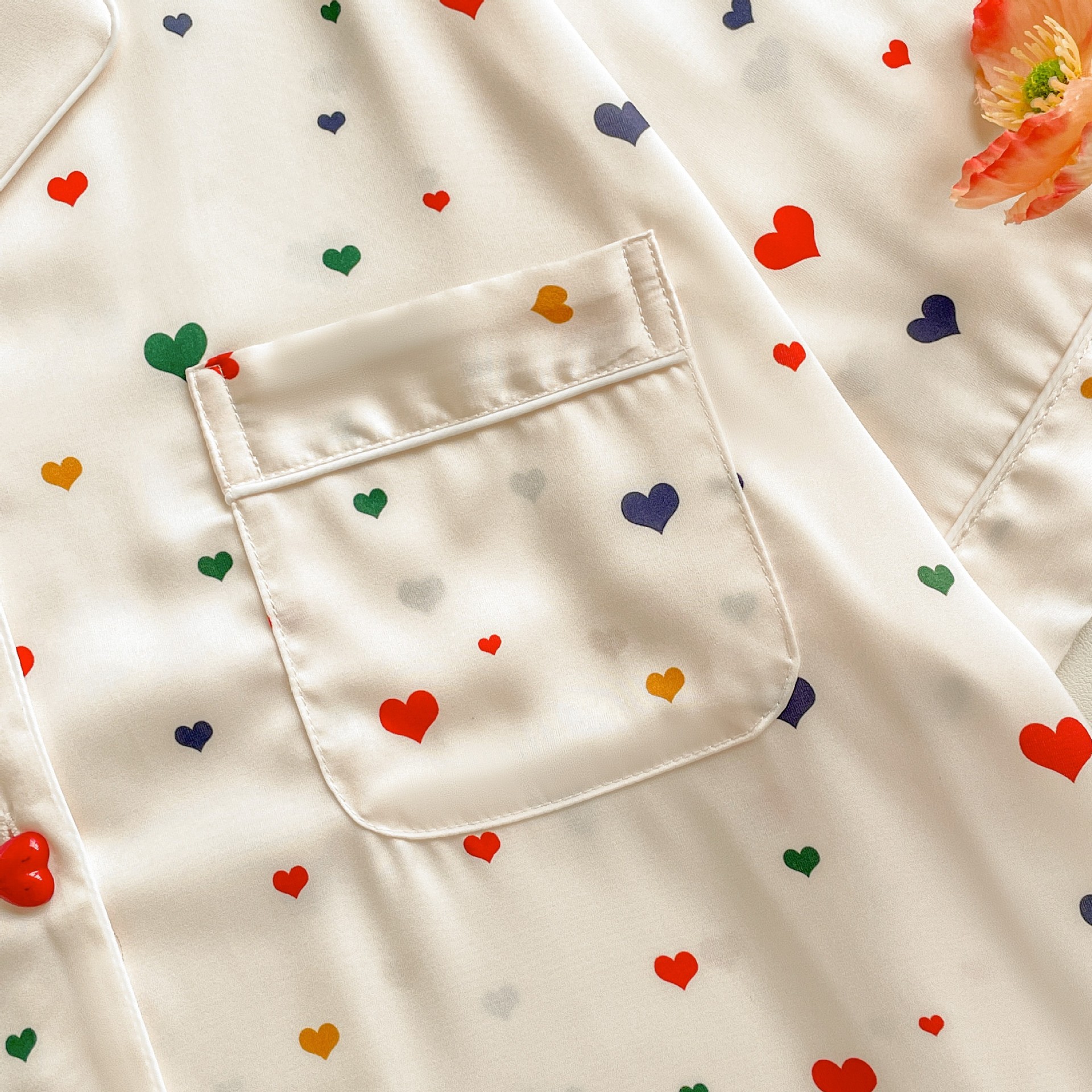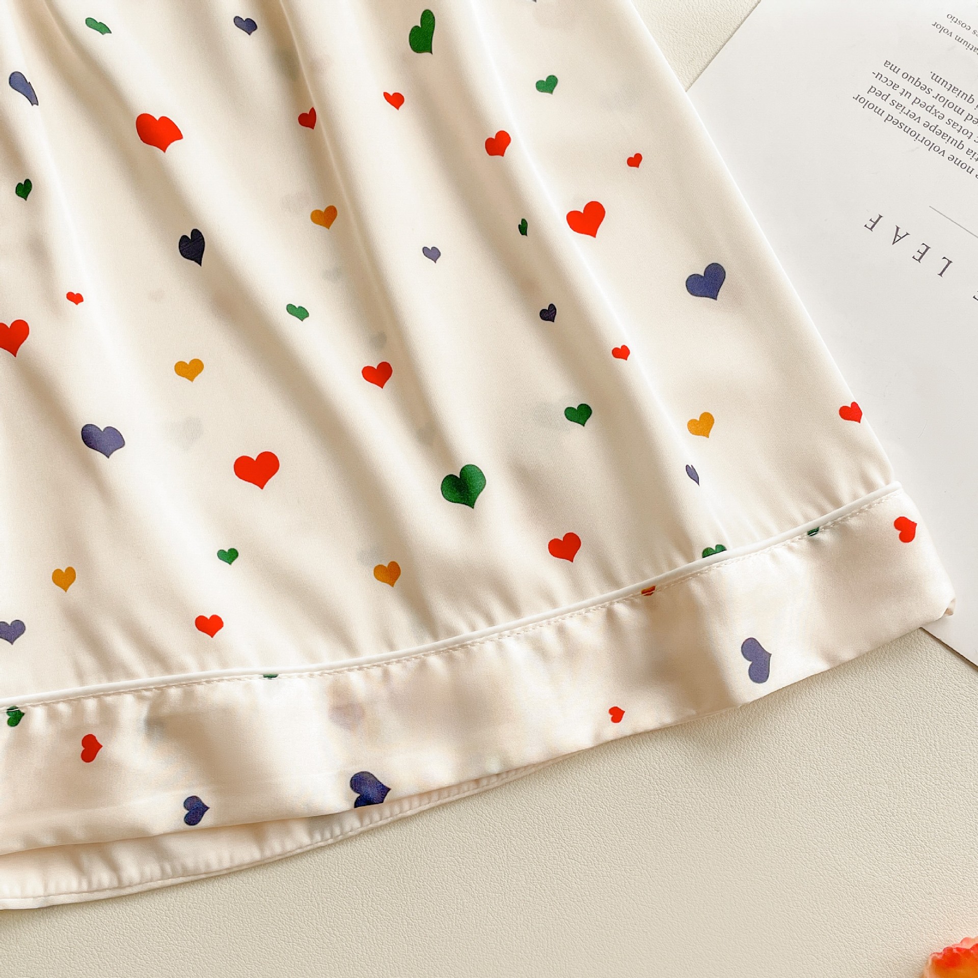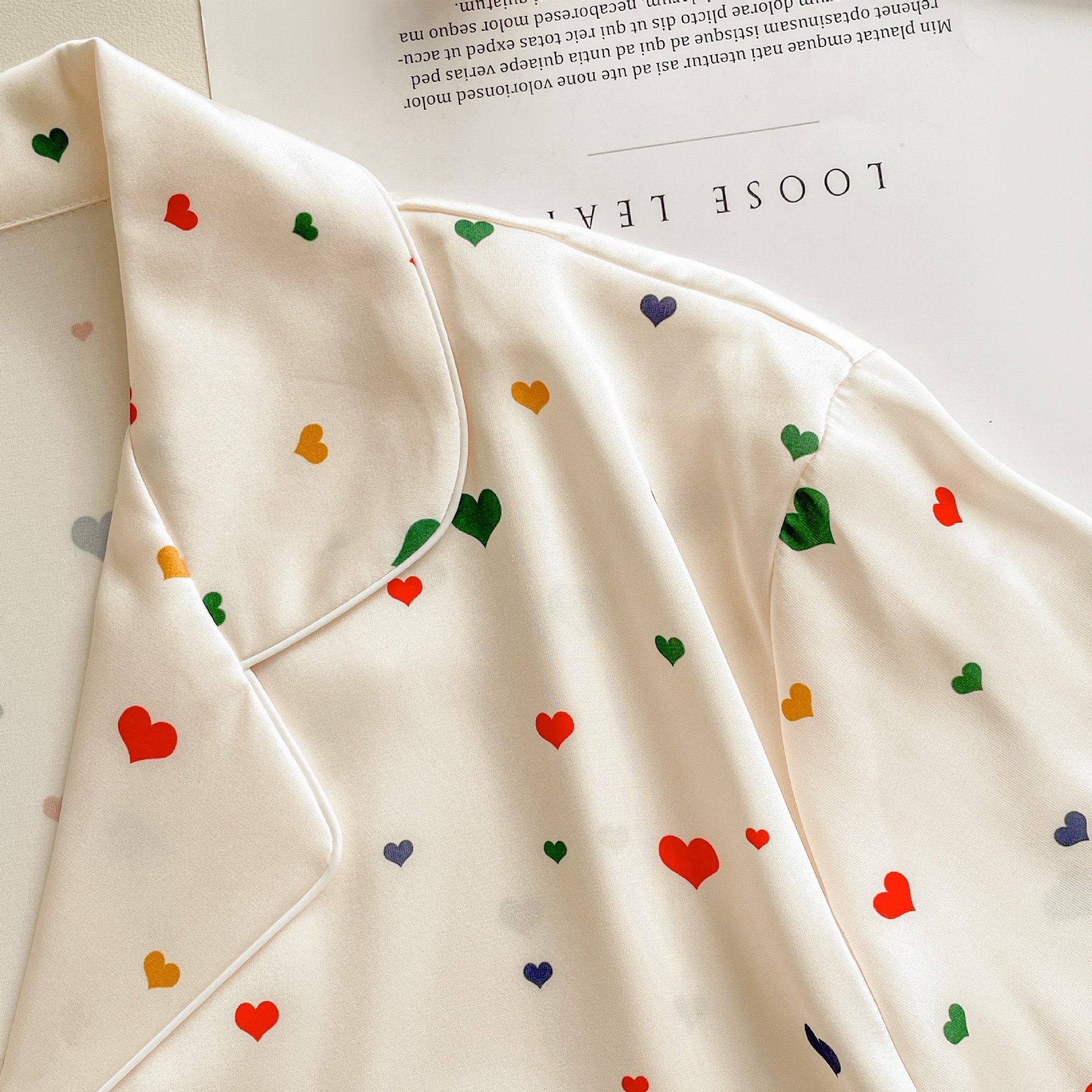 Pijama de seda fría con estampado de corazones, set de 3 piezas, ligero para verano