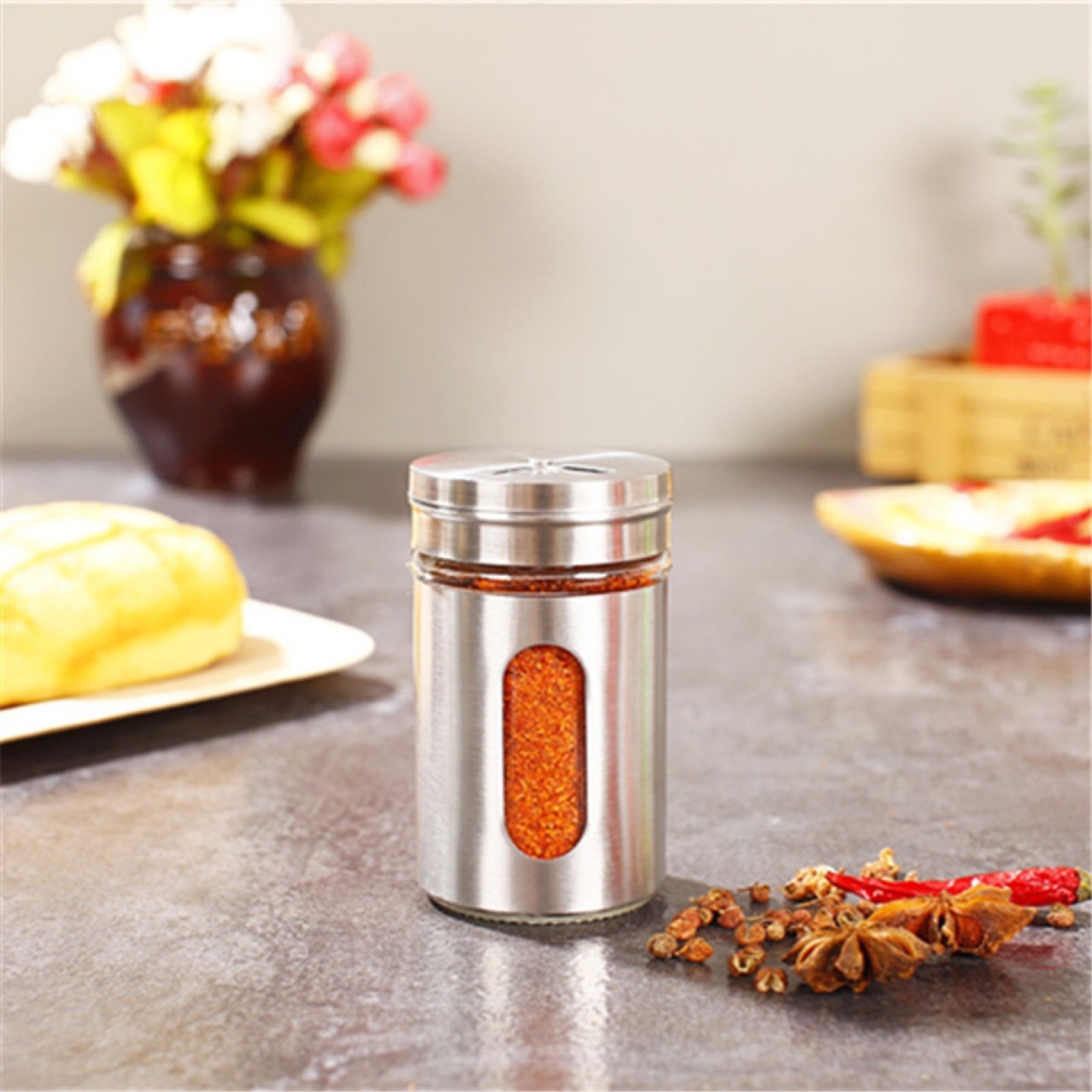 Botella de condimentos de acero inoxidable y vidrio, tamaño ajustable para sal, pimienta o barbacoa