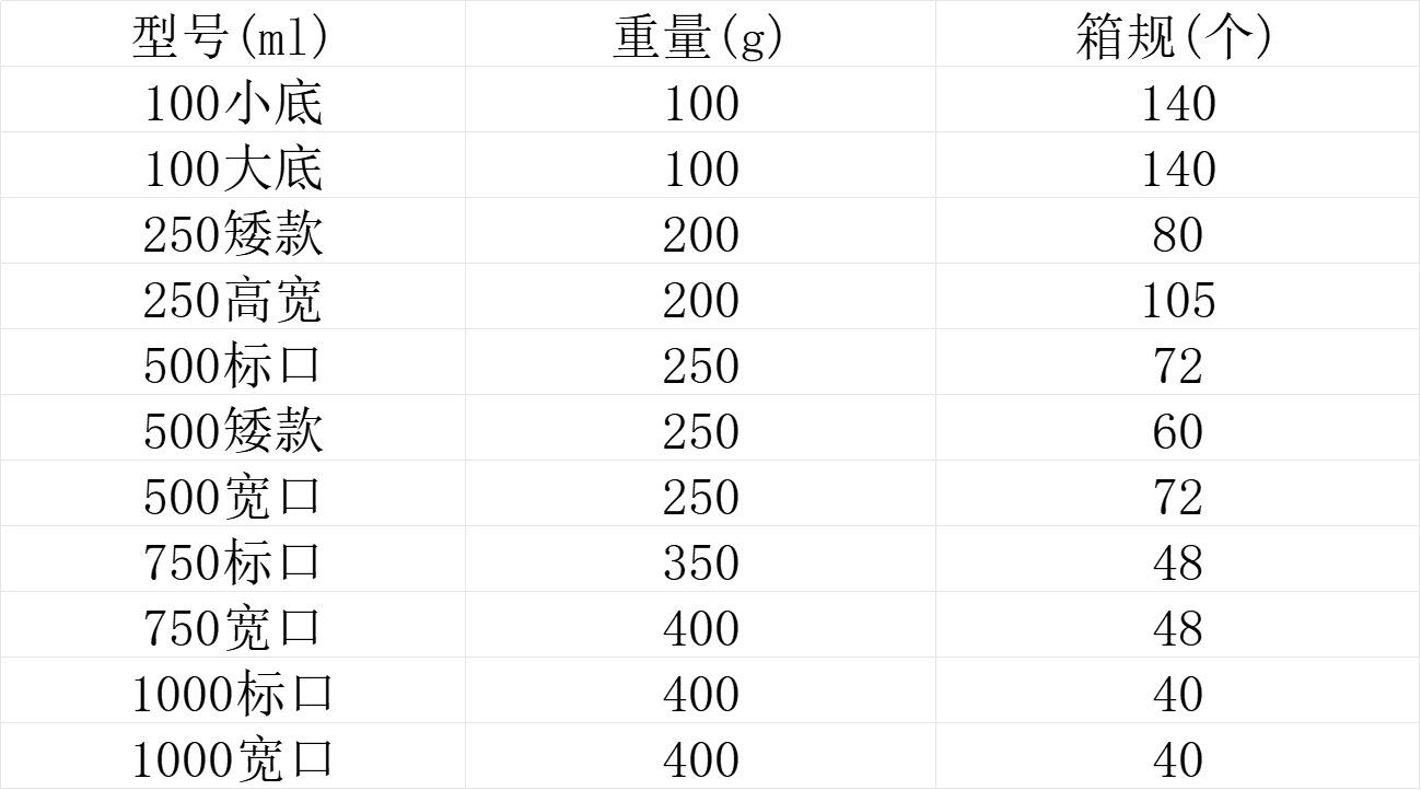 | Especificaciones | 100mL botella de carta de boca estándar de fondo pequeño,100mL botella de letra de boca estándar de fondo grande,Botella estándar de la letra de la boca 250 ml,Botella estándar de la letra de la boca 500ml,750 ml botella de carta de boca estándar,1000ml botella de carta de boca estándar,250 ml de boca ancha corta carta botella,Botella ancha corta de la letra de la boca 500 ml,Botella ancha de la letra de la boca 500ml,Botella de boca ancha de 730 ml,Botella ancha de la letra de la boca 1000ml,Botella ancha de la letra de la boca 2000ml |
