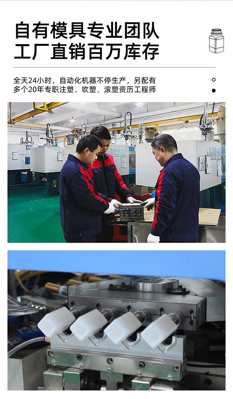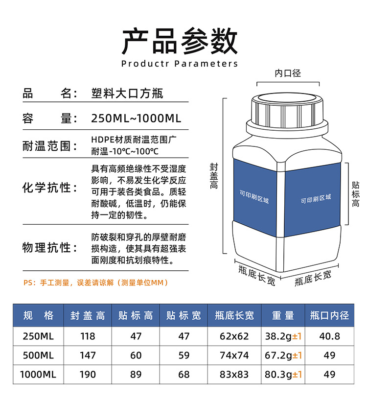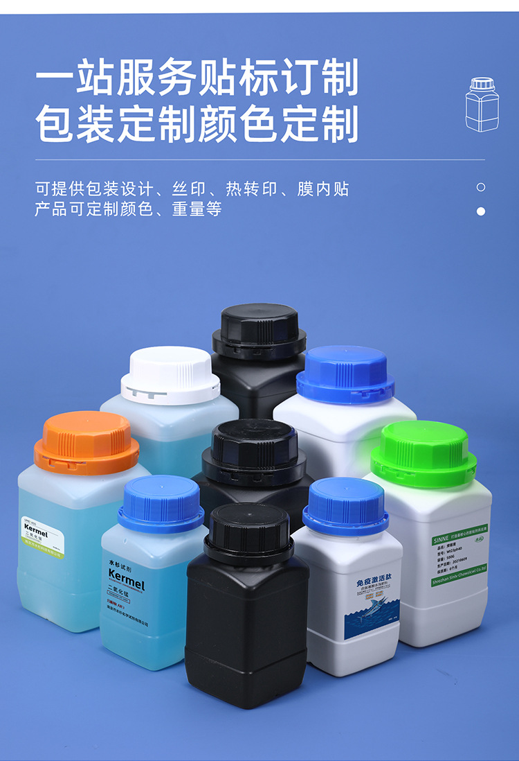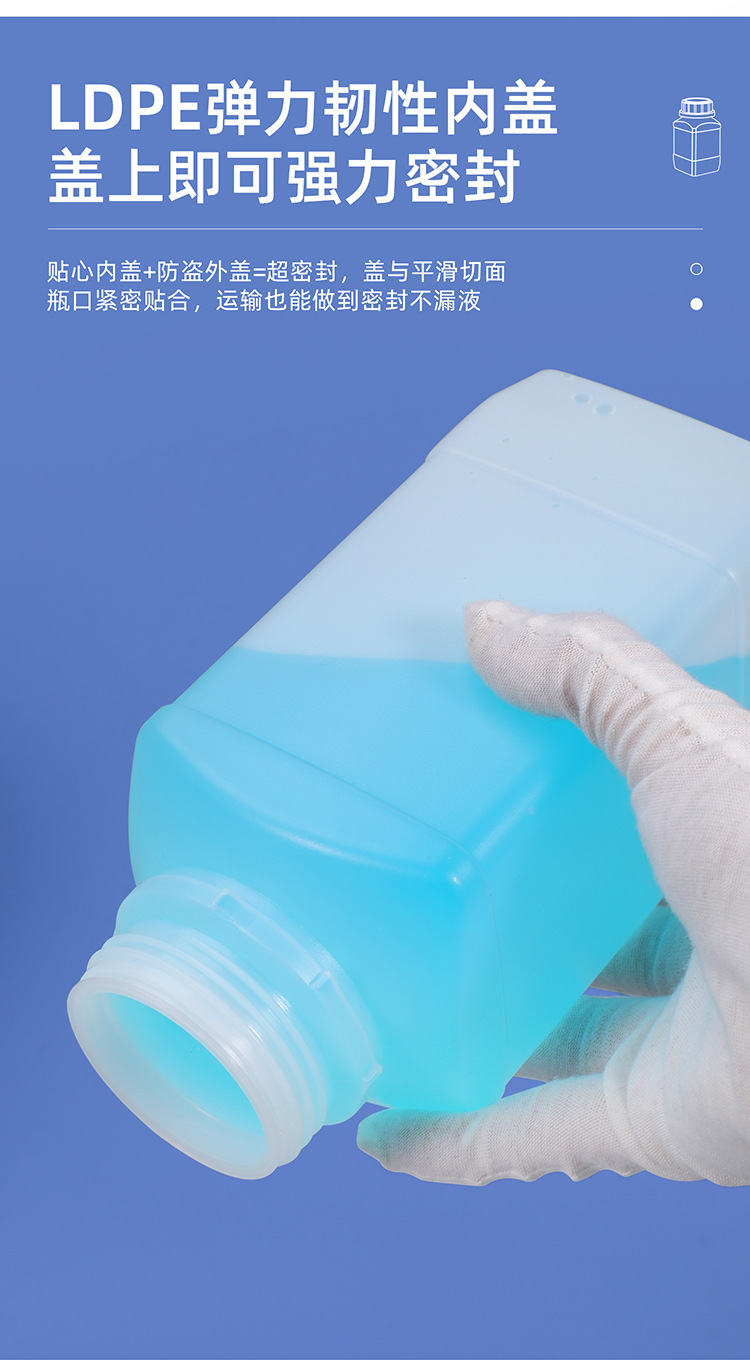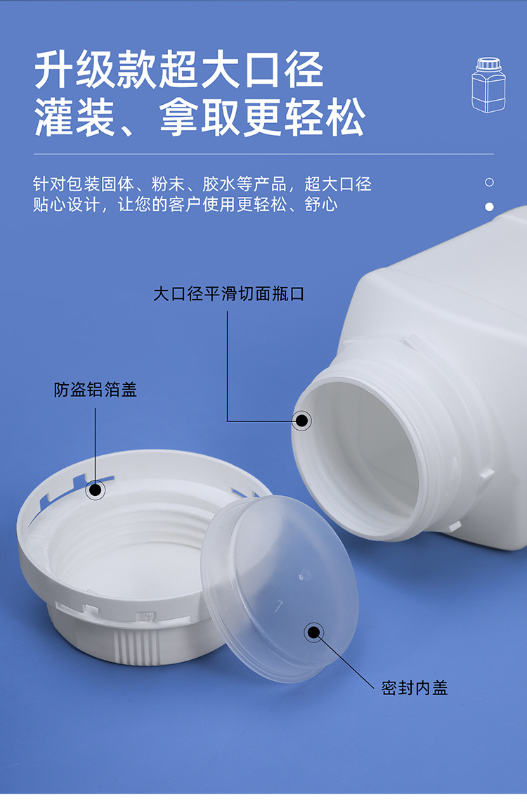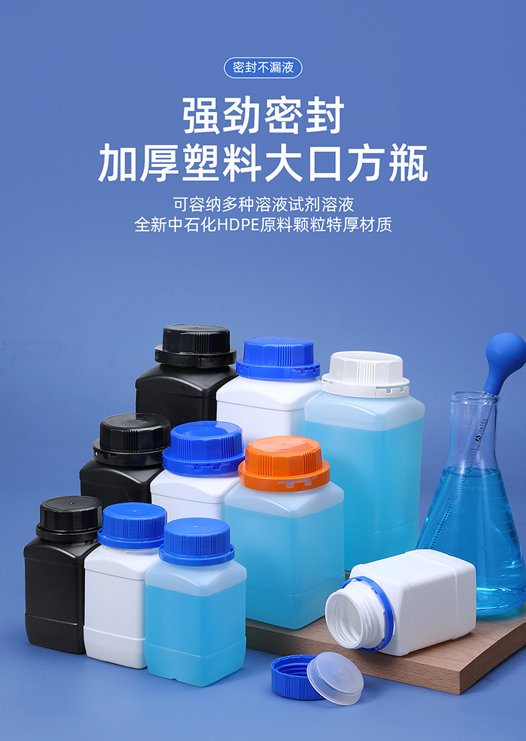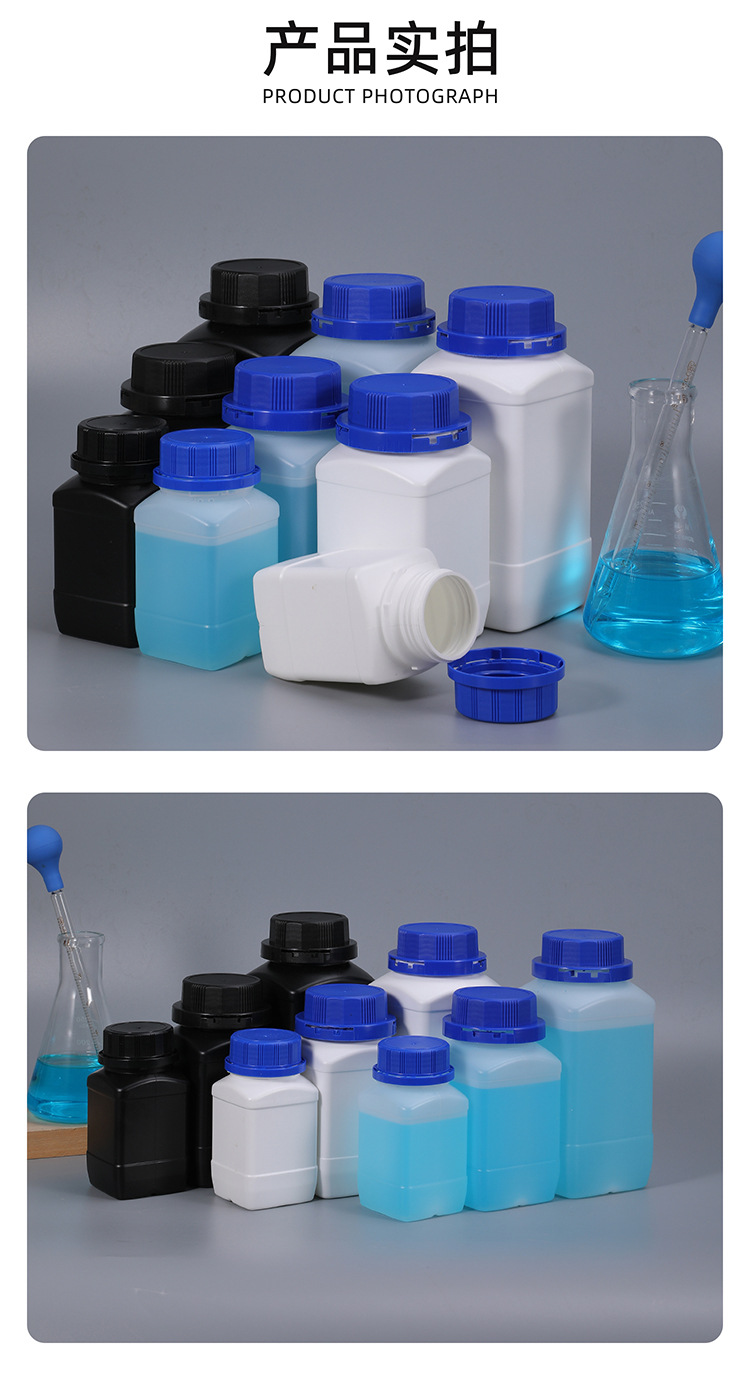 Botella cuadrada de plástico HDPE blanca, frasco químico de boca ancha, envase para muestras o reactivos