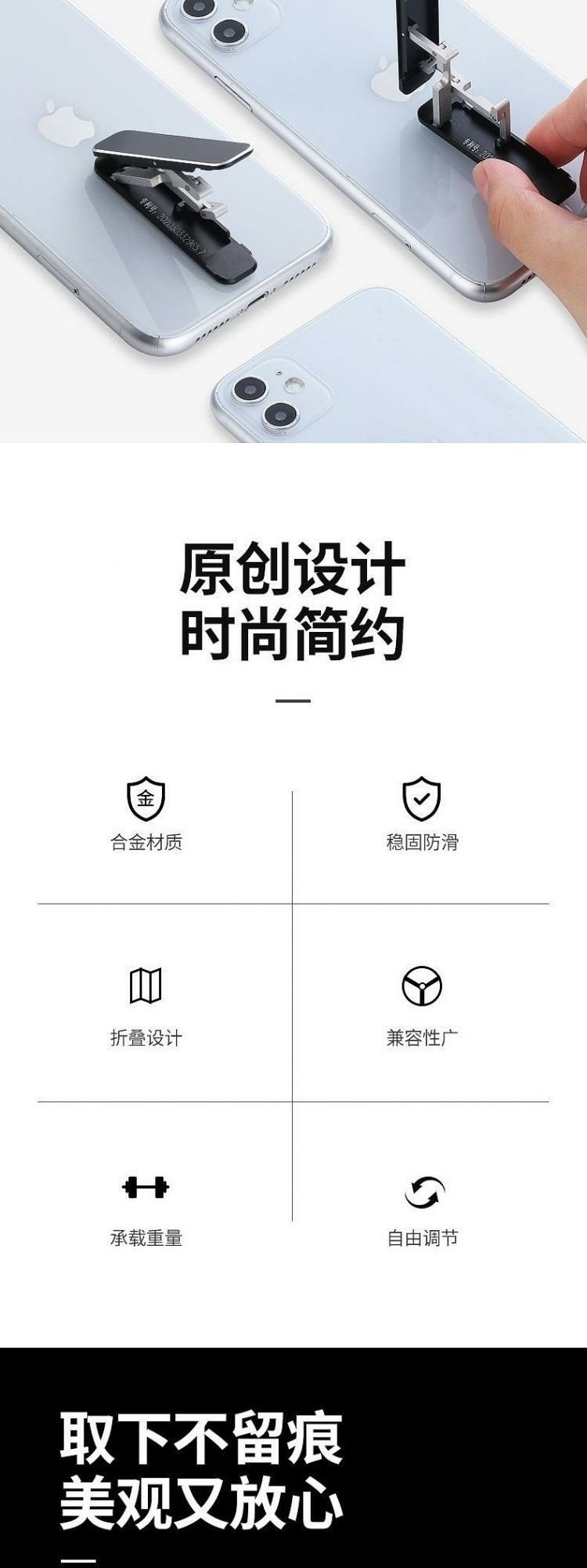 Soporte para teléfono móvil ultrafino, pegatina trasera pegajosa, carcasa para teléfono móvil, aleación de aluminio horizontal y vertical multifuncional, mini soporte invisible portátil