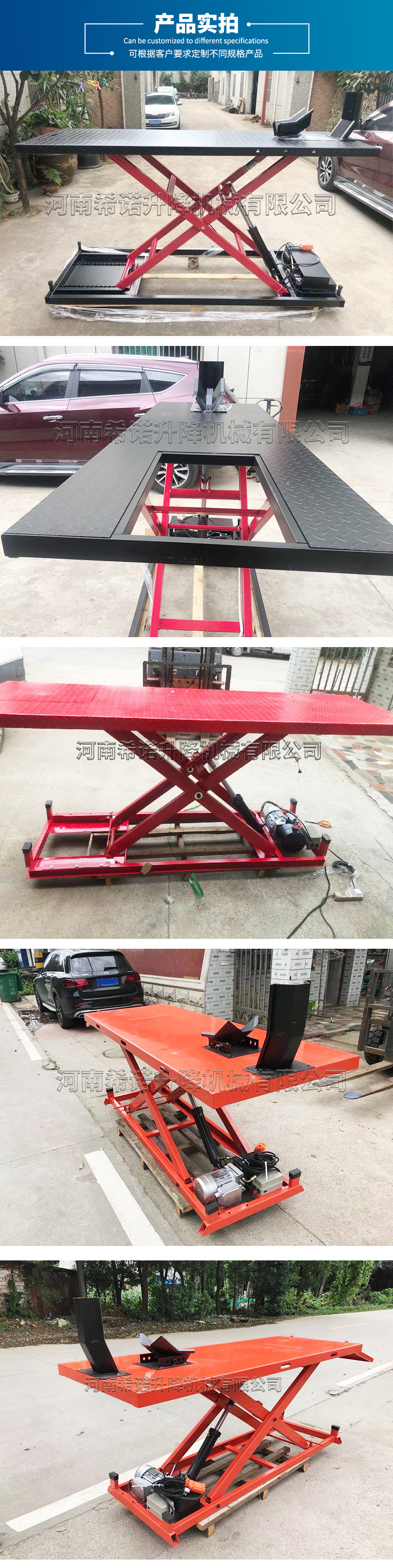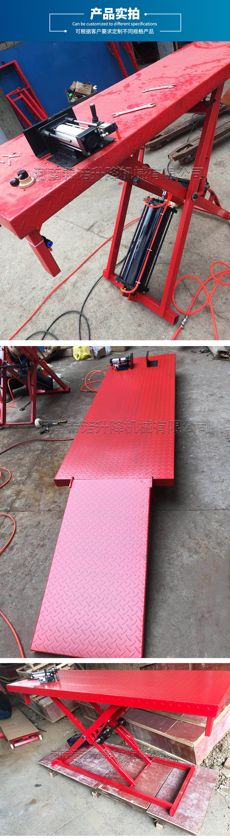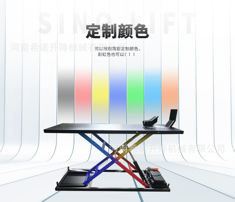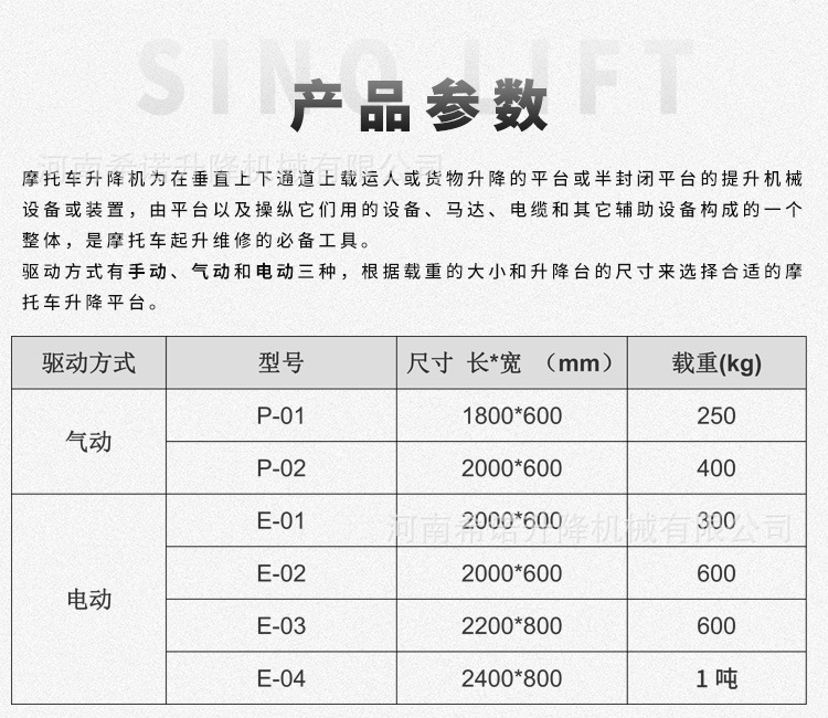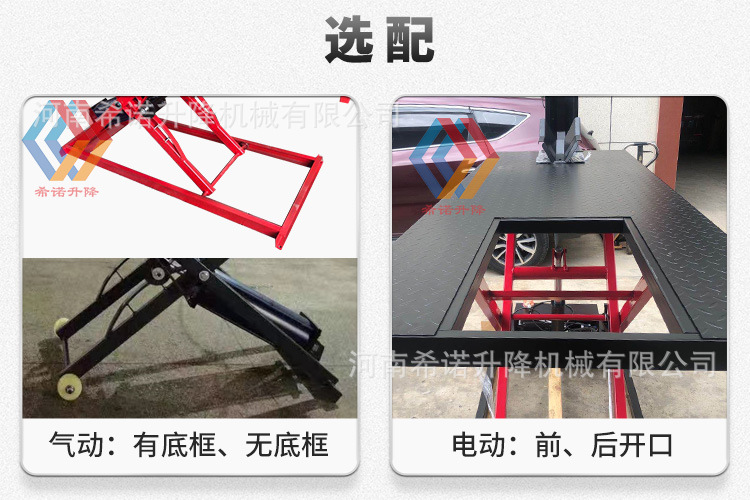 | Modelo | Manual - 250kg - 2000 * 500mm, neumático - 250kg - 1800 * 600mm, neumático - 400kg - 2000 * 600mm (sin marco inferior), neumático - 400kg - 2000 * 600mm, neumático - 400kg - 2000 * 800mm, eléctrico - 300kg - 2000 * 600mm, eléctrico - 600kg - 2200 * 800mm, eléctrico - 1 tonelada - 2200 * 800mm |