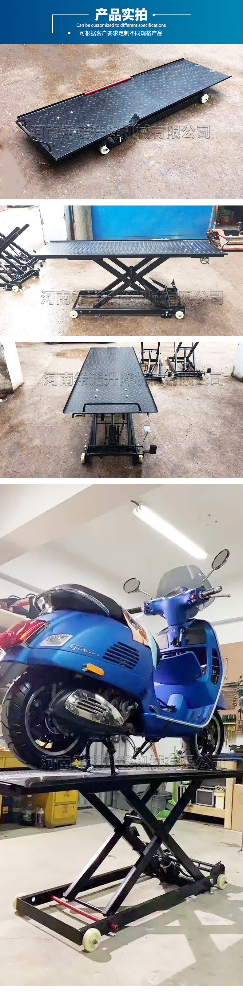 Plataforma elevadora hidráulica para motos 300–600 kg, equipo profesional de mantenimiento